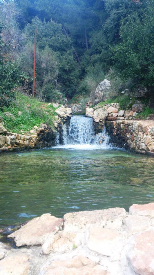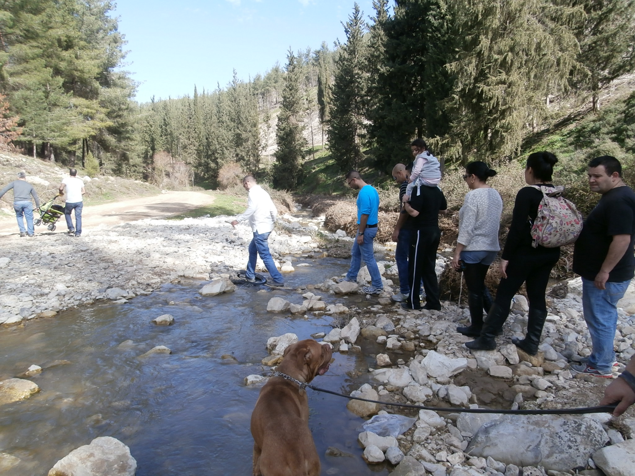 Вскоре мы достигли места, где ручей Гуш Халав вливается в нахаль Дишон, и повернули направо на «красную» тропу (на ней есть также метки швиль Исраель). Здесь сразу почувствовалась популярность этого красивого места. Много людей, машин и даже, чтобы перейти речку, нужно стоять в очереди.