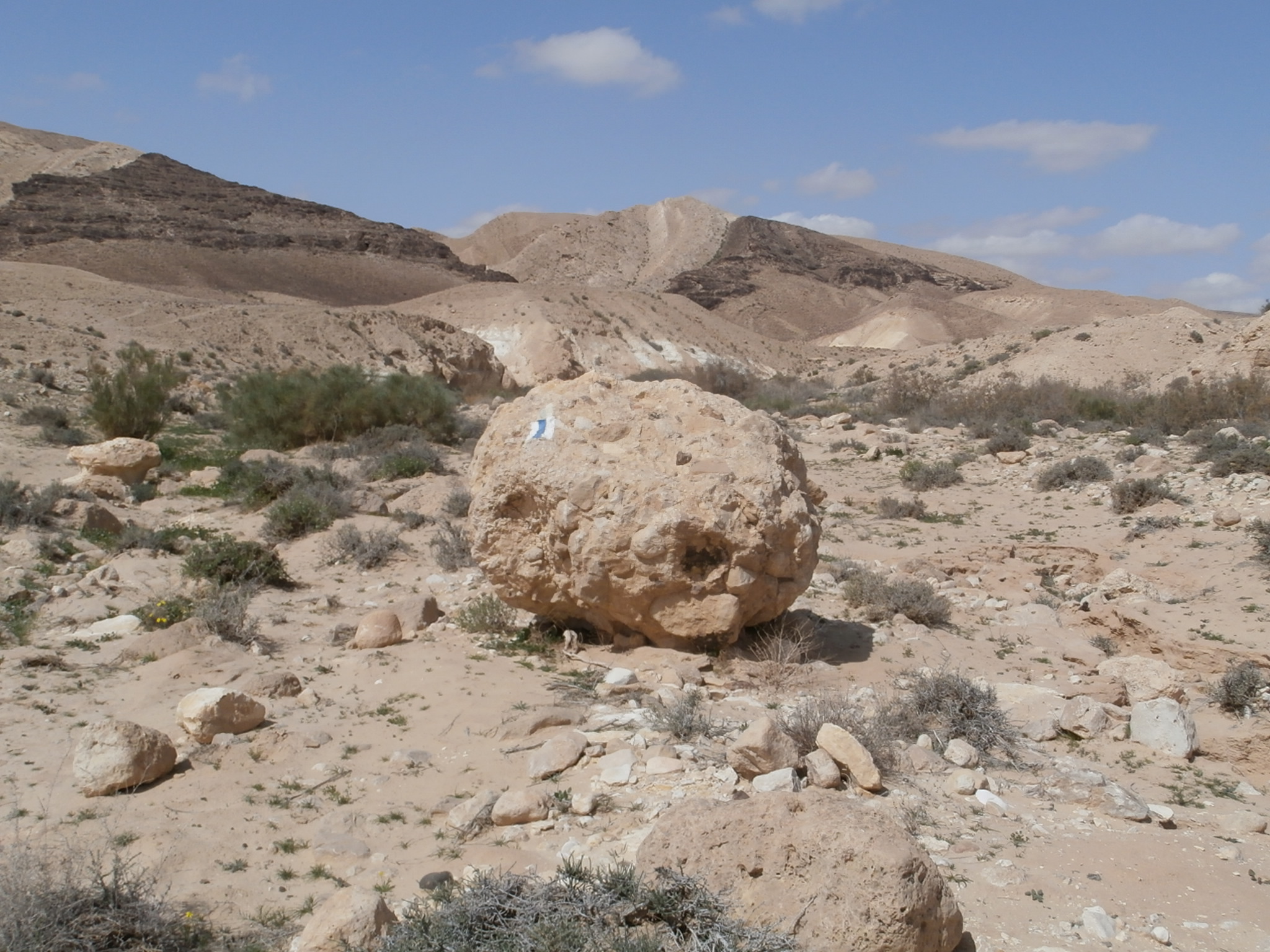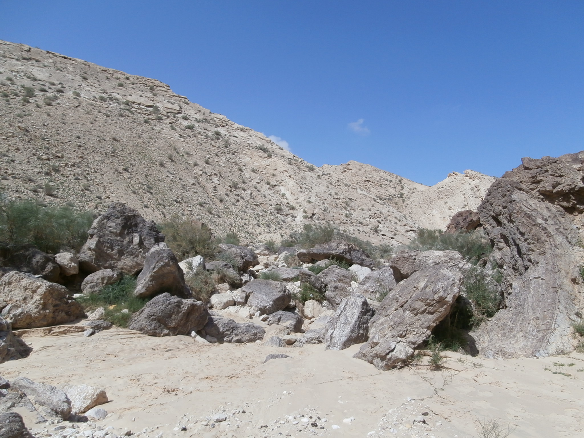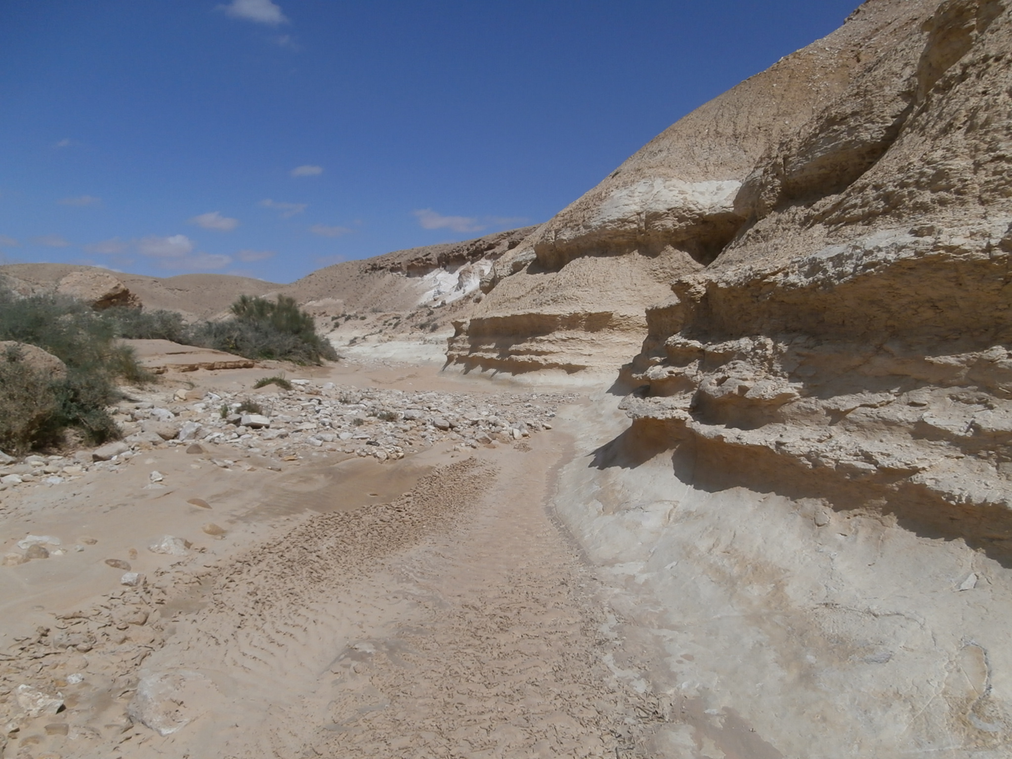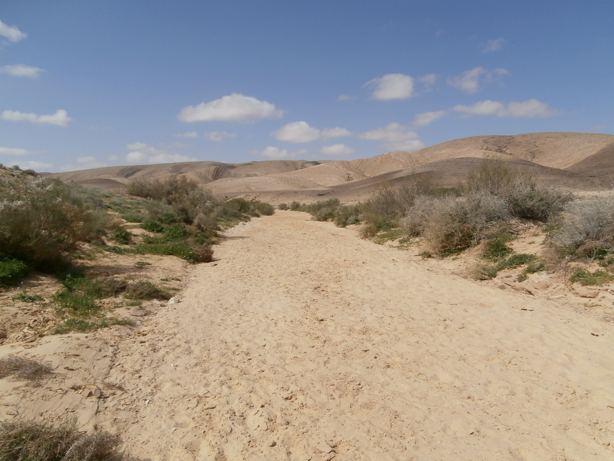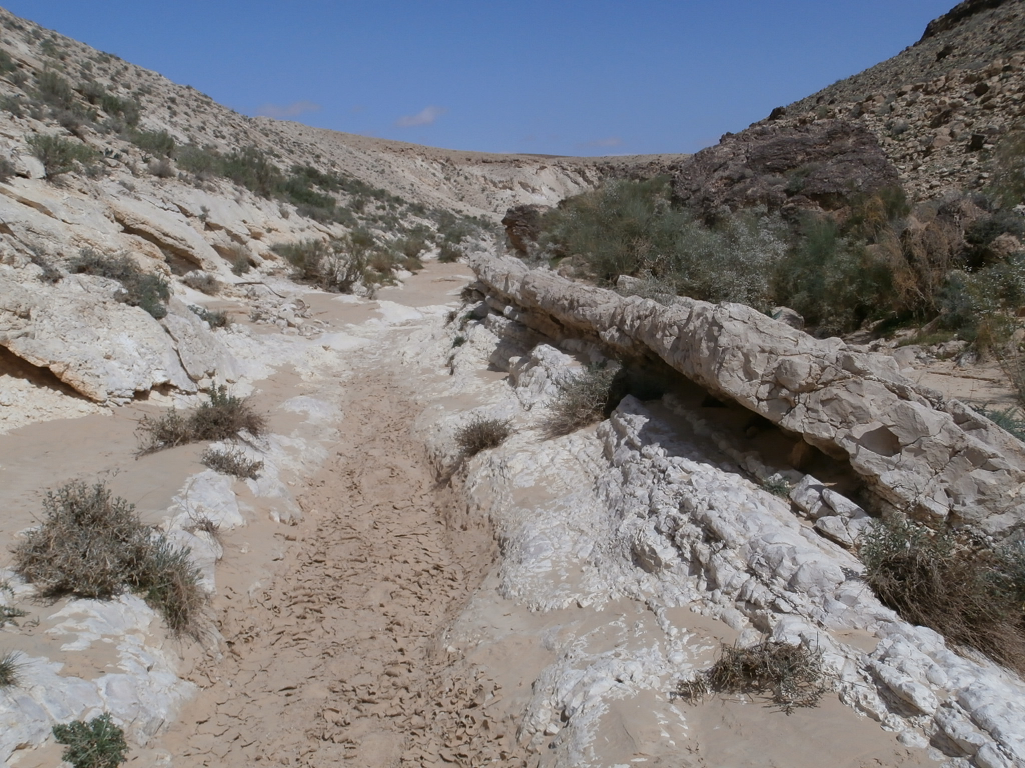 Встретилась на пути и семейка скалистых даманов. Пустились наутек, почуяв мое приближение. Пугливые зверюшки. Вскоре, на перекрестке троп, зеленая тропа уходит налево вверх. По ней можно вернуться назад в Мамшит, тем самым совершив приятный семейный кольцевой маршрут часа на полтора. По этой тропе я буду завершать свой поход вечером. А пока продолжаю по красной, а затем поворачиваю на синюю, которая проходит по руслу ручья Мамшит. Пейзаж здесь изменился. Каньон остался позади. Нахаль стал мелким, открытым и широким, а его русло — полностью песчанным.