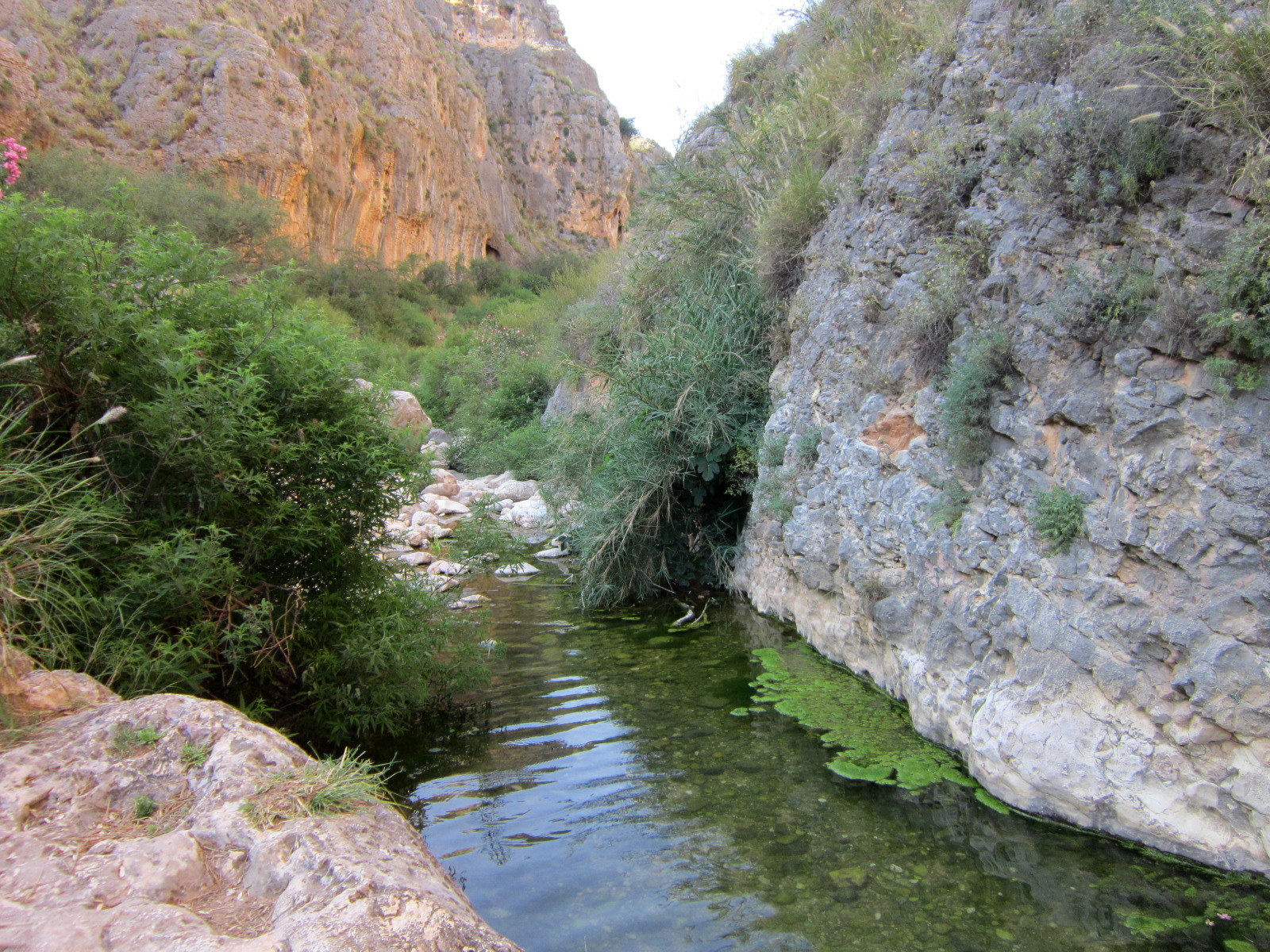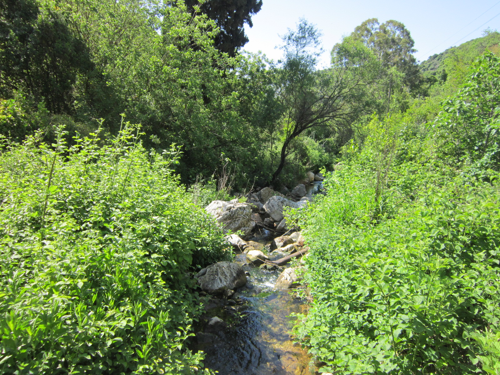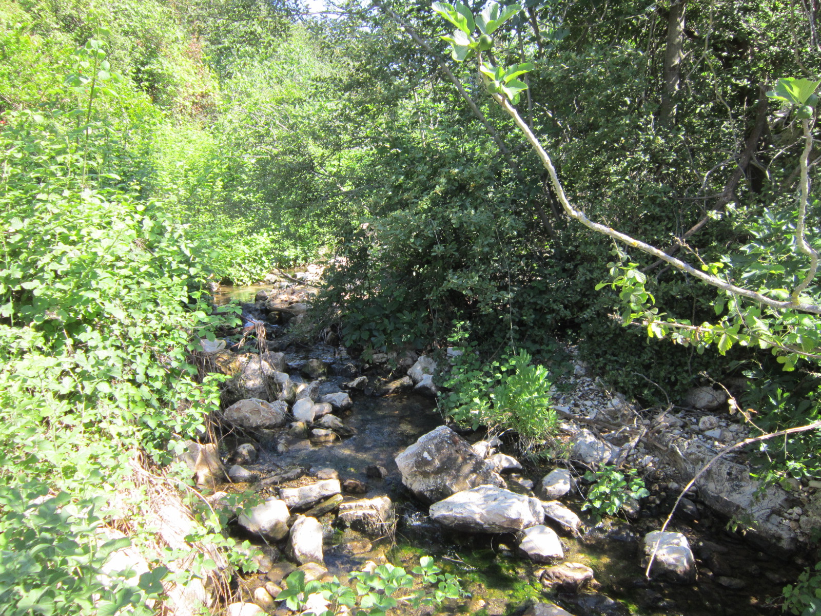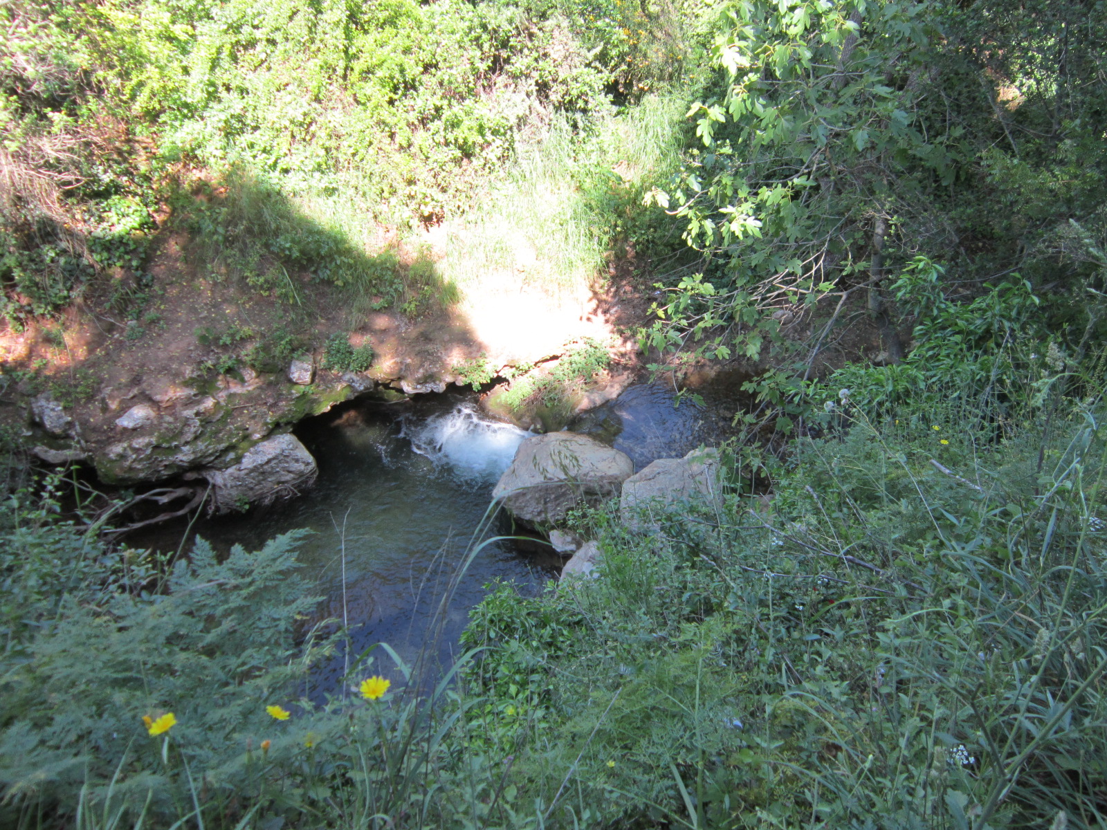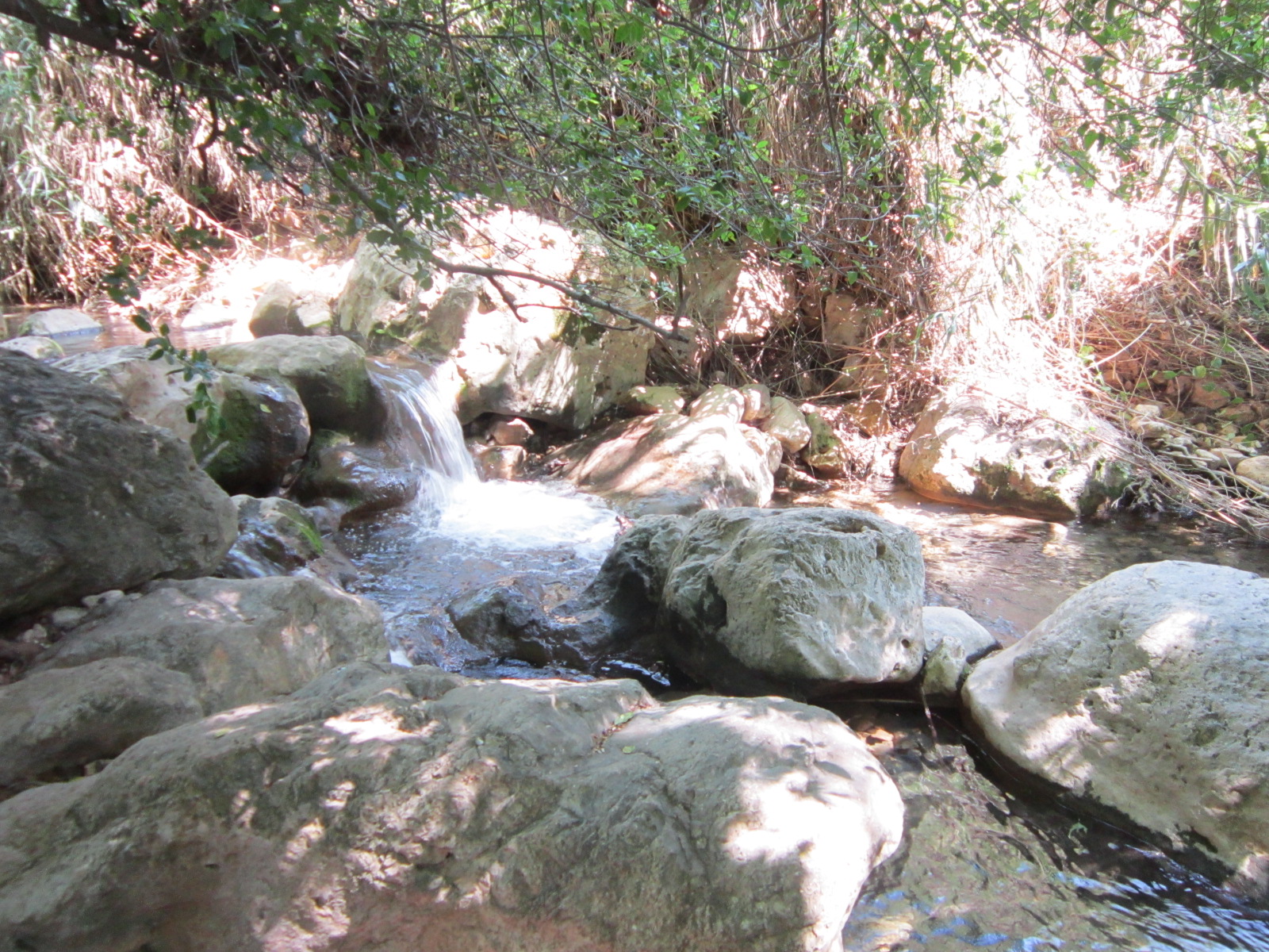 Сначала русло было сухое, но потом появилась вода, и послышалось журчание маленьких водопадов. Эйн Поэм. Очаровательно. Но к воде не подойти — колючие заросли и крутой склон.