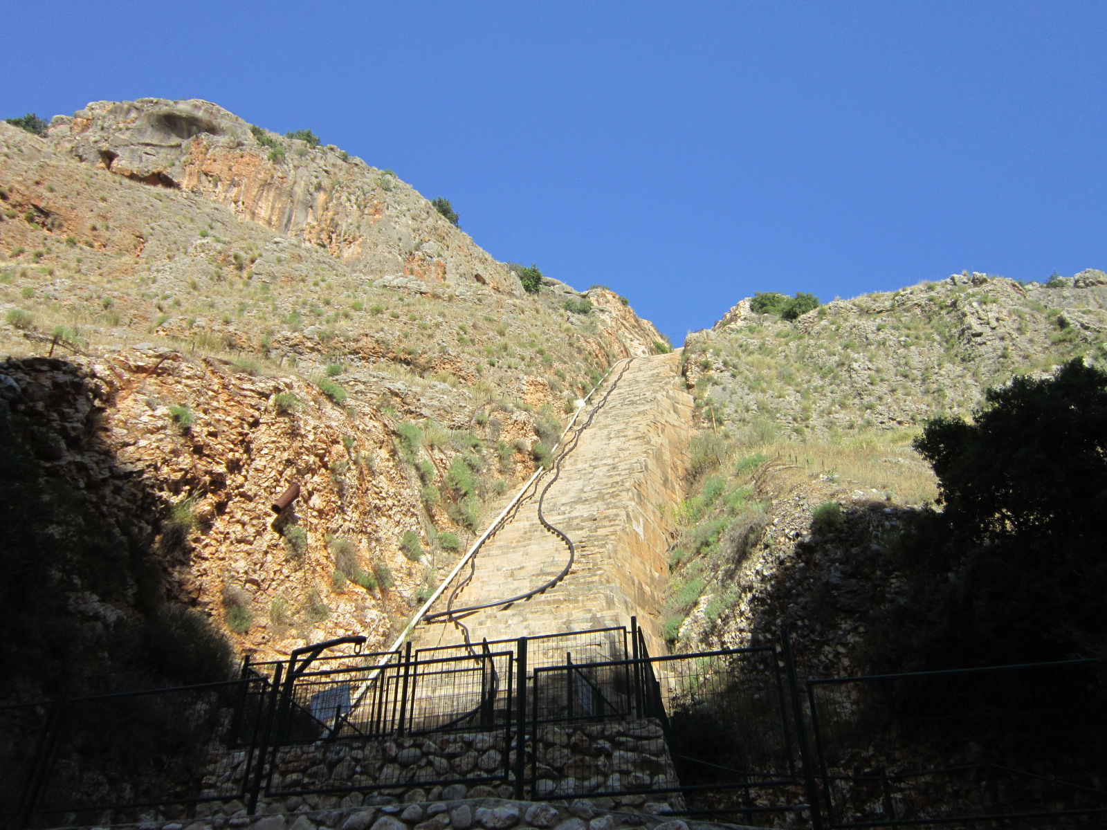 Так, не переставая любоватья скалами, изрезанными гротами и пещерами, мы дошли до места, которое называется «Сифон». Там уже сидела и отдыхала группа «Пузо» . Сифон — это часть всеизраильского водного канала (Мовиль Арци), текущего по открытому искуссвеному руслу. В ручьях на его пути были построены сифоны, которые действуют, как сообщающиеся сосуды: вода спускается по закрытой трубе на востоке русла, а затем поднимается на западе и продолжает течь дальше по открытому каналу. Всё это выглядит, как наклонный блок бетона со ступеньками, 150 м высотой, и вид этот весьма впечатляющий!