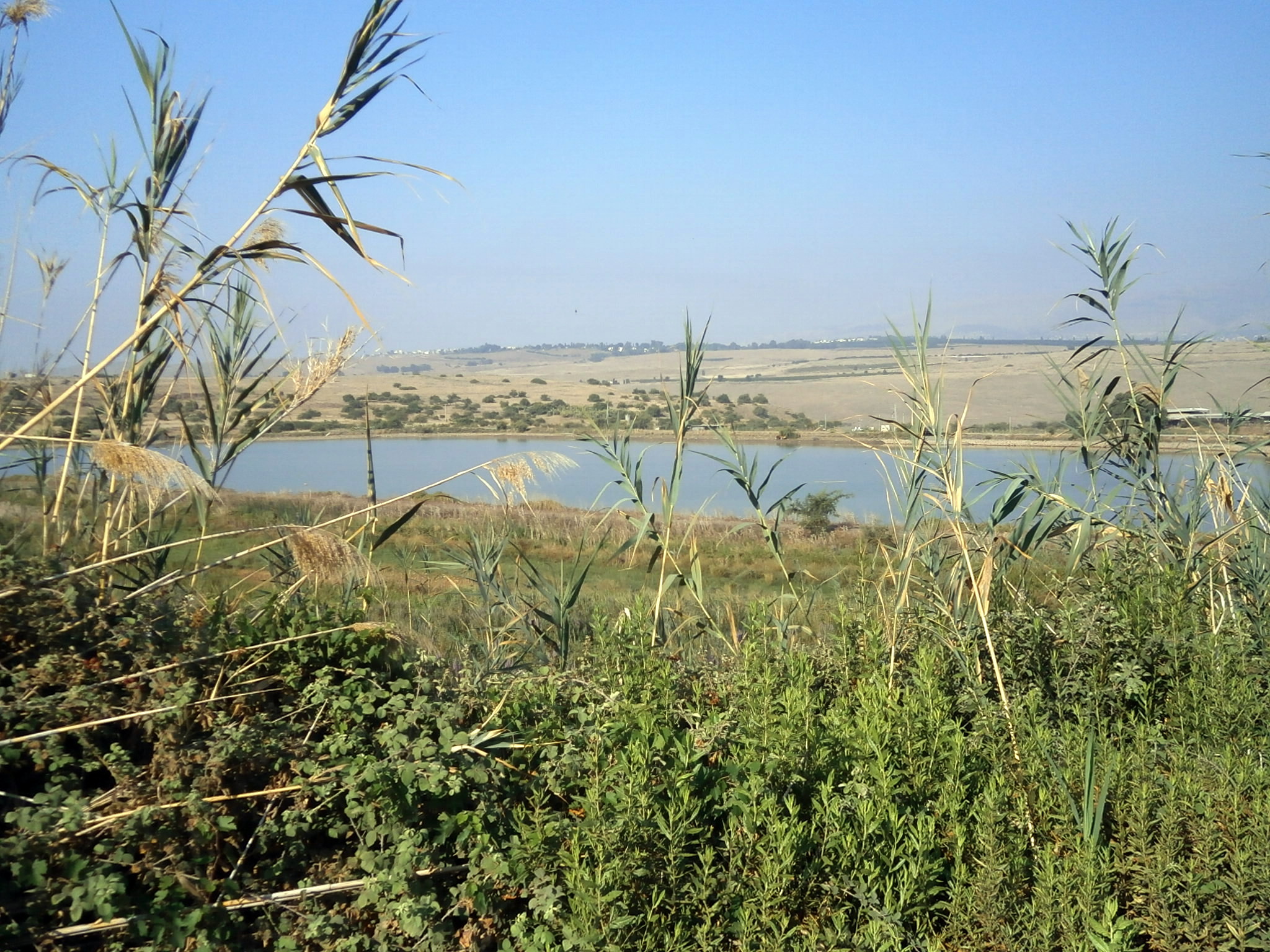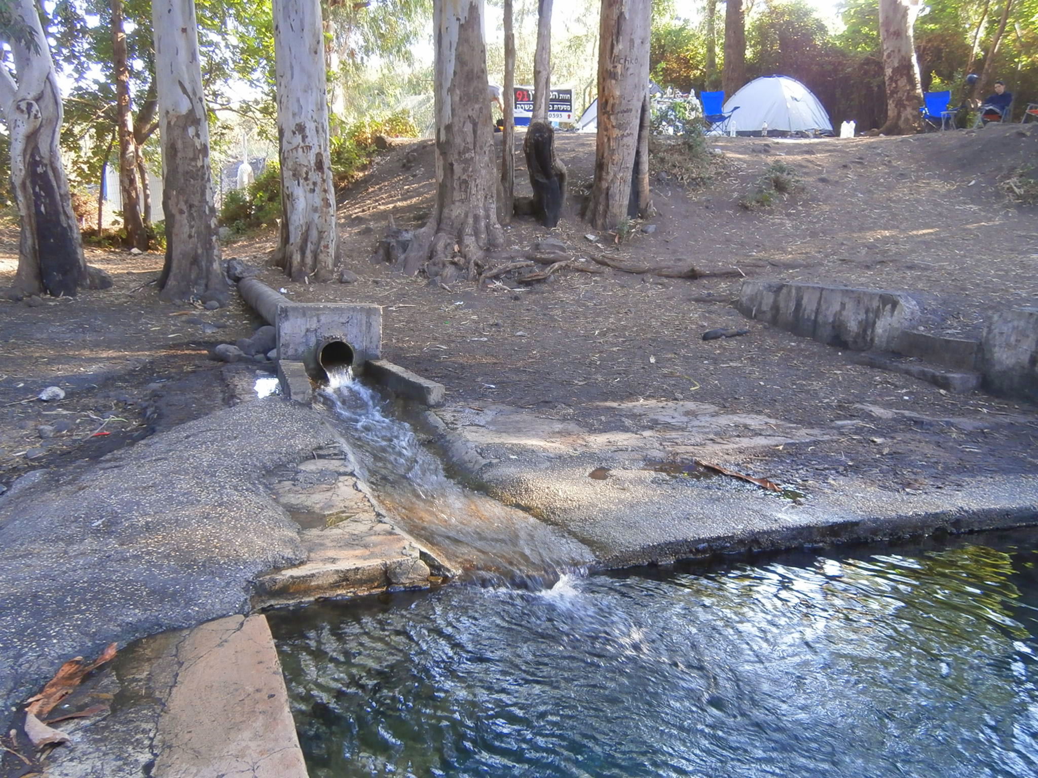 Выехали в 6 утра. Первая остановка была намечена на источнике Эйн Альмин. Маршрут поездки такой: cпустились к Кинерету, продолжили вдоль берега по шоссе 87 и после моста Арик повернули налево на дорогу 888. Проехали поворот на Брехат Мешушим (заповедник ручья Завитан) и через 4 километра cвернули влево на проселочную дорогу. По ней спустились 500 метров. Ехали очень медленно и осторожно, поскольку дорога плохая. Оставили машину, немного прошли и без труда обнаружили Эйн Альмин. Живописный уголок, где в тени эвкалиптов вас ждет большой забетонированный бассейн с чистейшей и прозрачной, как стекло, водой, а вблизи журчат ручейки и поспевает инжир. Разумеется, бассейн был построен для офицеров cирийской армии и достался нам в наследство.