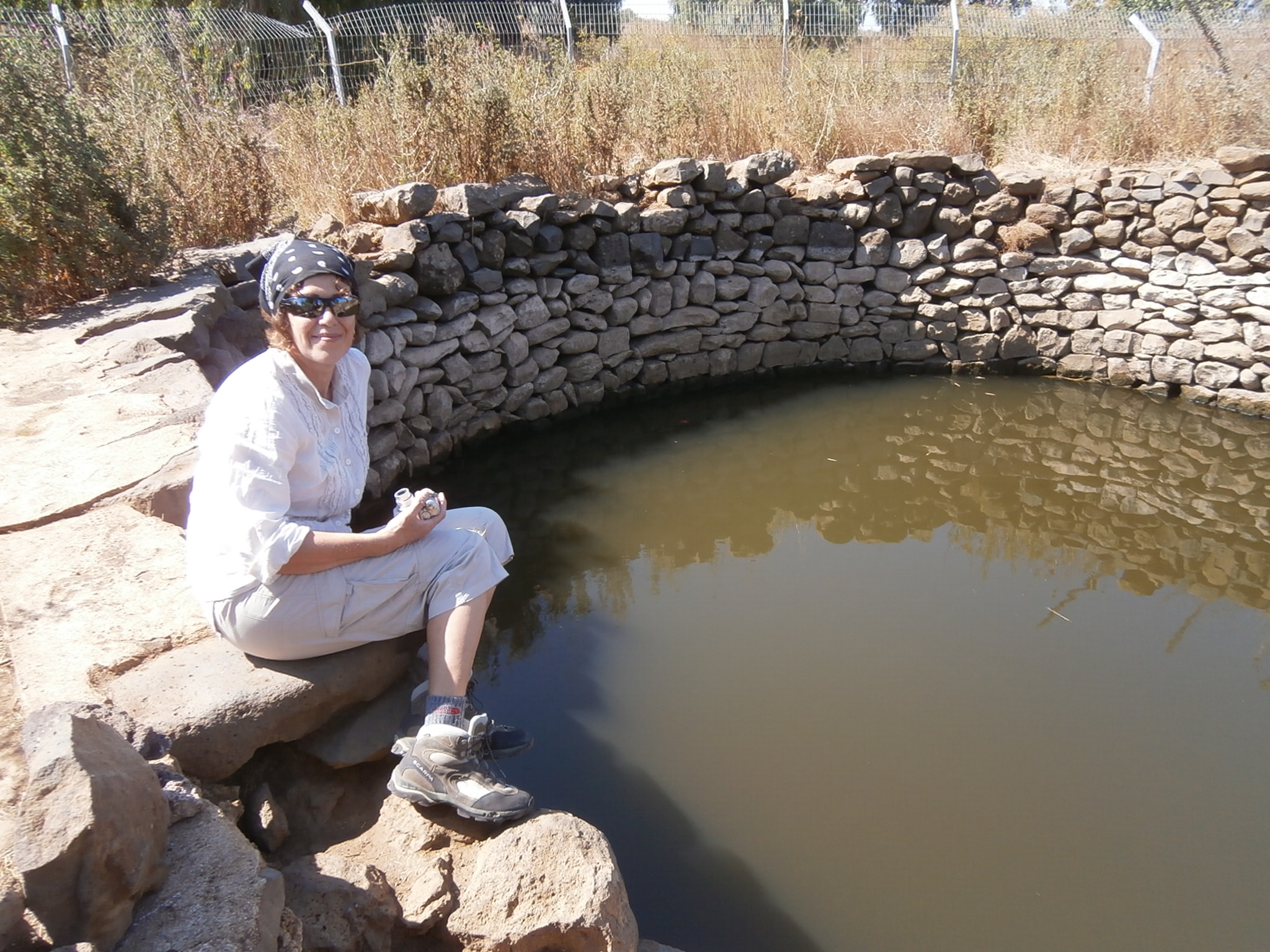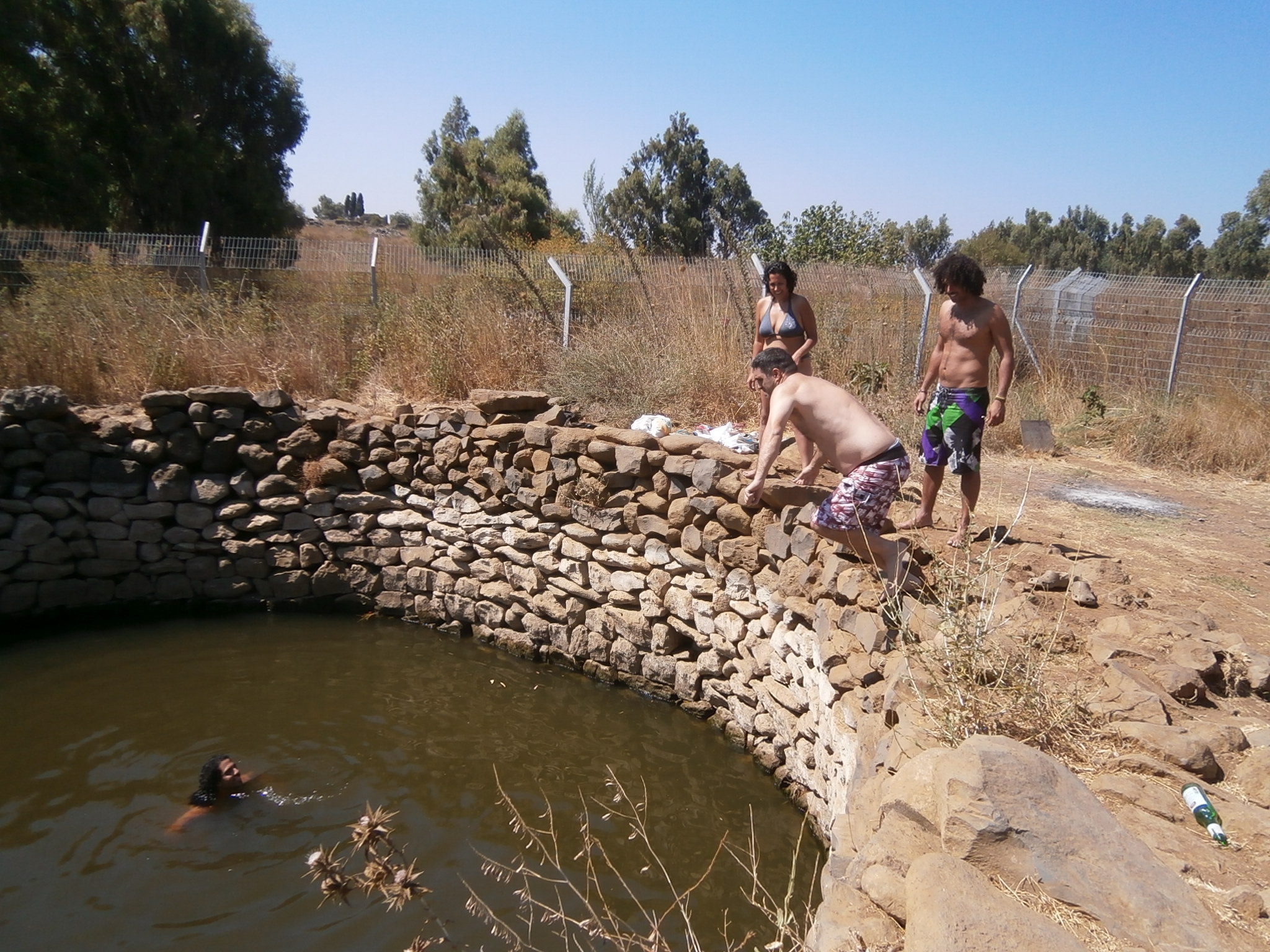 От стоянки 5 минут ходьбы до источника Эйн Мокeш. Здесь также есть большой бассейн, 10 метров в диаметре. Глубина его составляет 6-8 метров, в зависимости от времени года. Вода родниковая, чистая и свежая. Немного мутная, но купаться в летнюю жару, все равно, очень приятно. Все это было построено сирийцами, и видимо, еще в незапамятные времена. Раньше территория вокруг источника была заминирована. Но 2 года назад здесь навели порядок, проложили безопасную тропу, и теперь можно подойти к бассейну не будучи подорванным на мине 🙂