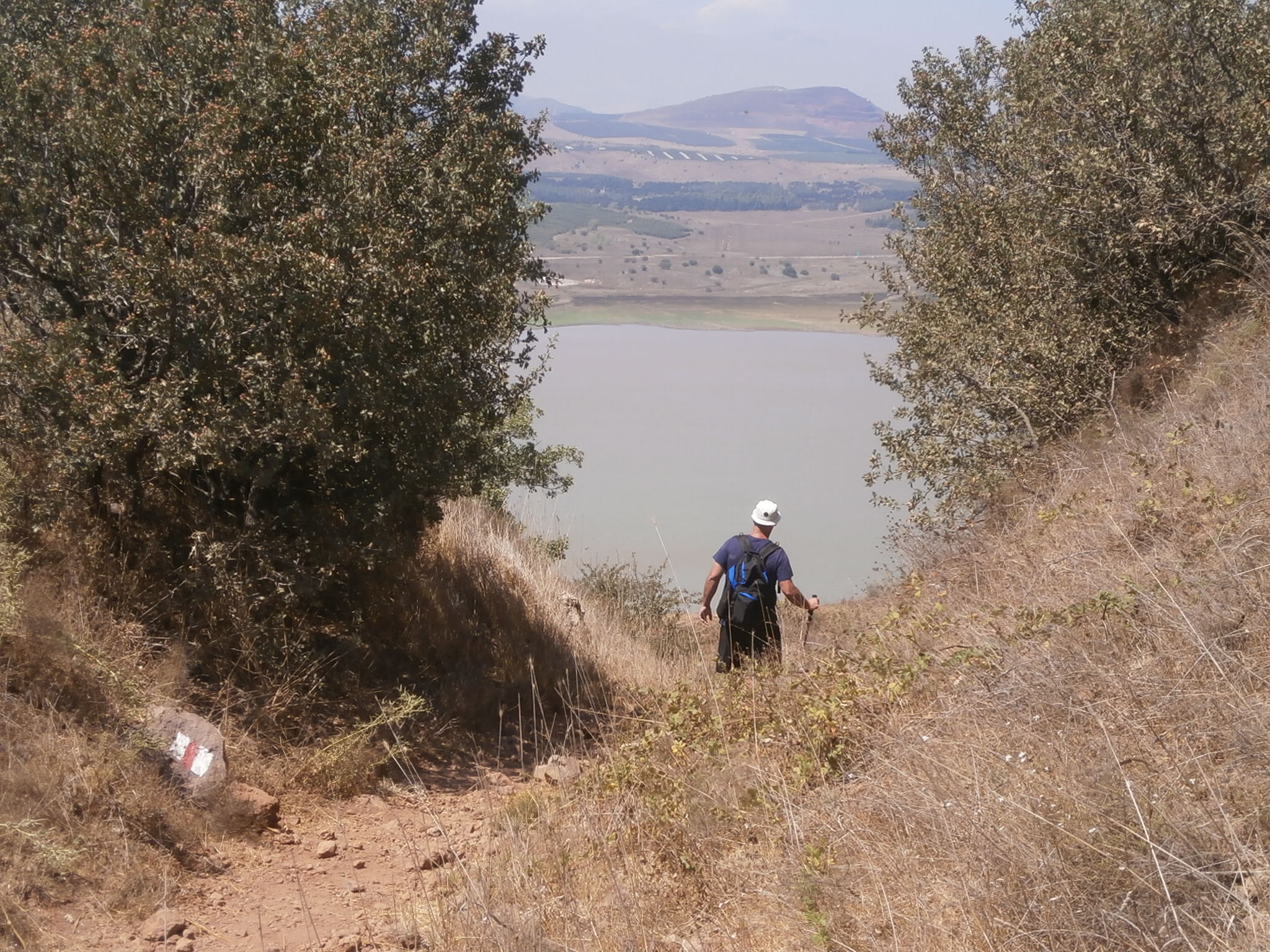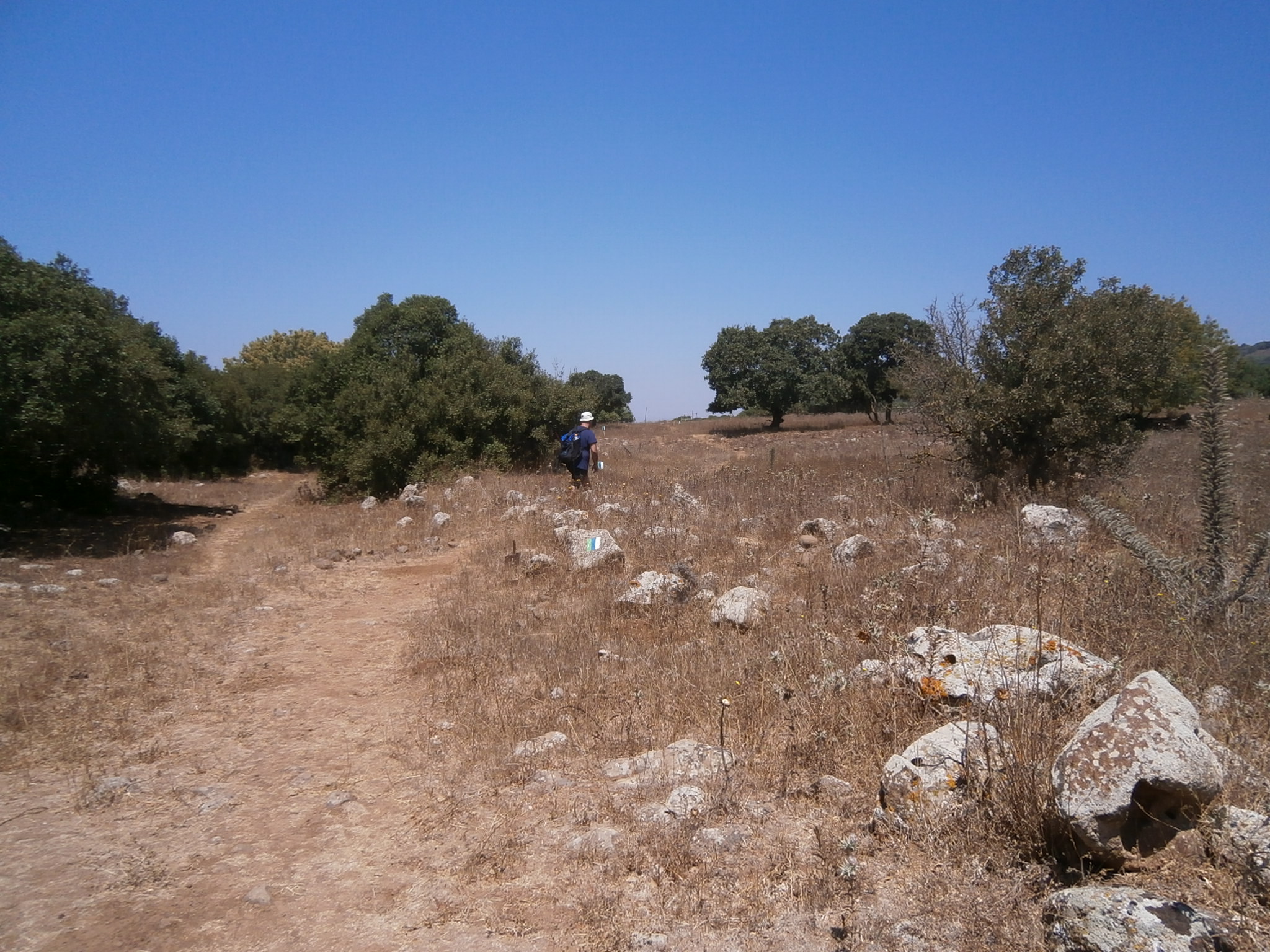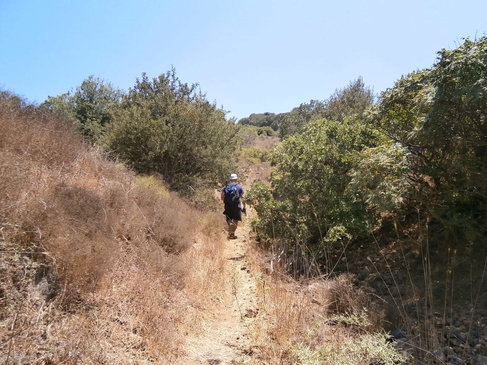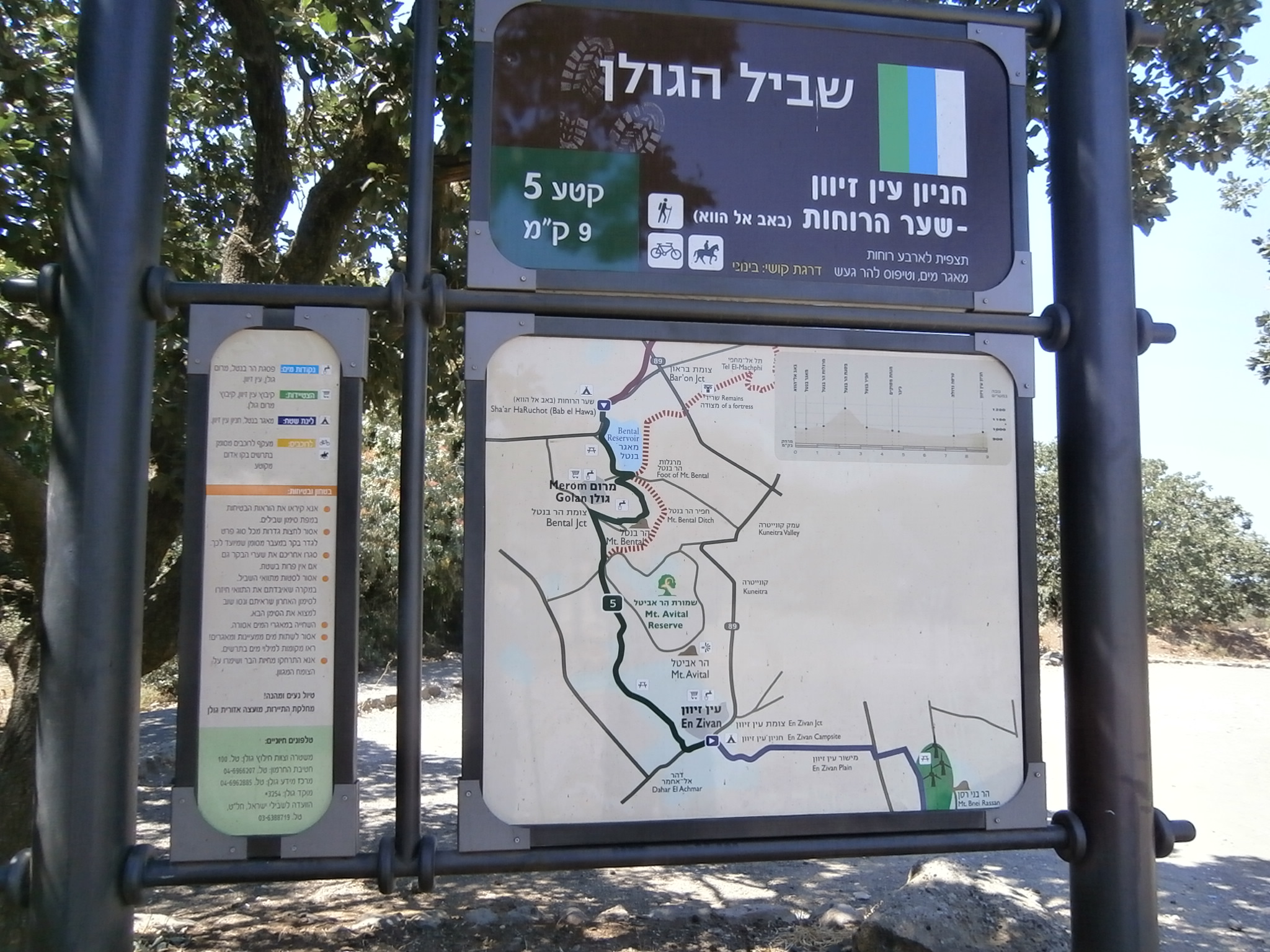 После посещения Эйн Мокeш мы вышли на маршрут. Бродить на Голанских Высотах по неразмеченным тропам не рекомендуется, можно наткнуться на мину. А покольку в этом районе имеется только одна размеченная тропа — Швиль а-Голан (тропа Голанских высот) по одному из ее учaстков и решено было прогуляться. Эта тропа, протяженностью 122км, начинается на горе Хермон и заканчивается недалеко от Хамат Гадер. Я на ней оказалась впервые, и была приятно удивлена тем, с какой любовью проложен швиль. Имеется щит с подробной информацией, и разметка очень четкая и ясная. Мы ходили от кибуца Эйн Зиван до водохранилища Бенталь, а обратно шли по проселочным дорогам в обход гор Бенталь и Авиталь. Протяжённость маршрута получилась километров 16-17.
