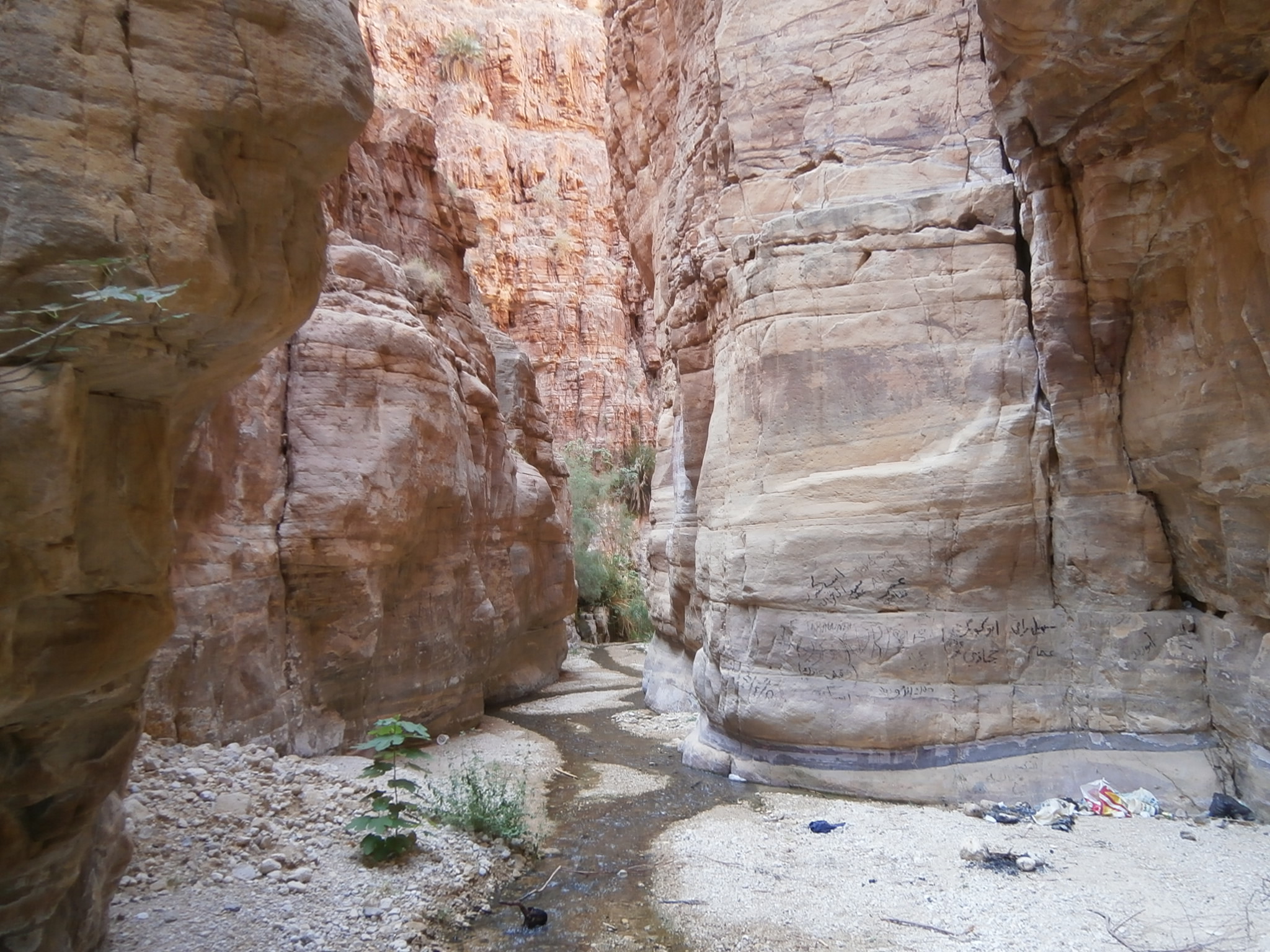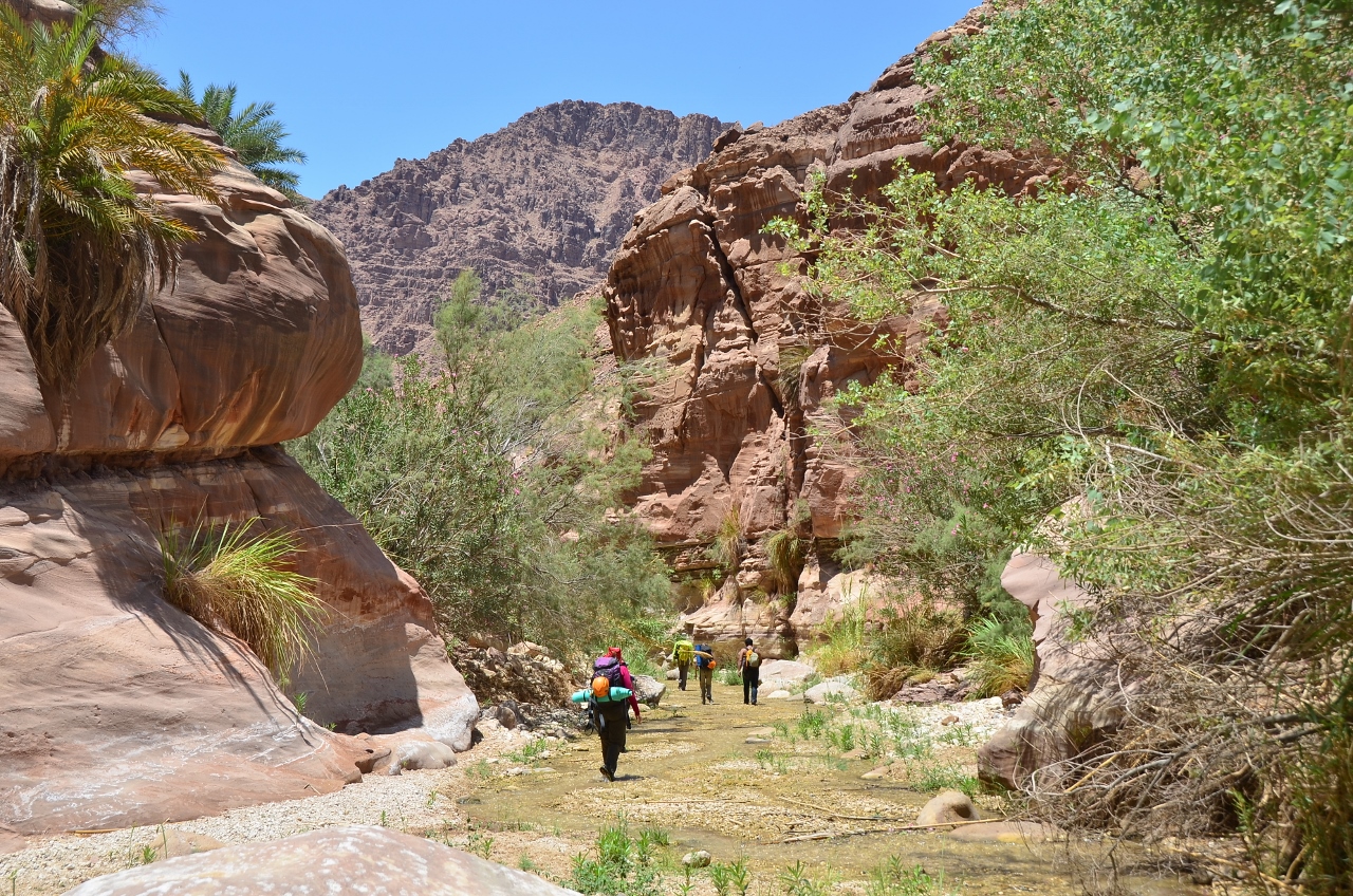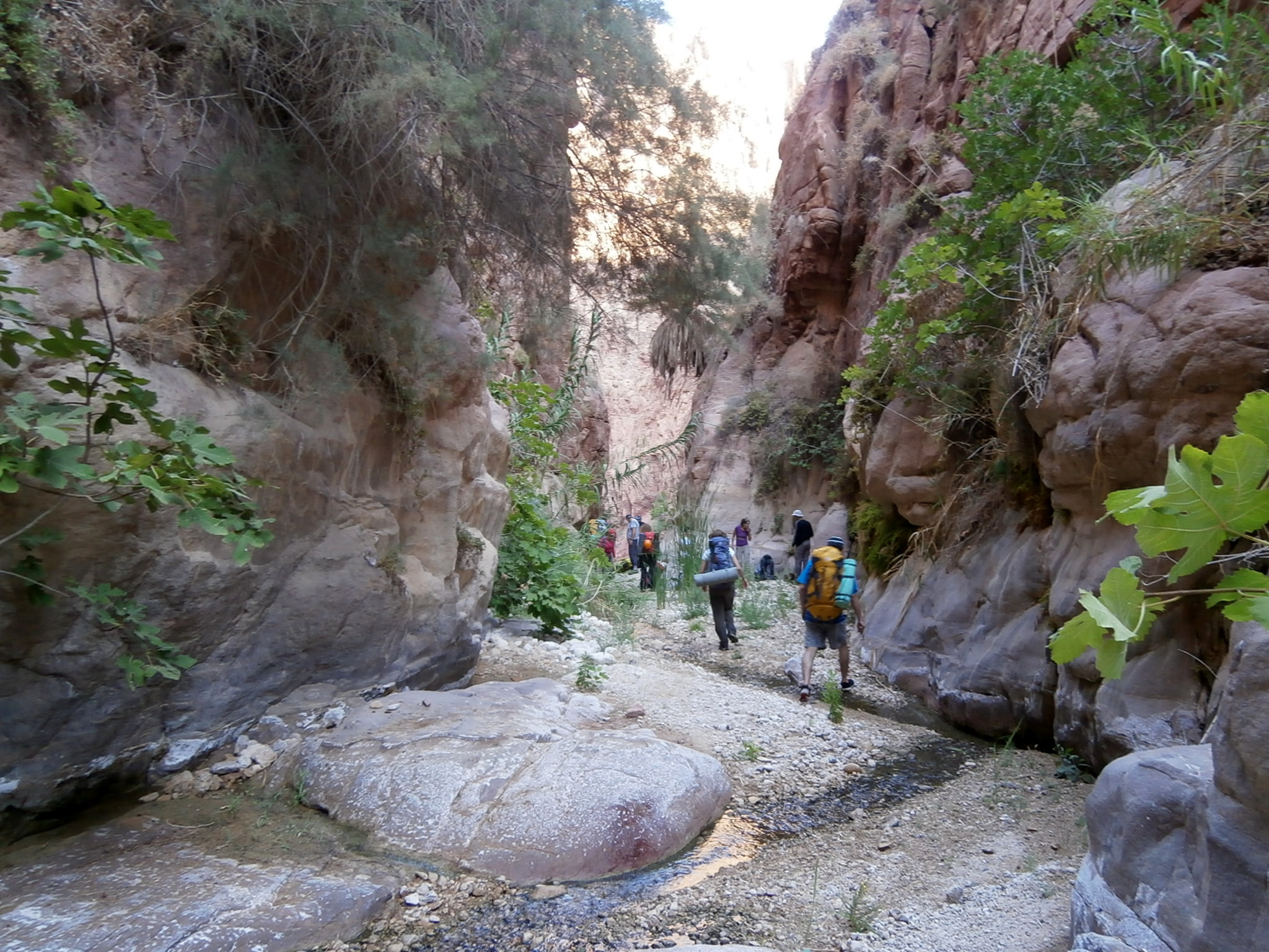 Спуск в вади продолжался недолго, и вскоре мы уже двигались по каньону вади Ассаль. Нашей целью было прийти до наступления темноты к той части вади, где появляется вода, и там заночевать. Поэтому шли очень быстро. Признаюсь, мне было нелегко (да и некоторым другим, думаю, тоже). Накануне работала в вечернюю смену, спала 3 часа, затем путь до Эйлата и 4-х часовая поездка по иорданским дорогам. И вот теперь, в самую жару, мы идем в приличном таком темпе. Но я не унываю, знаю, что терплю ради немыслимых красот, которые скоро предстоит увидеть, ради водопадов и скал, с которых мы будем спускаться. И это того стоит!