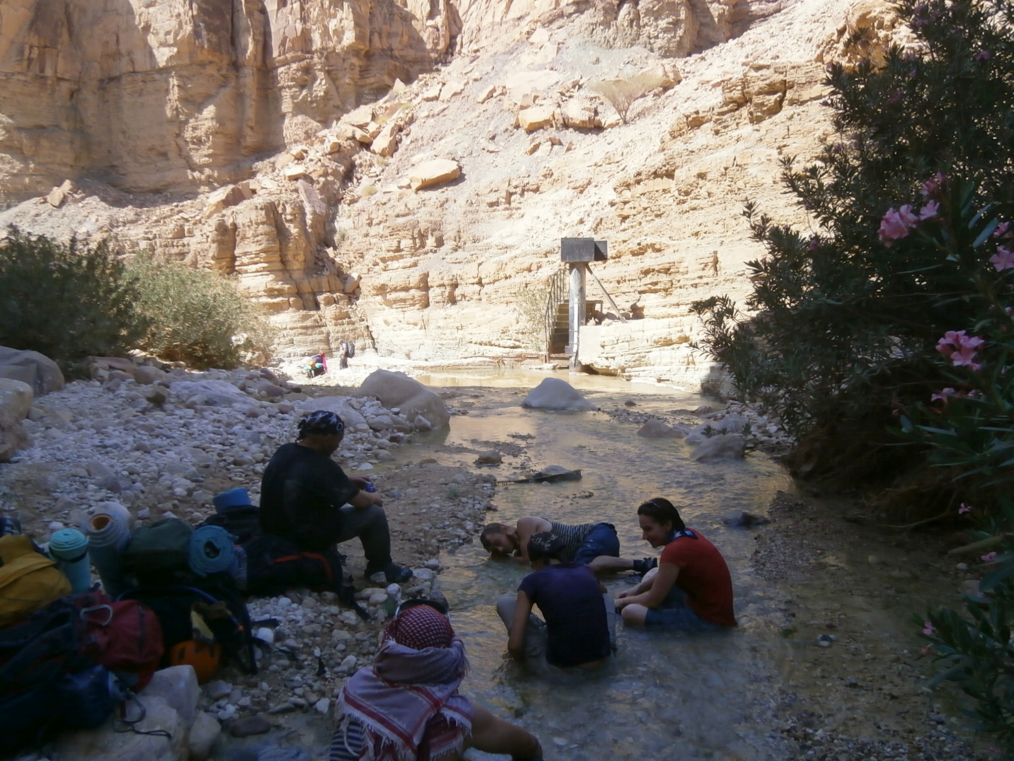 Еще немного ходьбы, спуск с крутой, но невысокой стены, и мы оказались на поляне, где обычно ночуют посетители вади Ассаль. Место сказочное. По скале, в природной нише, стекает водопад. И сейчас, после нелегкого, но полного впечатлений дня, нет большего счастья, чем постоять под струями этого, пусть и не очень полноводного, водопада. И нет сейчас более прекрасной музыки, чем звуки падающей воды.