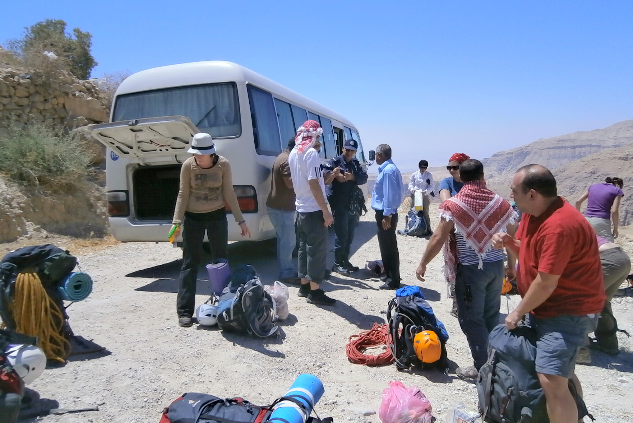 Через 3 недели после путешествия в вади Ассаль, мы снова поехали в Иорданию. Мы — это близкие для Ромы люди, его друзья и новые присоединившиеся или, как сказала Лина: «Умники и умницы». На пятницу 26 июля выпадал день рождения Ромы, и этот поход в вади Айма и вади Фейфа был посвящен ему. Думаю, если бы Рома об этом узнал, был бы доволен. Отметить день рождения в таком райском месте — это счастье! В нашей команде было 16 человек. Состав немного изменился: четверо, участвовавших в прошлый раз, не поехали, а вместо них было трое других ребят: Катя, Женя и Илья. Кирилл не смог присоединиться к хавуре (хавура — компания), поэтому организационными вопросами занимался Дима Гершкович. То есть, он не только организовывал станции для снеплинга, но и вел переговоры с Юсупом по заказу автобуса. За что ему огромное спасибо! На дворе стоял мусульманский праздник Рамадан, во время которого жители Иордании соблюдают пост и не сильно хотят работать. Поэтому цены на услуги поднялись. И автобус мы получили поскромнее и поменьше, чем в прошлый раз, но это не столь важно. От границы с нами поехал охранник, а судя по его форме, это вообще был пограничник. Он прибыл с чемоданчиком на колесах, видимо совершенно не представляя, куда он идет, и что его ждет…