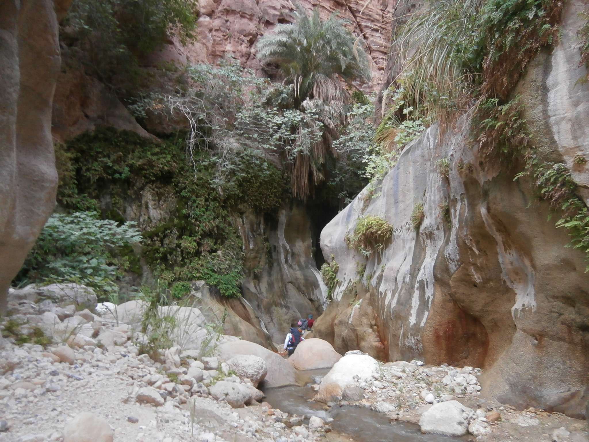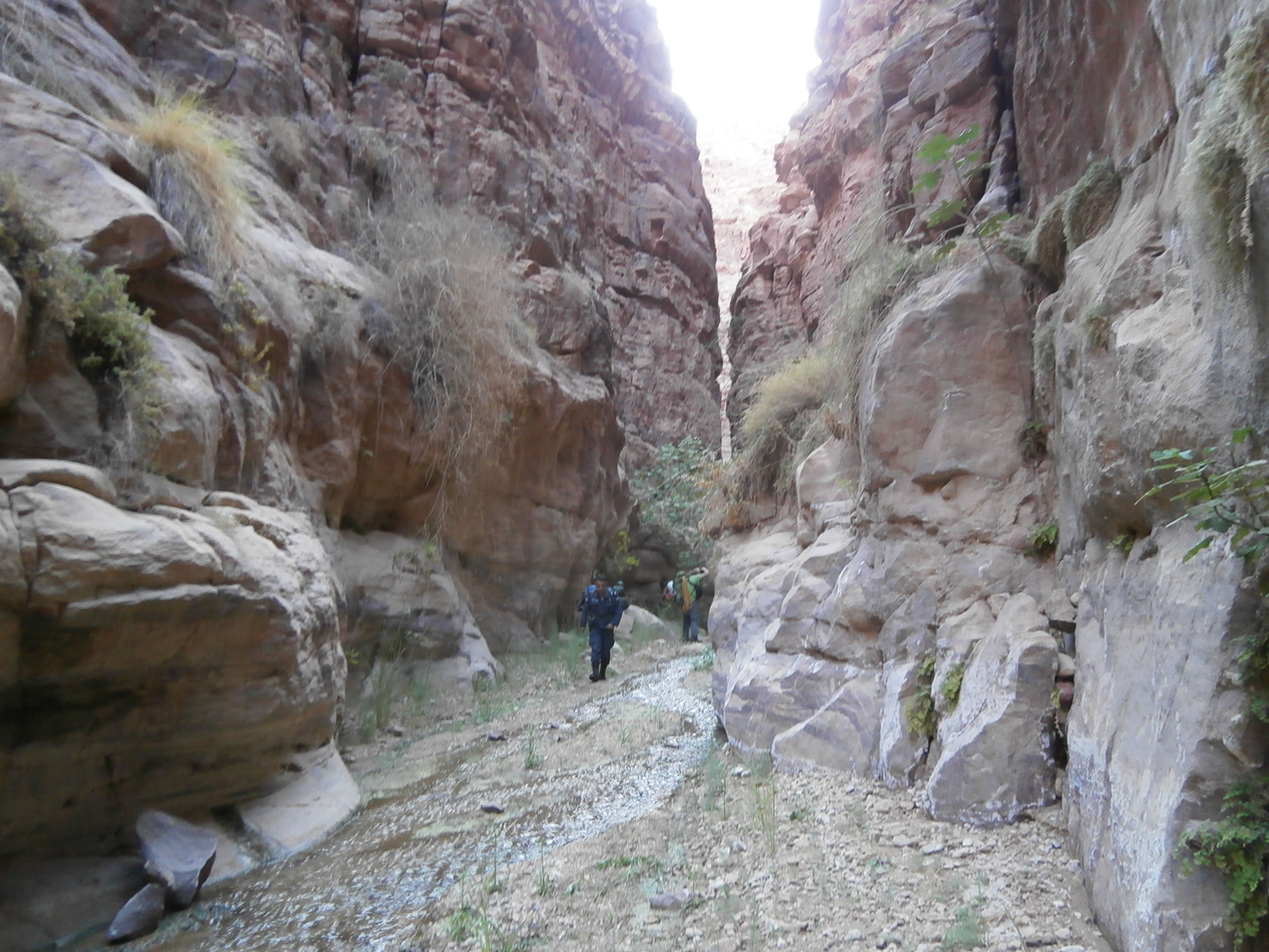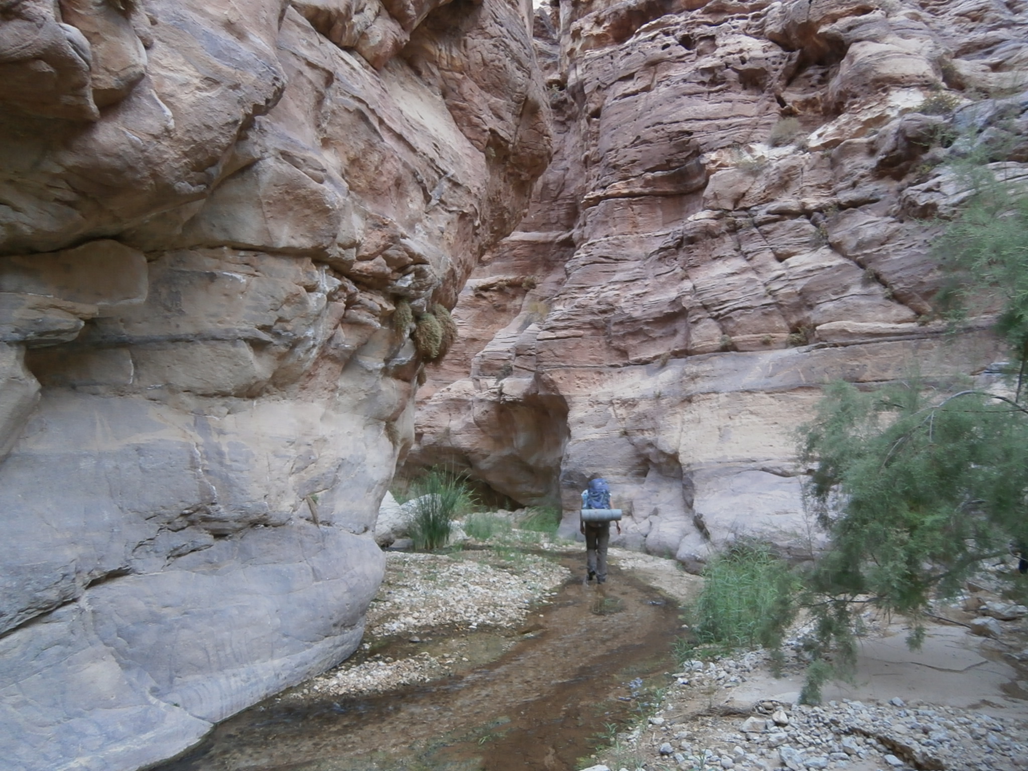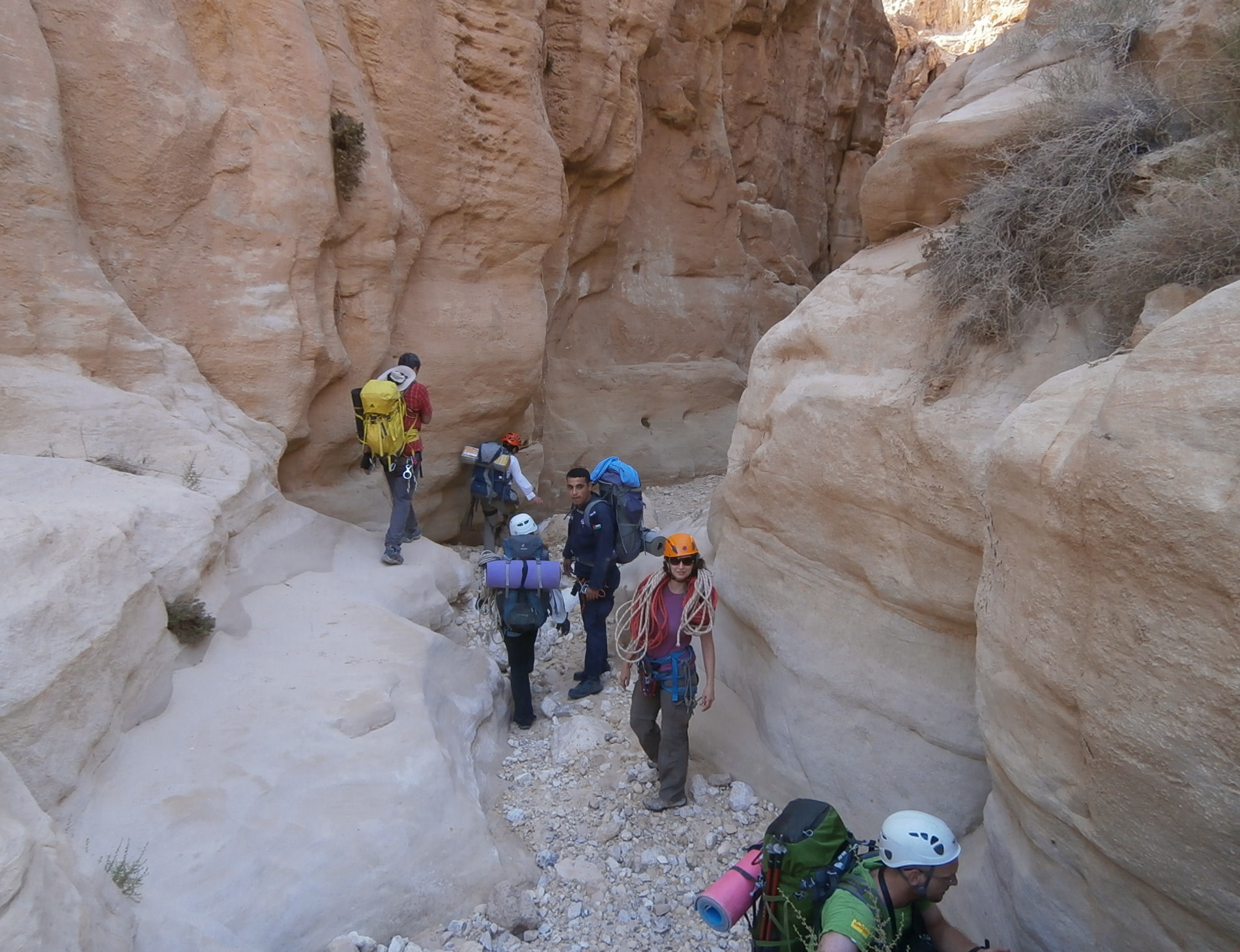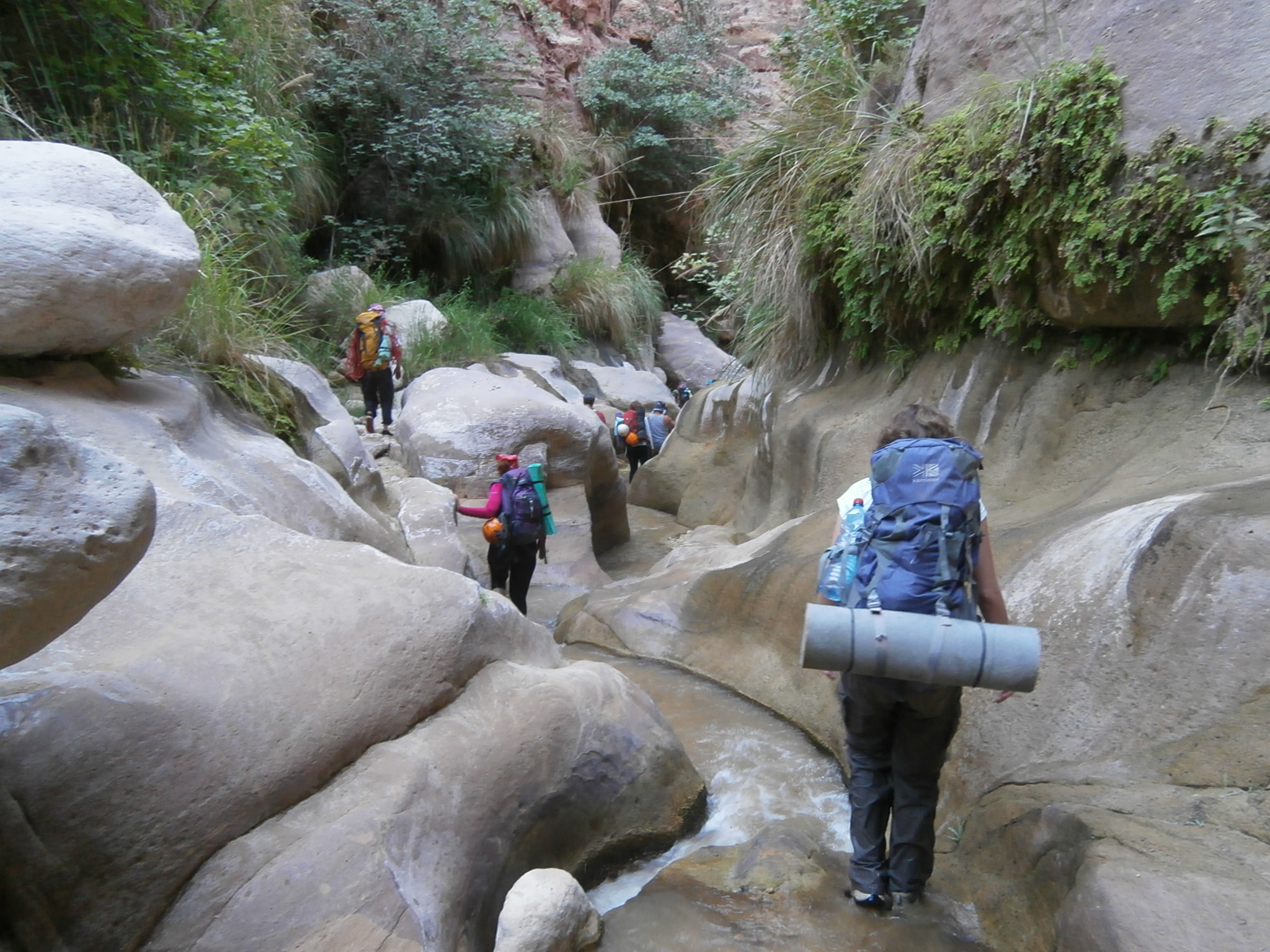 Идти было реально тяжело. Я видела, что и Юле совсем нелегко тащить свой рюкзак, ведь она тоже взяла общественные продукты, а именно — яблоки и огурцы, которых было так много, что ими можно было питаться неделю. Наш иорданский охранник шел налегке. Чемоданчик свой он оставил в автобусе, а с собой взял полиэтиленовый мешочек, в котором были полотенце, сигареты и бутылка воды. Этого набора вещей было вполне достаточно, чтобы покорить каньон. Обвязку для снеплинга и спальный мешок ему нес кто-то из ребят. Но иорданец оказался настоящим джентельменом и забрал у Юли рюкзак. А Юля время от времени брала рюкзак у кого нибудь из девчонок, и у меня в том числе, давая нам возможность передохнуть. Так мы и шли, меняясь рюкзаками. Немного поплутали, пока искали правильный заход в вади Айма. Но в конце-концов спустились по крутой сыпухе и оказались в нужном русле.