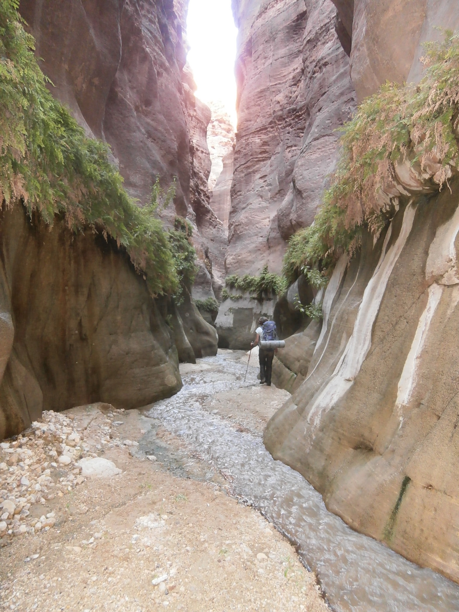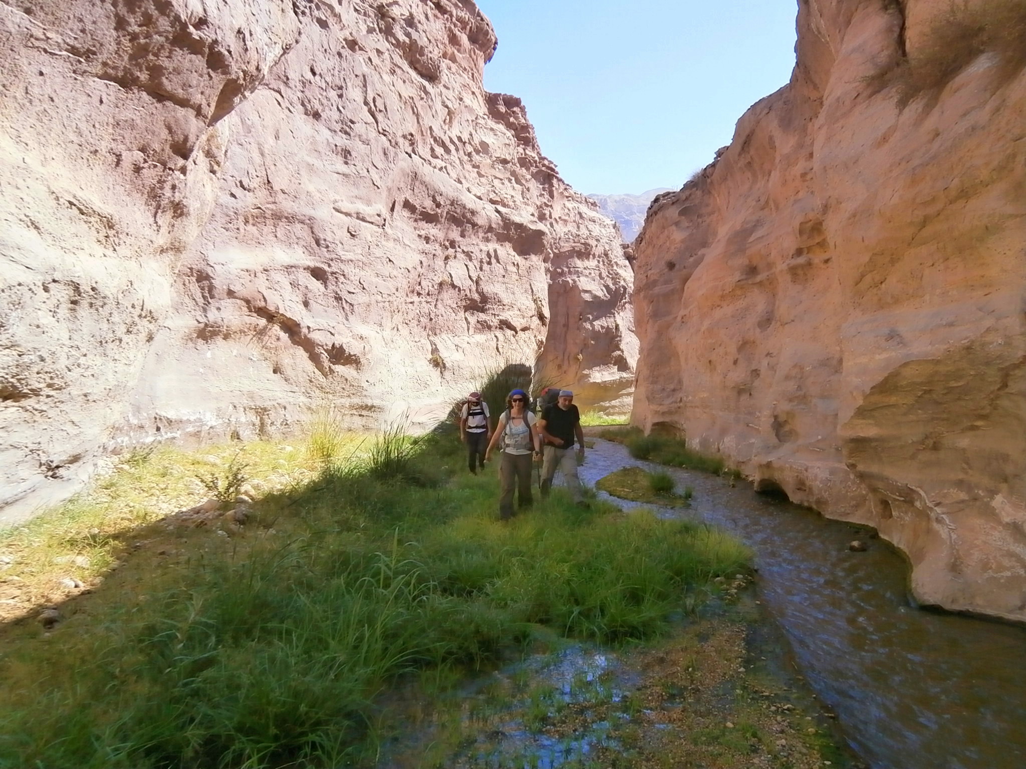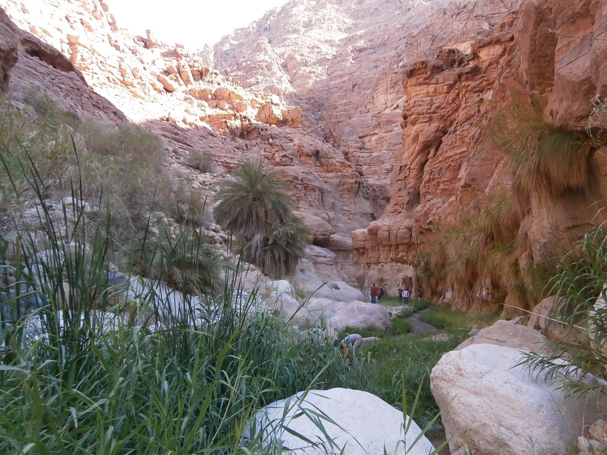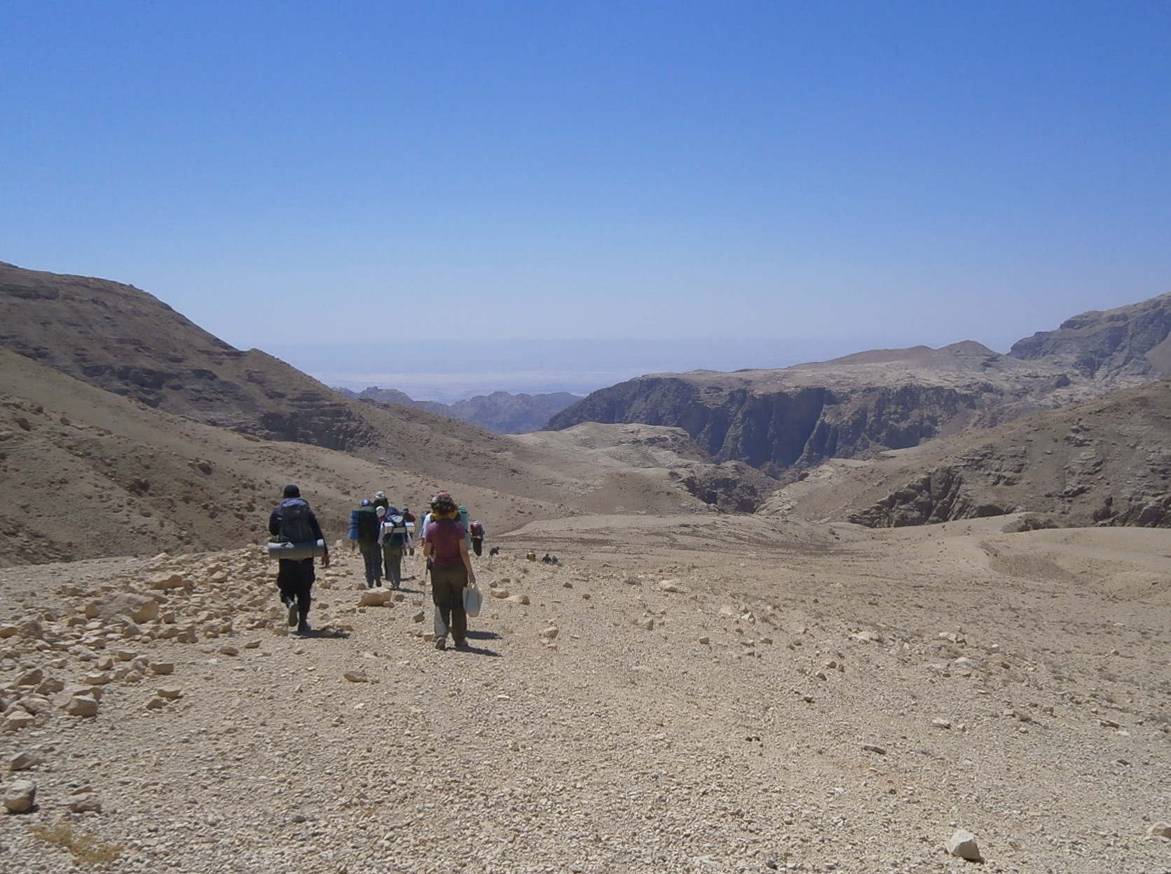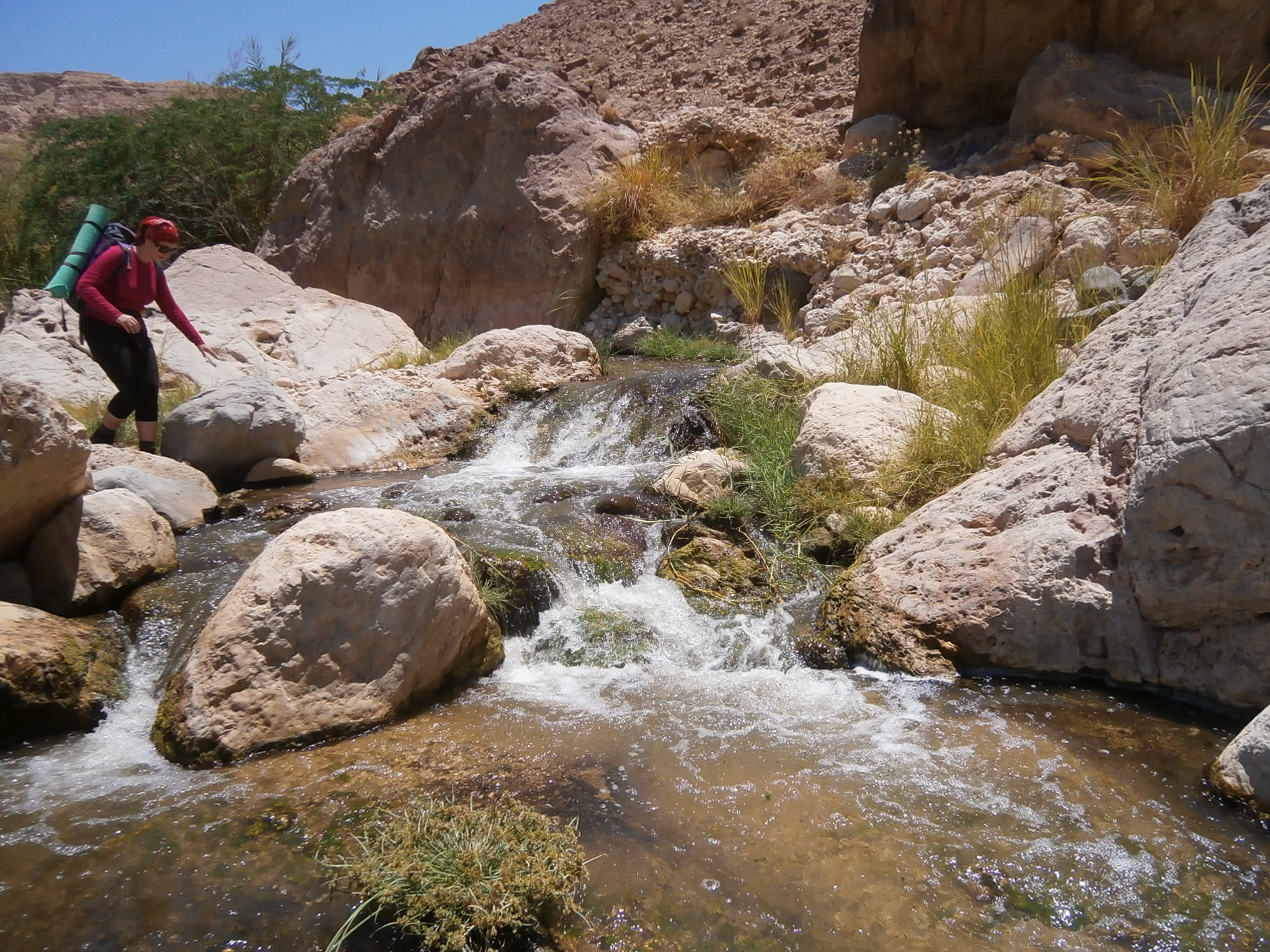 Идти было реально тяжело. Я видела, что и Юле совсем нелегко тащить свой рюкзак, ведь она тоже взяла общественные продукты, а именно — яблоки и огурцы, которых было так много, что ими можно было питаться неделю. Наш иорданский охранник шел налегке. Чемоданчик свой он оставил в автобусе, а с собой взял полиэтиленовый мешочек, в котором были полотенце, сигареты и бутылка воды. Этого набора вещей было вполне достаточно, чтобы покорить каньон. Обвязку для снеплинга и спальный мешок ему нес кто-то из ребят. Но иорданец оказался настоящим джентельменом и забрал у Юли рюкзак. А Юля время от времени брала рюкзак у кого нибудь из девчонок, и у меня в том числе, давая нам возможность передохнуть. Так мы и шли, меняясь рюкзаками. Немного поплутали, пока искали правильный заход в вади Айма. Но в конце-концов спустились по крутой сыпухе и оказались в нужном русле.