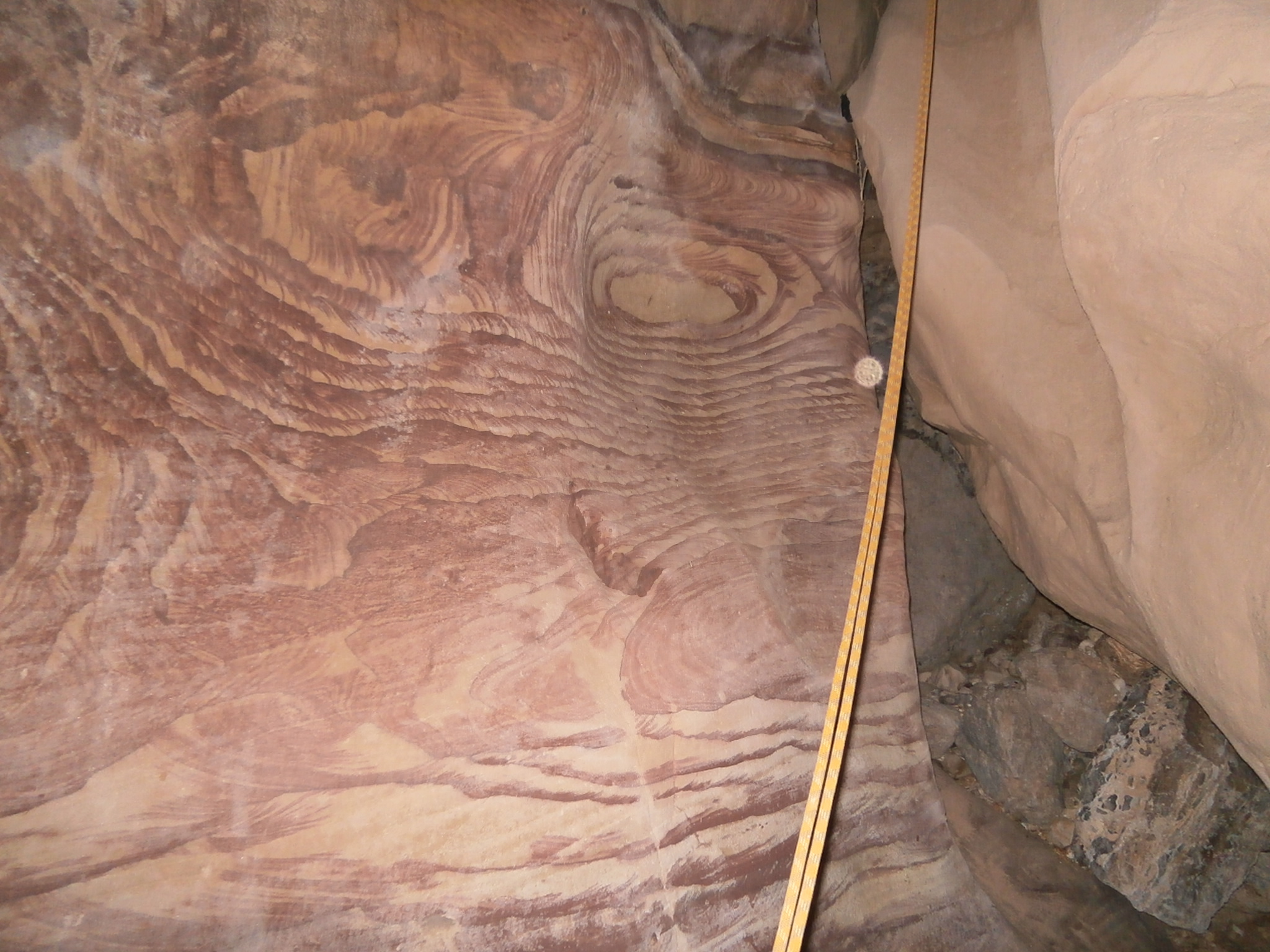 И всё было хорошо. Но вот на одном из спусков другой Дима, Дима В., «проехал» по скале и немного поранил руку в области локтя, тем самым положив начало нашим злоключениям в этом походе. Следующее происшествие не заставило себя ждать. Стасик, наша «группа поддержки», пострадал сам. Неудачное движение ногой при спуске скалолазанием закончилoсь повреждением щиколотки. Стас вскрикнул от неожиданной сильной боли и даже на несколько секунд потерял сознание от болевого шока. Получив необходимую помощь — таблетку оптальгина, эластичную повязку, а главное — наши любовь, тепло и заботу, Стасик героически двинулся дальше, уже без рюкзака, но с палкой для опоры. К месту ночевки мы добрались уже в полной темноте. Последние метры шли по красивейшему каньону. Стены его были «расписаны» узорами невиданной красоты, и в темноте их совсем не было видно. Я заметила эту красоту случайно и не смогла не сфотографировать.