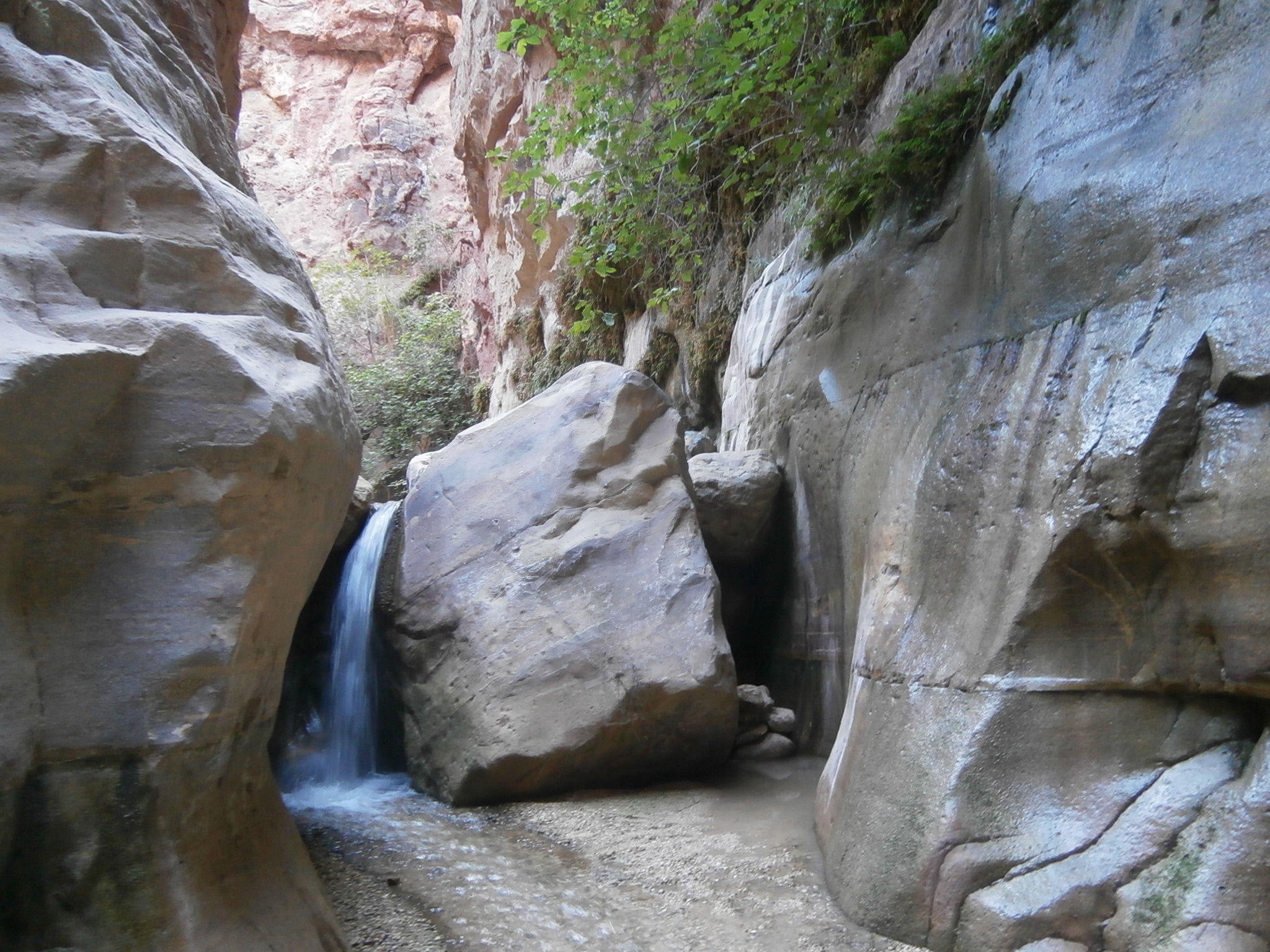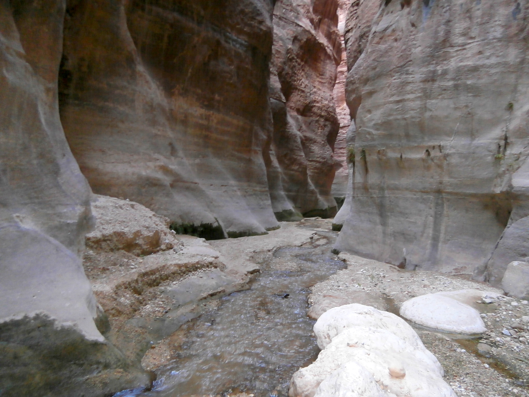 Пока мы отдыхали у водопада, четверо ребят из группы уже ушли вперед. Взвесив ситуацию, мы решили, что несколько человек останутся и будут помогать в передвижении Халеда, а остальные пойдут дальше и вызовут помощь, так как было неясно, сможет ли Халед дойти до конца каньона. Несколько девчонок, и я в том числе, пошли вперед. Я шла первая, увлеклась ходьбой и через некоторое время обнаружила, что позади меня никого нет. Девчонки отстали! Возвращаться назад было невозможно, так как по пути я сползала с невысоких водопадов и подняться по ним назад без посторонней помощи я бы не смогла. Я решила остановиться в красивом узком каньоне и подождать людей. Но долго высидеть не смогла. Красота манила, звала и тянула меня вперед с неимоверной силой! Я практически бежала по воде, так мне не терпелось увидеть, а что там, за следующим поворотом? Узкие каньоны переходили один в другой. Им не было конца! И каждый следующий был прекраснее предыдущего. Я чувствовала, что теряю контроль над собой, иду, как одержимая, и не могу остановиться. Позже, когда поход закончился, меня, конечно, мучали угрызения совести, что не подождала девочек. Но в тот момент ноги абсолютно не подчинялись голове и сами собой несли меня вперёд. По сути дела, это был мой одиночный поход внутри коллективного похода :-). Фотографии на этом участке я не делала, поскольку фотоаппарат остался в рюкзаке у Юли…