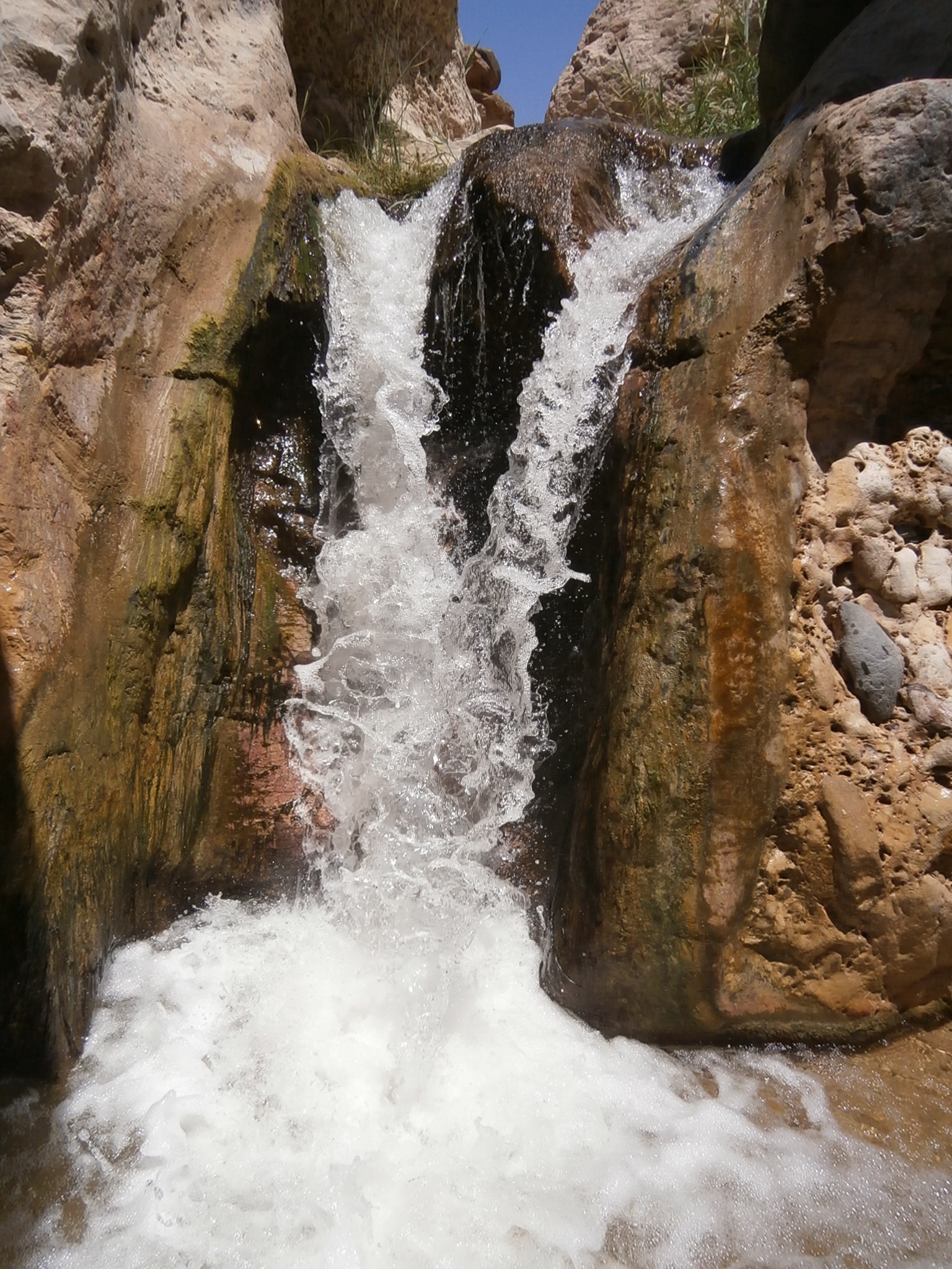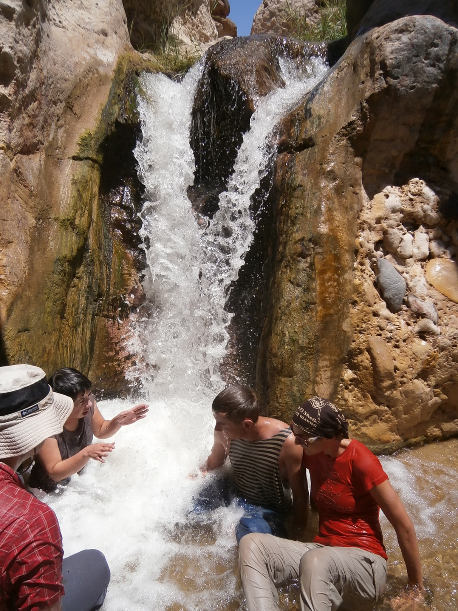 И вот часа через три такой ходьбы поведение Халеда изменилось и стало вызывать беспокойство. Он часто останавливался и отдыхал. Сначала сидя, а потом и лежа. Время отдыха увеличивалось с каждым разом. Халед выглядел бледным и ослабшим и передвигался с большим трудом. Нести рюкзак он уже не мог. Впору было нести его самого. Состояние Халеда становилось всё хуже. Он подолгу отлёживался. Мы поливали его водой, пытаясь взбодрить. Ситуация была непростая. Помощи ждать неоткуда. Нужно было выбираться из каньона своими силами. Поэтому Халеда просто взяли под руки и повели. Шаг за шагом, вперед и вперед. И кто его вёл? Стасик, который сам шёл, превозмогая боль в ноге, и Женя. Эта была очень трогательная картина: идут по каньону Стасик, прихрамывая и опираясь на палочку, Халед, чуть живой, и Женя, забывший про фотосъёмку. На водопаде, довольно высоком и бурном, Халеда бережно передали из рук в руки, как хрупкую фарфоровую куклу. В этом месте было обалденно красиво и невозможно было не остановиться и не посидеть под бурными потоками.