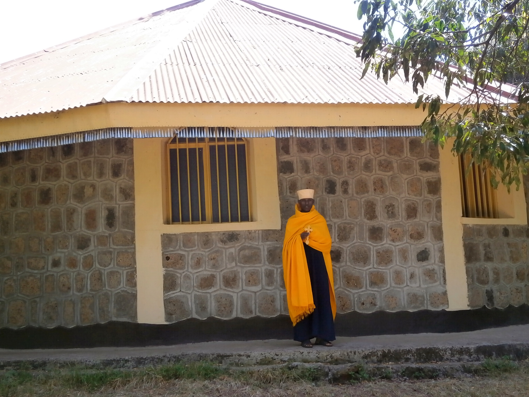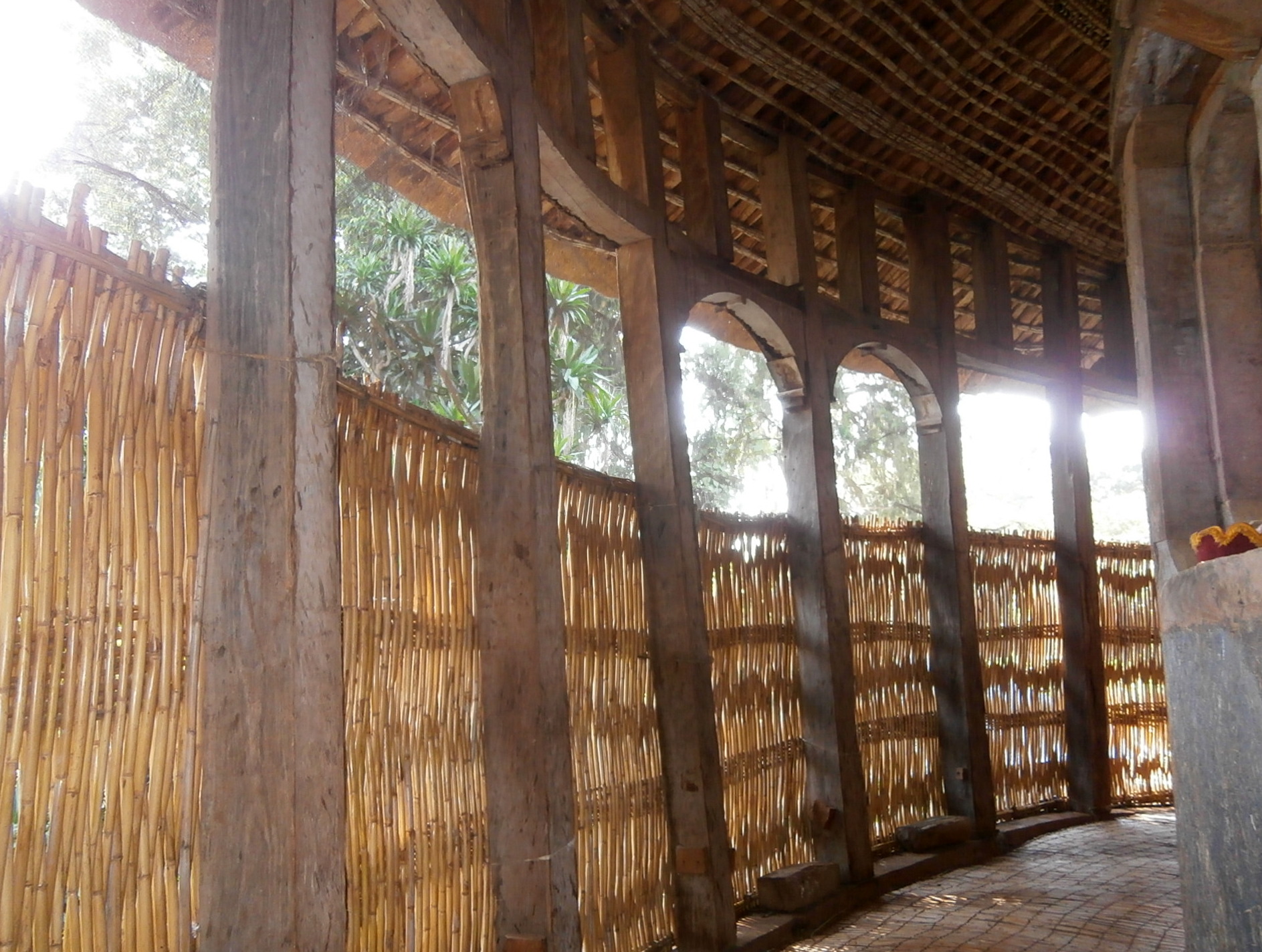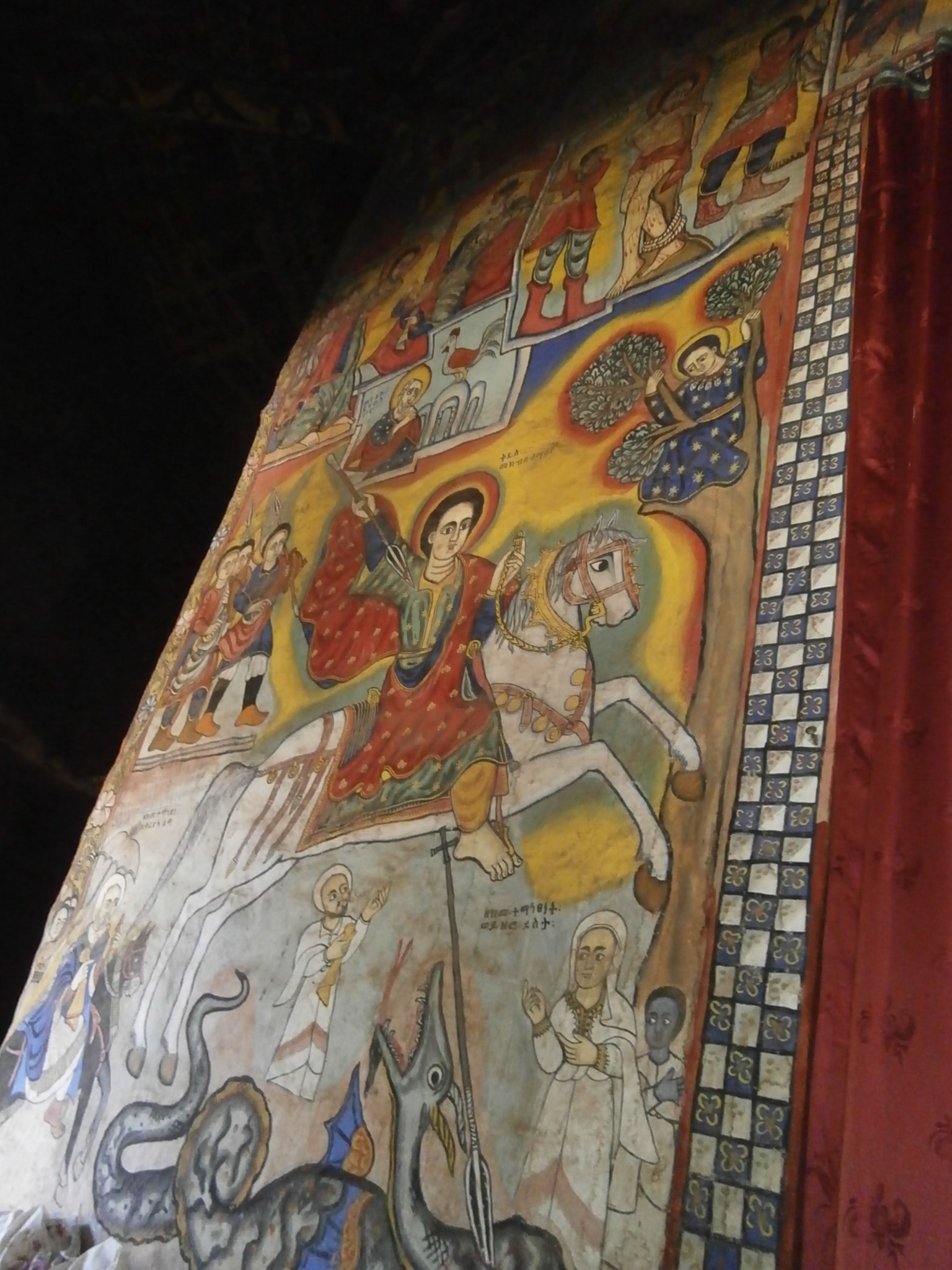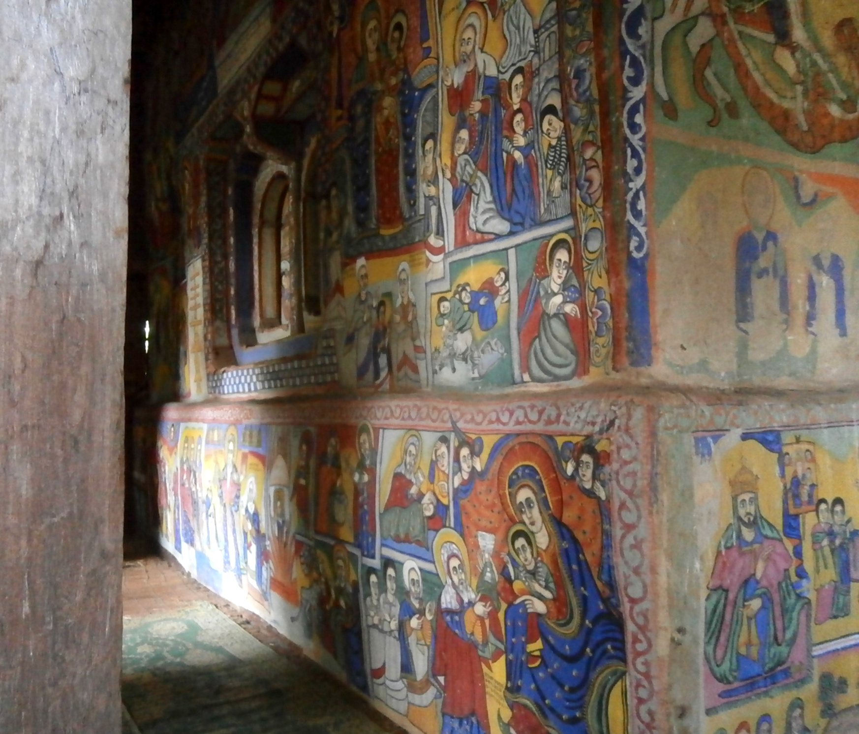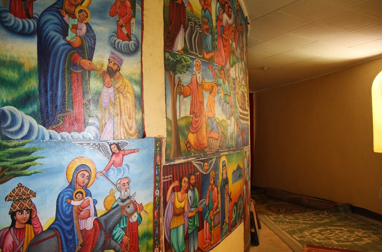 Наш первый гид обьяснил как устроена эфиопская церковь и показал настенные росписи на религиозные сюжеты. Выполнены они оригинально: нарисованы на полотнах и приклеены к стенам.