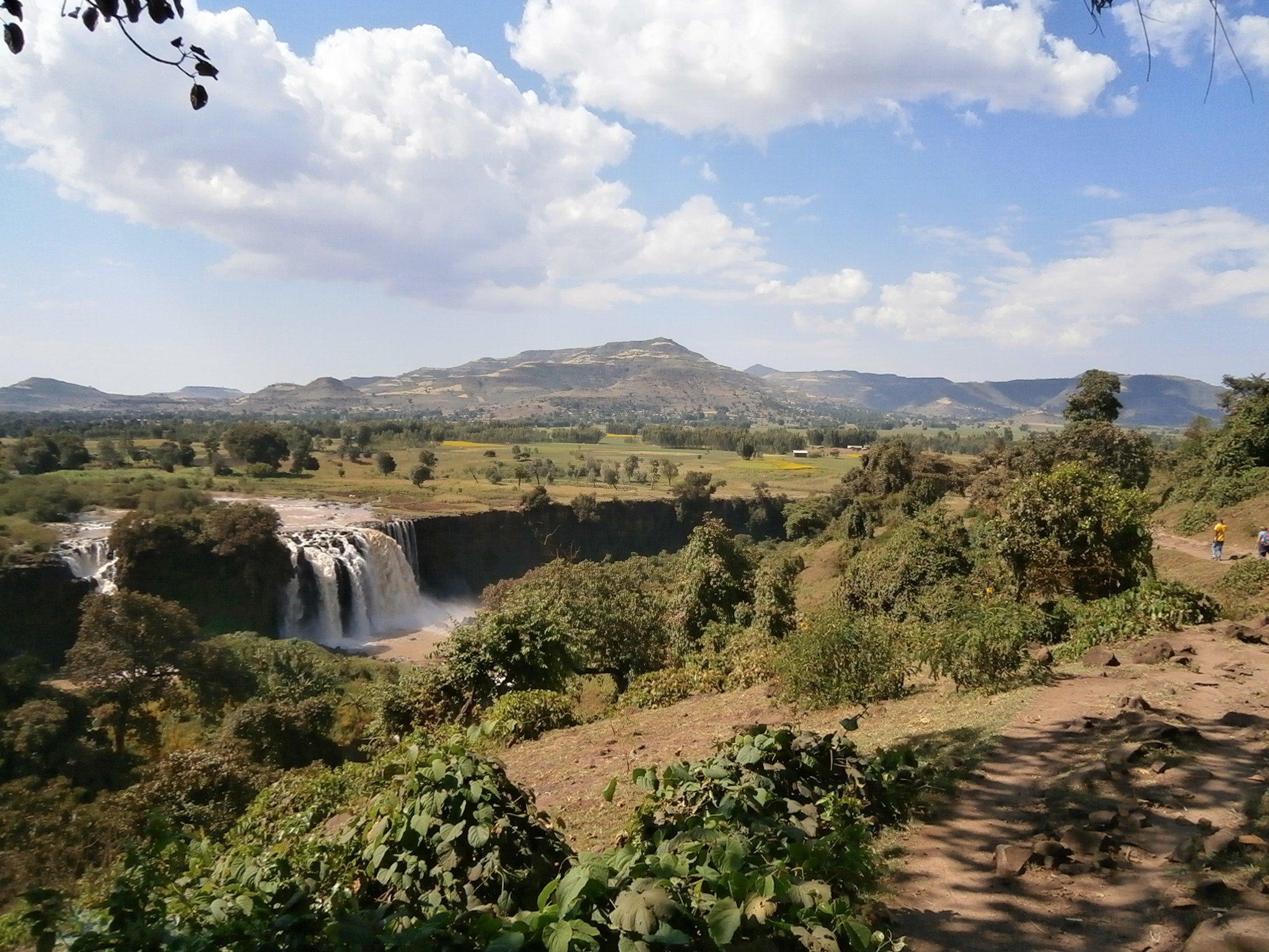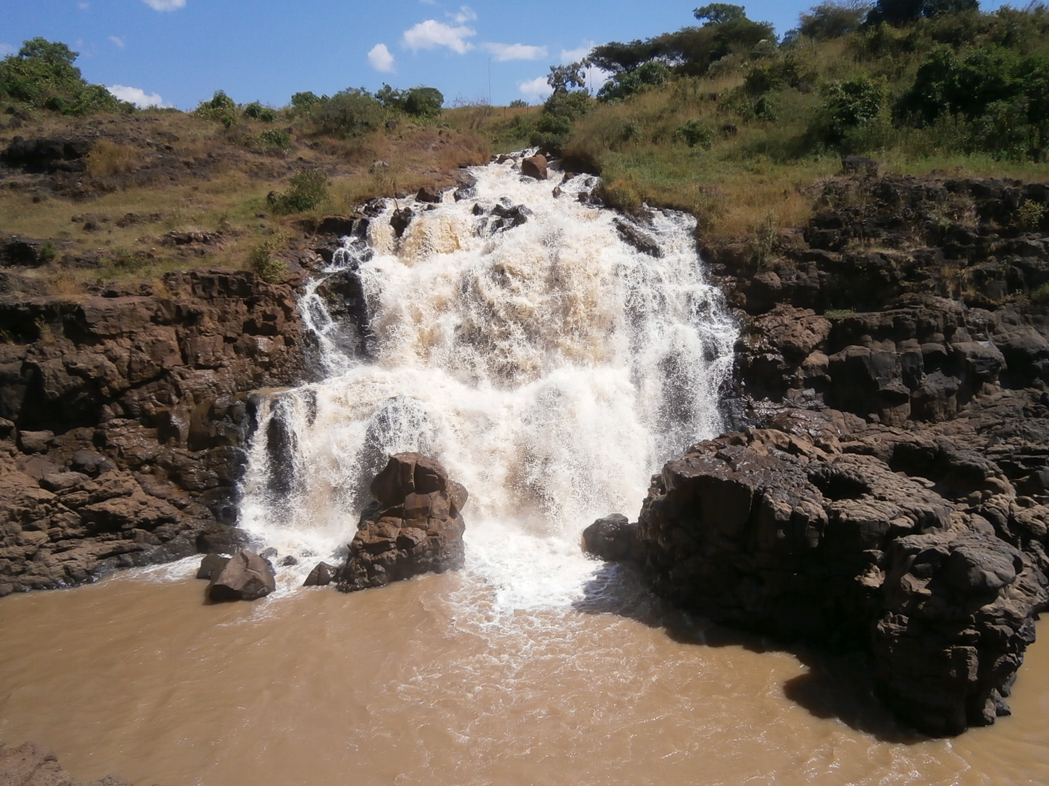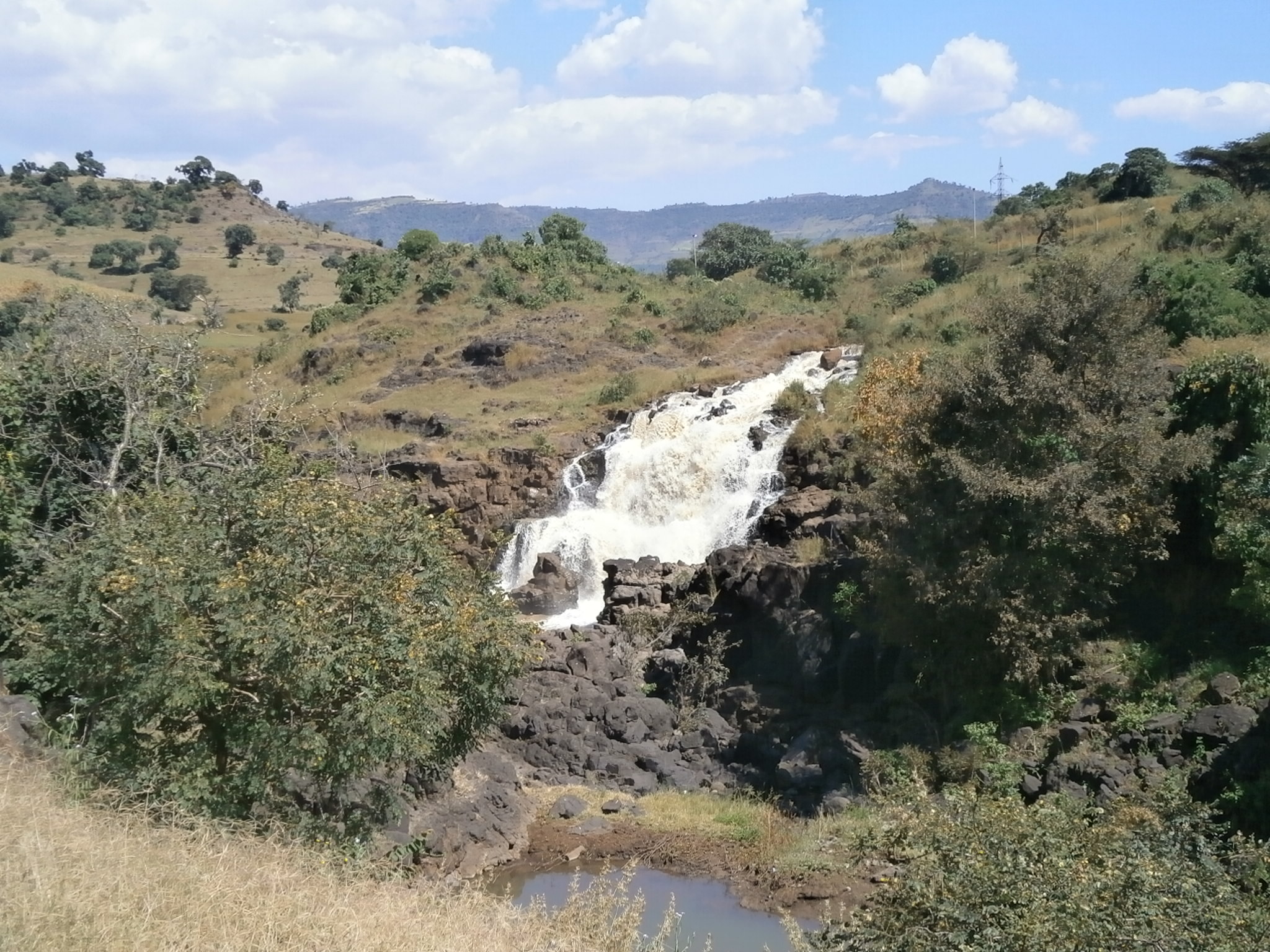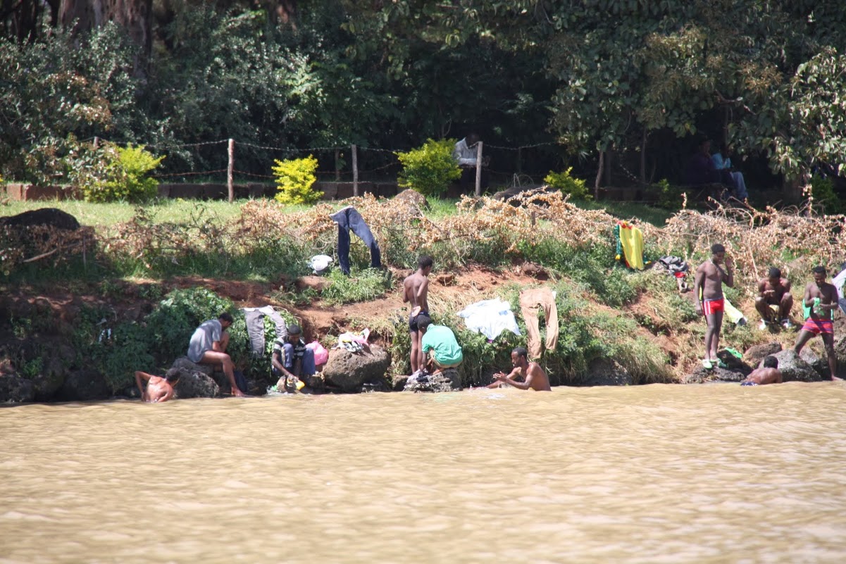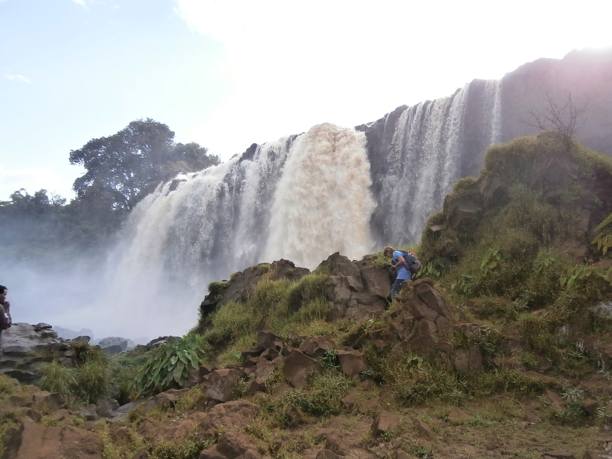 В 11:30 прогулка на катере закончилась. На берегу нас уже ждал Такли с минибусом, и мы сразу же поехали на водопады Голубого Нила. Эти водопады вторые по величине в Африке после водопадов Виктория и являются достопримечательностью номер один в Эфиопии. Однако этот факт не мешает тому, что дорога, ведущая туда  не заасфальтирована. 30 километров приходится трястись по просёлочной дороге. Вокруг — похожая на вчерашнюю картина, нескончаемые ряды местных жителей. И опять глаза широко открываются от удивления: как они так живут?! И насколько их жизнь не похожа на нашу… Опять дети, бегущие в/из школу (ы) в разноцветных нарядах-формах с книжками и тетрадками под мышкой. Стирка и помывка в  ручьях  и речках: