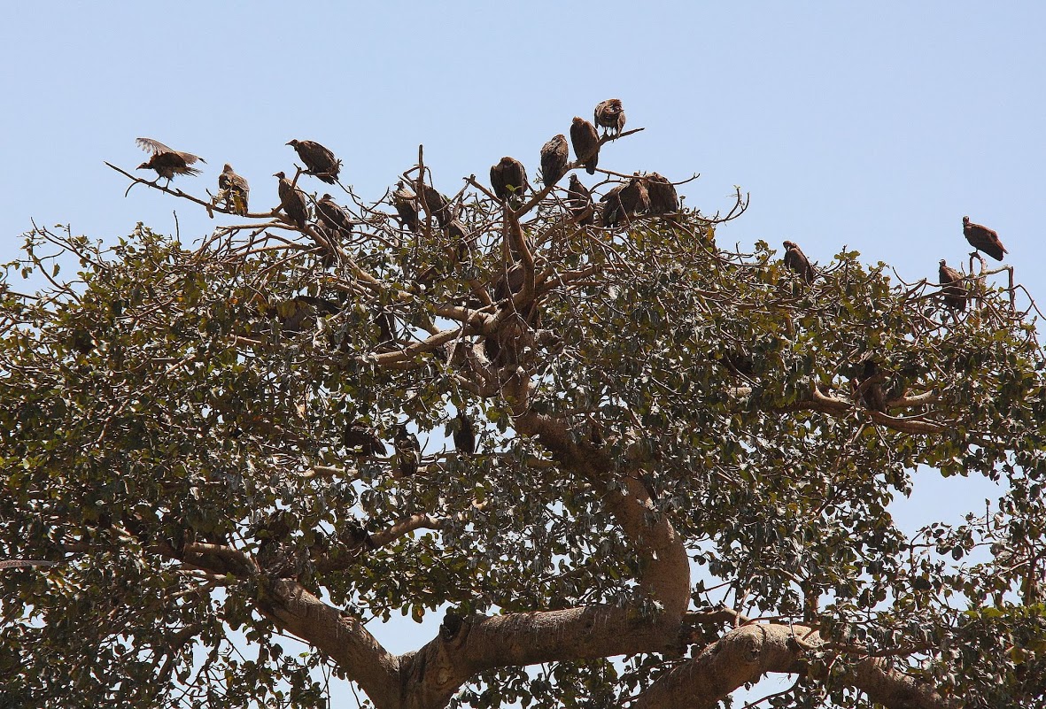 По пути мы также видели скопление крупных хищных птиц, из рода  грифов. Сидящие на ветках деревьев, они кажутся совсем небольшими. Но в полёте… Размах их крыльев поражает — он более 2-х метров! Количество птичек было такое, что хватило бы на несколько государств. А у нас в Израиле их считают поштучно, «знают каждого в лицо» и охраняют так, что даже закрывают целый нахаль от посещения туристов (речь идет о Хацацоне), чтобы не мешать гнездоваться и выводить потомство. Вот они, грифы Эфиопии: