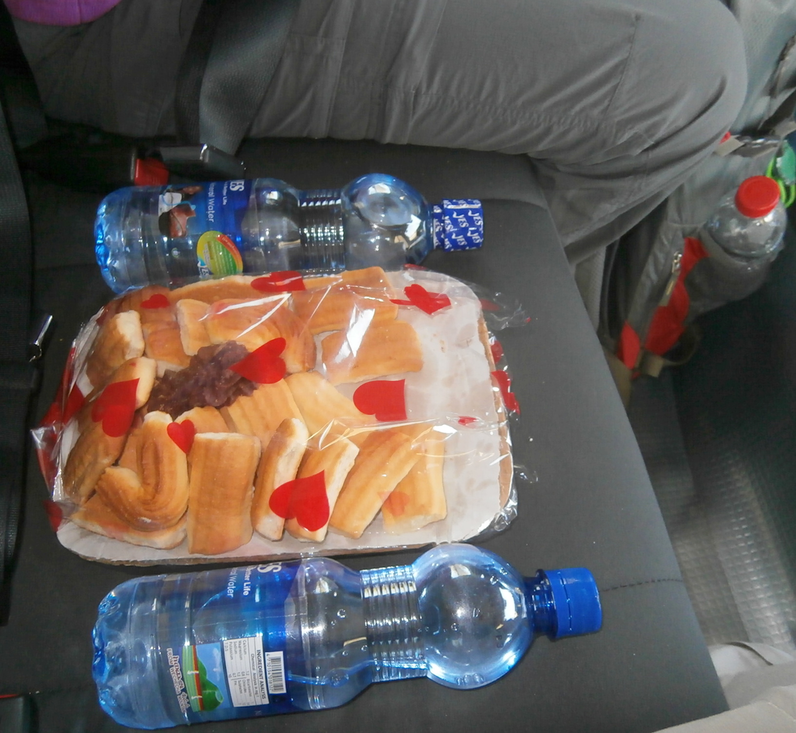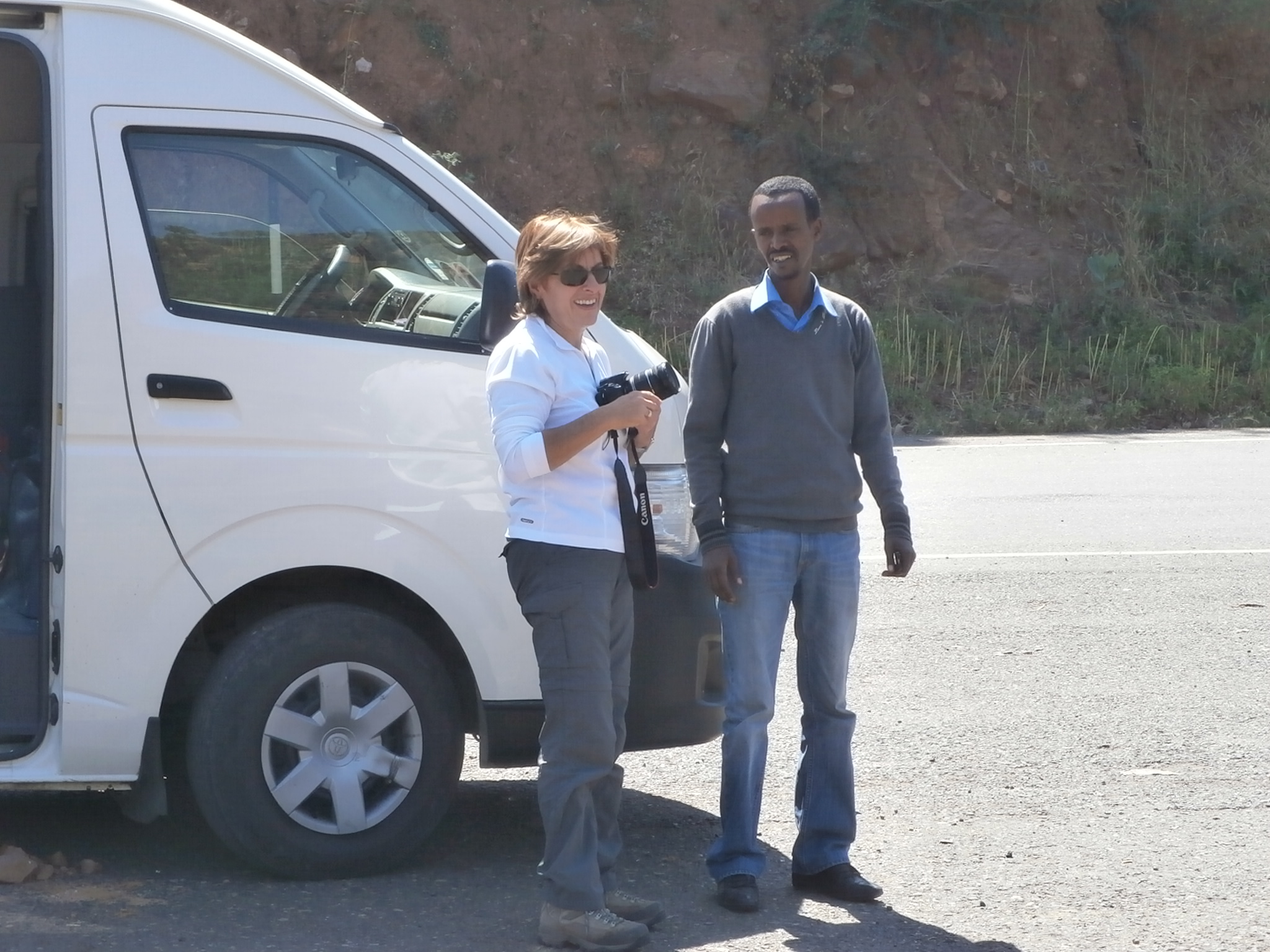 Долетели прекрасно и приземлились в столице Эфиопии в 5:40 утра по местному времени. Сделали необходимые по прибытию дела: оформление визы (20 $), пограничный контроль, покупка местной валюты — бырр и получение багажа, когда впервые за всю мою многолетнюю историю полетов у нас тщательно проверили багажные талоны. И вот мы уже на выходе, где сразу увидели худенького парнишку с плакатом: Fannie & Elena. Нас встретил наш водитель по имени Такли. Загрузились в минибус марки «Toyota», где нам было приготовлено легкое угощение — бисквиты и водичка :OLYMPUS DIGITAL CAMERA