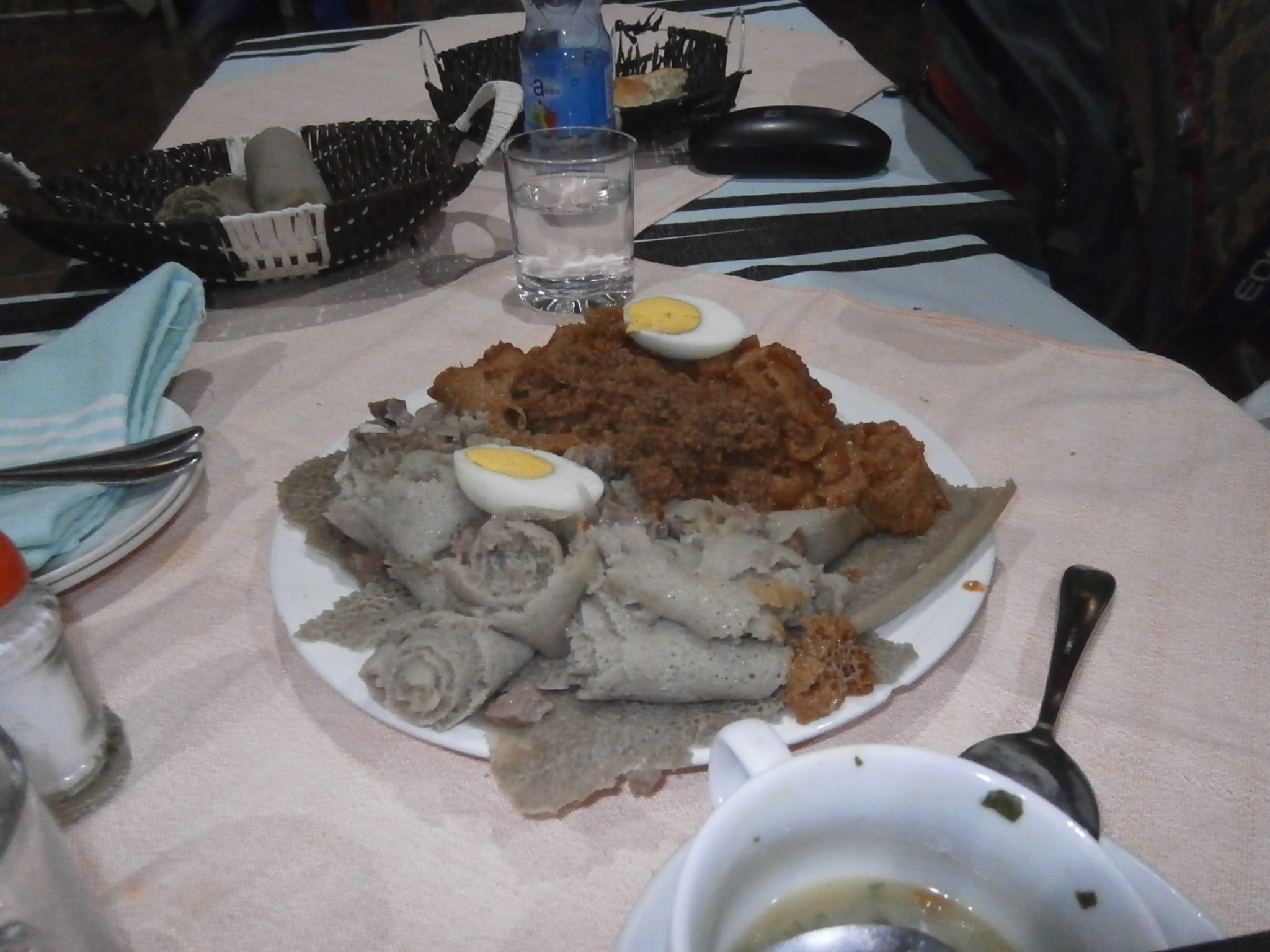 Поужинали мы там же, где вчера. Еще раз  рискнули взять  инжеру, на этот раз с пикантным острым соусом, в котором плавала одна маленькая куриная ножка  и яичко мизерного размера.