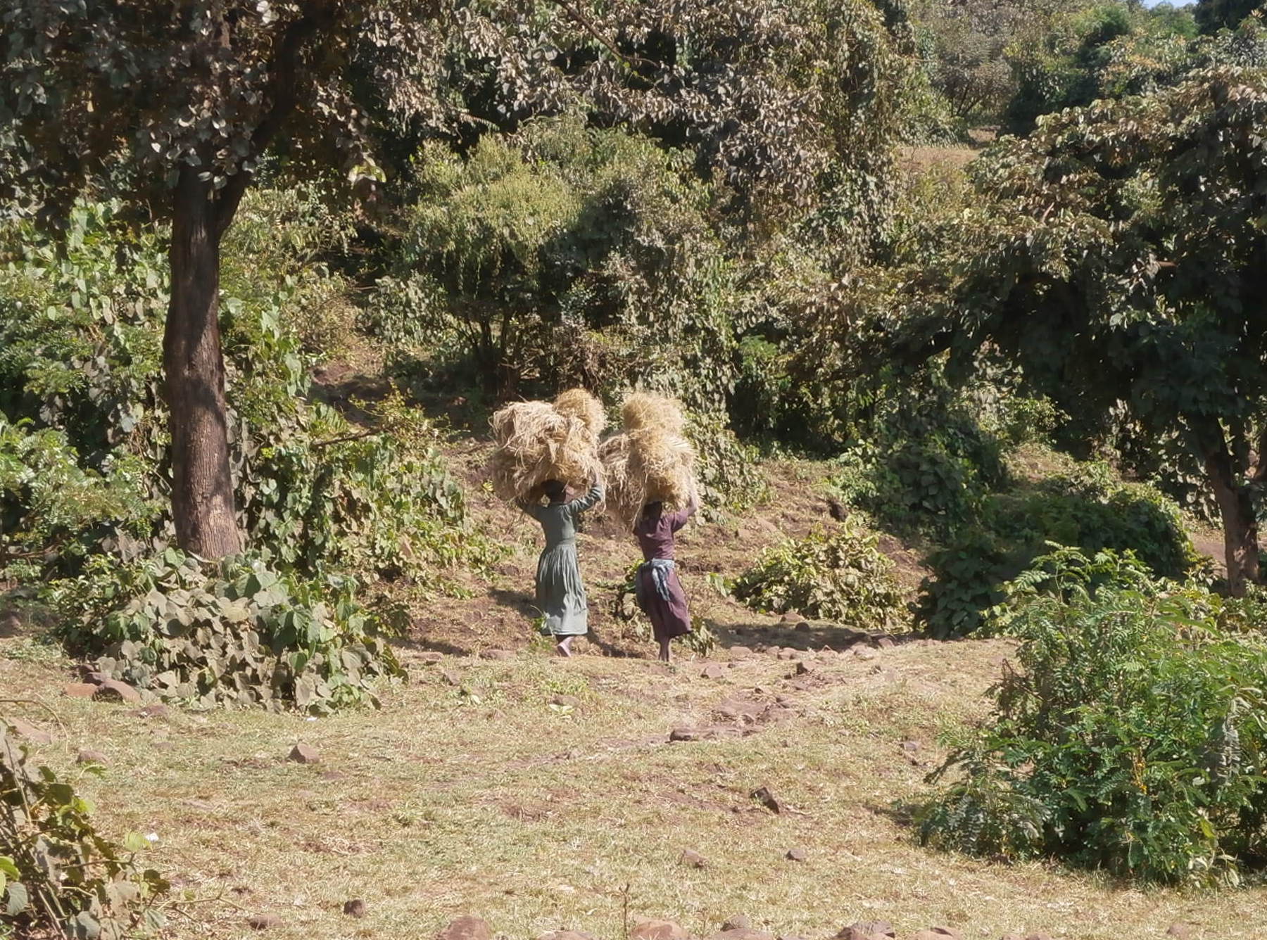 Маленькие дети тащат на спине большие и тяжелые канистры с водой. Женщины  несут на себе огромные связки дров. Незнакомая нам жизнь кипит. Люди копошатся возле лачуг, построенных из стволов деревьев и облепленных грязью, смешанной с листьями. Проехали по деревне. Прямо на улицах за швейными машинами сидят мужчины и шьют костюмы. Разве это не удивительно?! И вся эта загадочная жизнь происходит на фоне красивейших пейзажей: