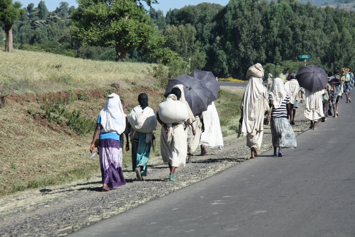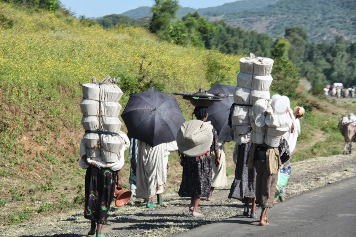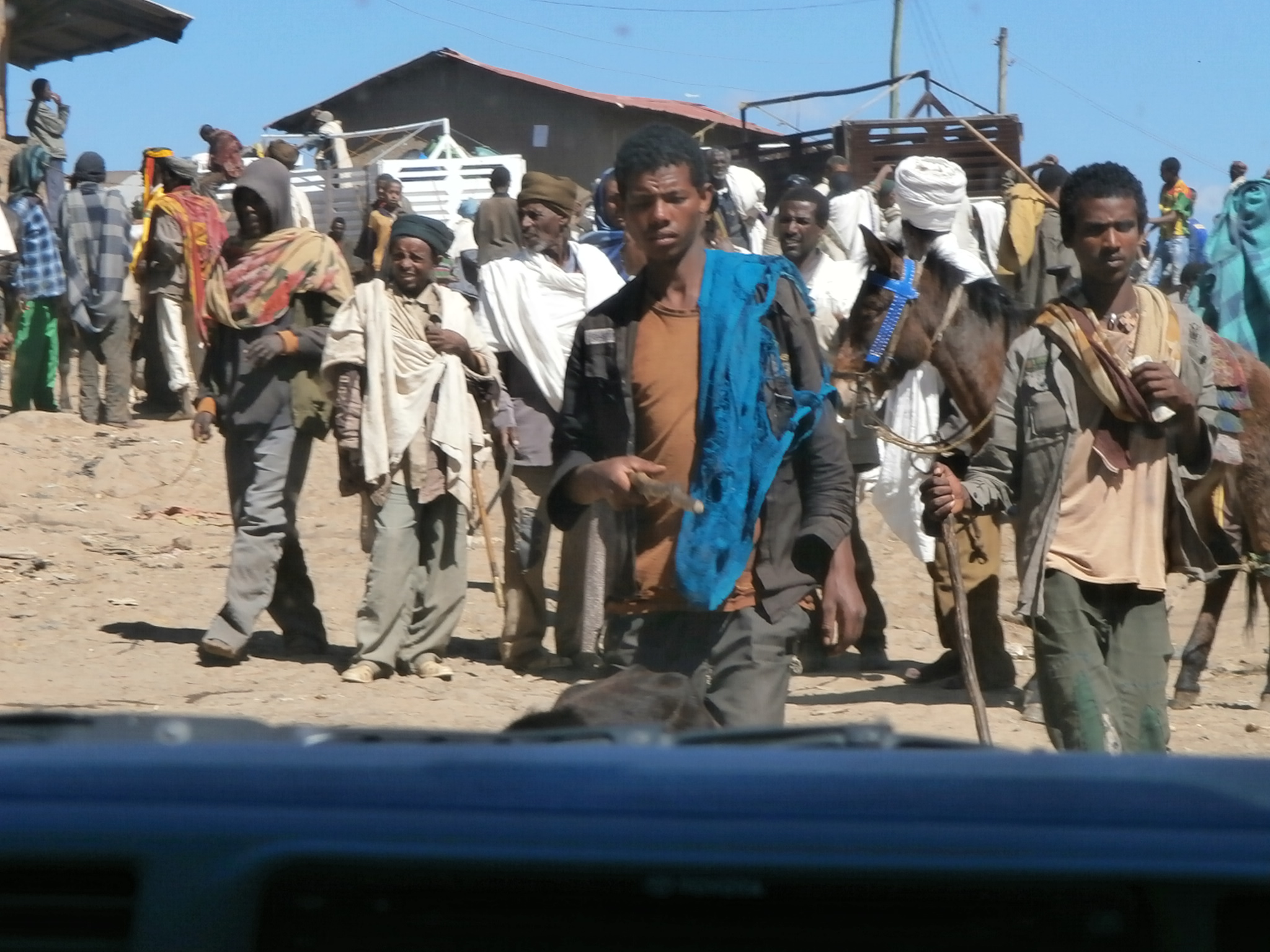 А за окном все та же пьеса — массовое переселение народов. Беспрерывно идущие люди, погоняющие коров и ослов, несущие ягнят, кур и мешки с урожаем на голове… Улыбающиеся и машущие руками дети… Сегодня суббота, рыночный день, и люди идут и идут эти нескончаемые километры, чтобы дойти до рынка и что-то продать, купить, обменять. Очень колоритные личности! Во время этой утренней поездки из Бахар-Дара в Гондар происходящее на дороге действие достигло своего апогея. «Кино», которому нет конца. И, пожалуй, самое интересное и содержательное, из всего увиденного впоследствии в Эфиопии. Вот бы кто-нибудь взял, да и просто снял этот людской поток на камеру. Получился бы интереснейший фильм!