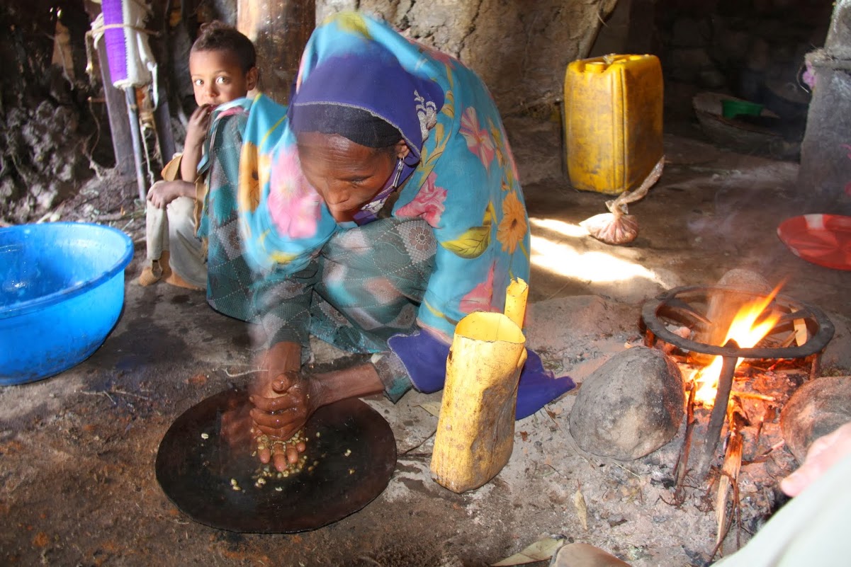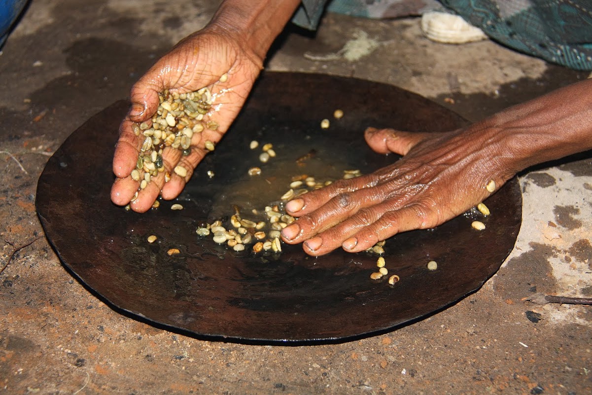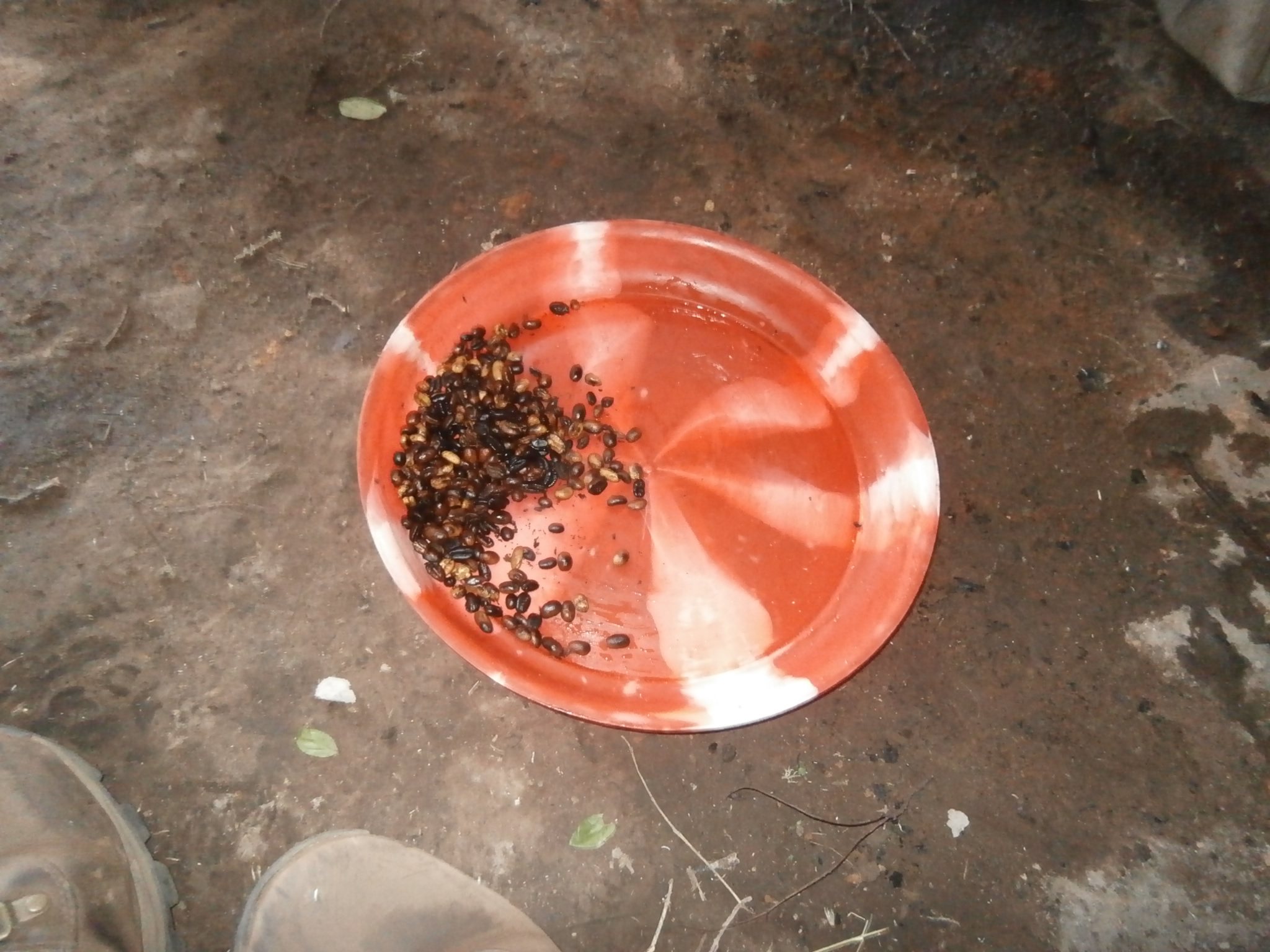 Нас встретила худая женщина, на вид лет сорока. За спиной у нее сидел ребеночек, привязанный большим платком. Здесь почти каждая женщина носит за спиной ребенка. Она разожгла очаг посреди дома и после этого помыла руки. Вода в канистре, и носят её из ручья. Затем она принесла зёрна кофе, светлые, не обжаренные. Помыла их и обжарила на костре.