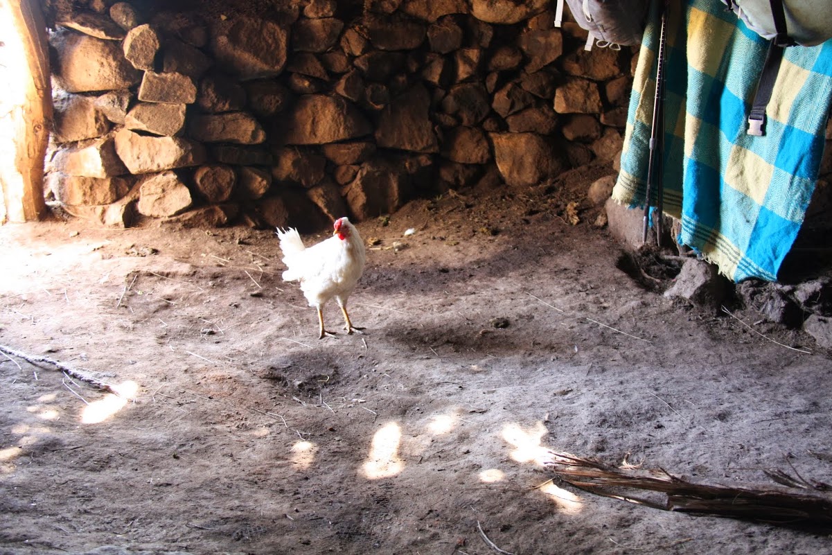 Пол земляной. Электричества, разумеется, нет. Внутри дома отгорожен угол для скотины и кур. Куры разгуливают тут же.