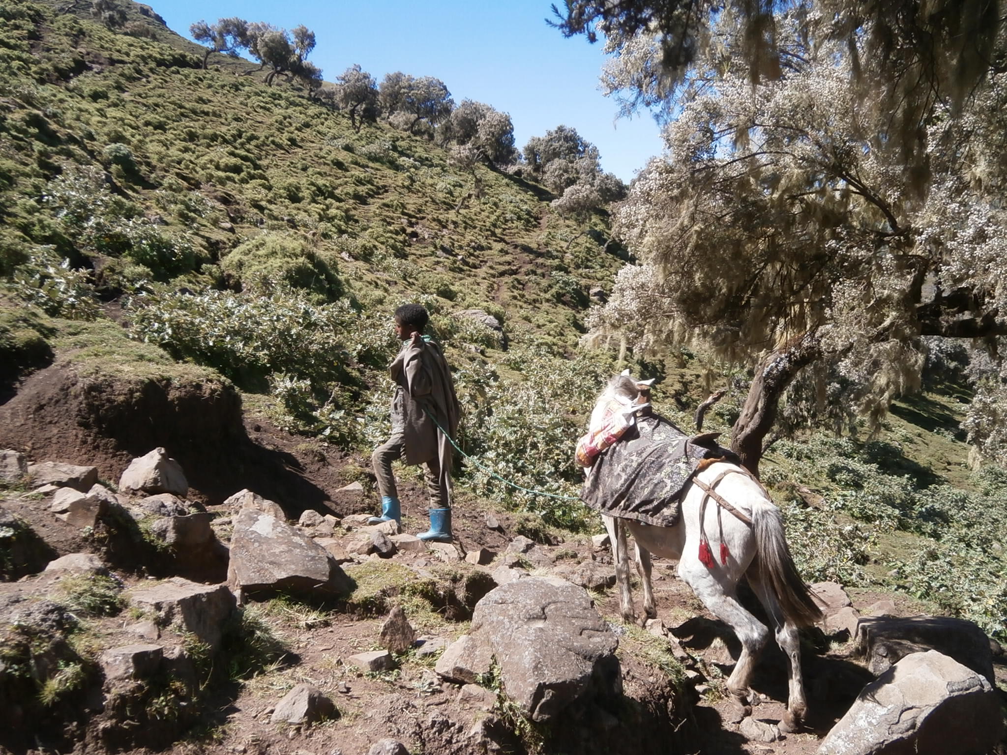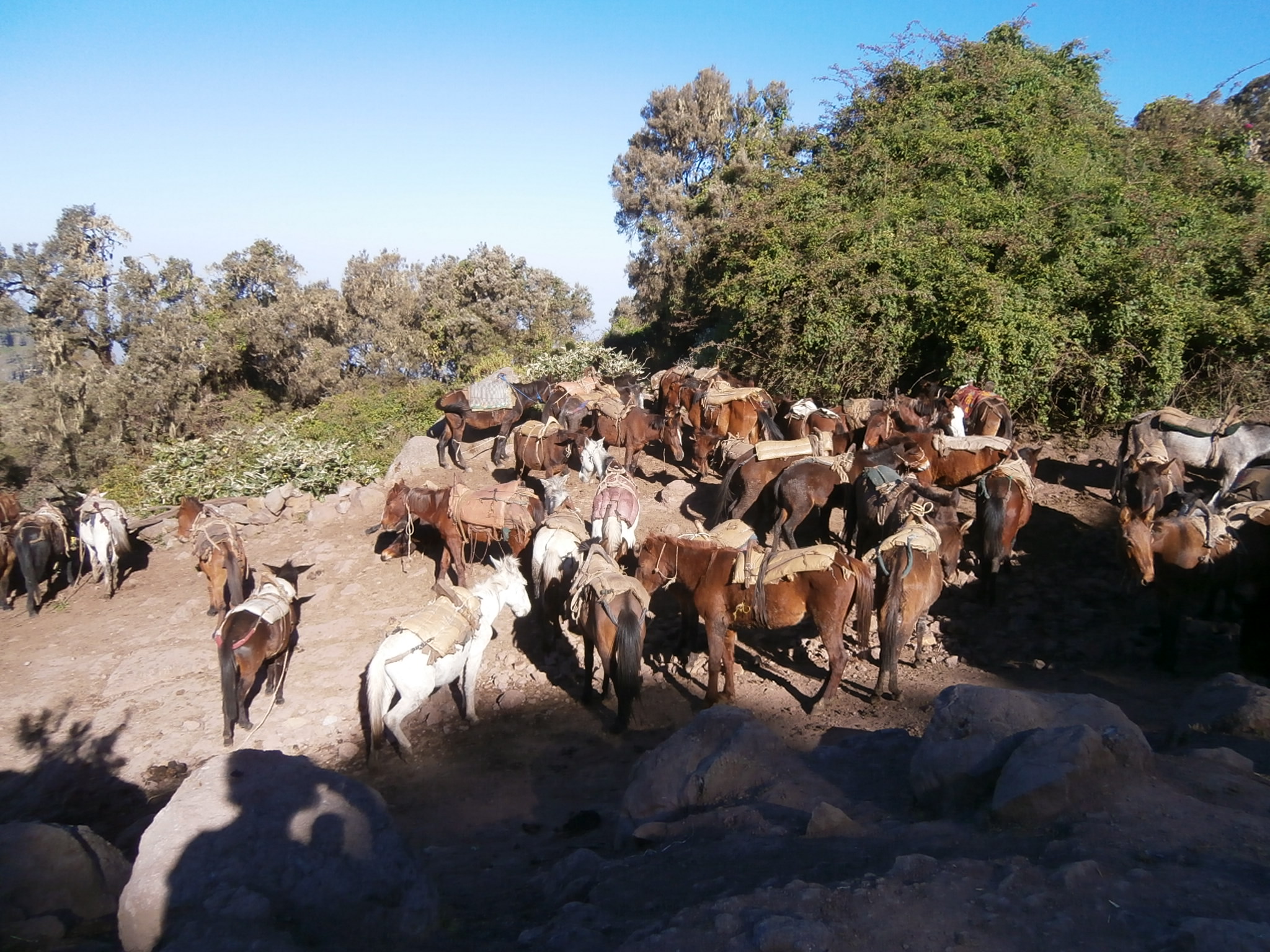Но в Эфиопии всё делают, как положено. На одного мула грузится не более 45 килограммов. Наши пожитки весили 75 кг, поэтому пришлось взять двух мулов. Оказалось, что за мула нужно платить отдельно, а за его погонщика, мулмэна — отдельно. Получилось, что нужно было заплатить им на месте наличными 1040 бырр. У нас были только купюры по 100 бырр. А сдачи они не дают. Но мы не хотели давать этой «организации перевозок » лишние 60 бырр. Дело принципа. И тут наш охранник Дассеу достал свои мятые, видавшие виды, деньги. Он насчитал 40 бырр, больше у него и не было, и отдал им за нас. Это было трогательно. Мы потом вернули ему эти деньги, да не 40, а 100. Он был просто счастлив и начал улыбаться, но только Фане 🙂