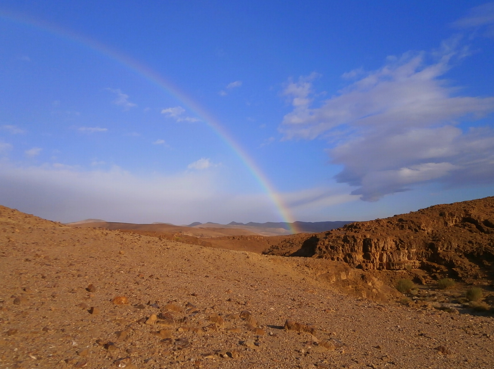 Выехали очень рано. Пока ехали, дождь не прекращался ни на минуту. Накануне я убеждала своих спутников, что дождь — это у нас в центре, а там, в Араде — другой мир. Но вот мы приближаемся к Араду, а дождь только усиливается. Я уже и сама засомневалась в своих словах. Но отступать некуда, едем. И сразу за Арадом ситуация резко меняется. Дождь прекратился и солнышко, которое мы уже несколько дней не видели, сквозь облака одарило нас своим лучом. На стекло машины упало несколько снежинок (!), а на небе появилась роскошная радуга.