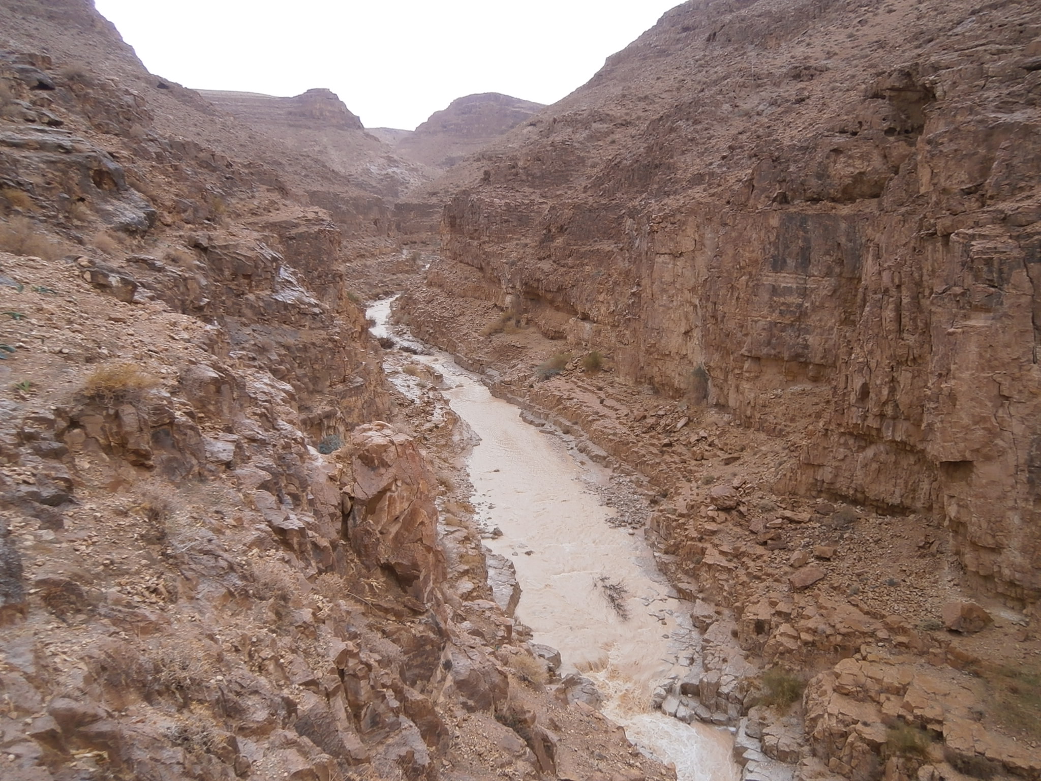 Я пробежалась немного вверх по течению, пытаясь присмотреть подходящее место для перехода. Но поток в нахале был настолько сильный, что безопасно перейти его вброд было невозможно. Однако картина текущего по пустыне нахаля была великолепна!