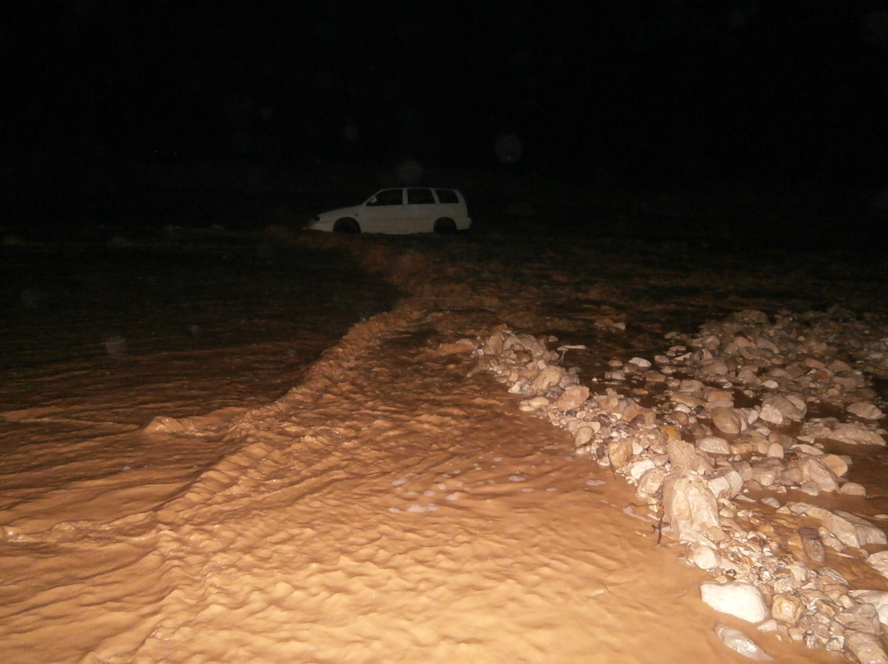 А дальше события развивались так. Вскоре приехало такси. По пути мы прихватили Сашу, который к этому времени уже прошёл километров семь, и всё на подъём. Мы с Сашей высадились возле кфар Нокдим и потопали по раскисшей от дождя джиповке к стоянке, надеясь найти там нашу машину в целости и сохранности. Юля с Мишей поехали на такси в Арад с тем, чтобы ждать нас на автозаправке в тёплом магазине Мента.