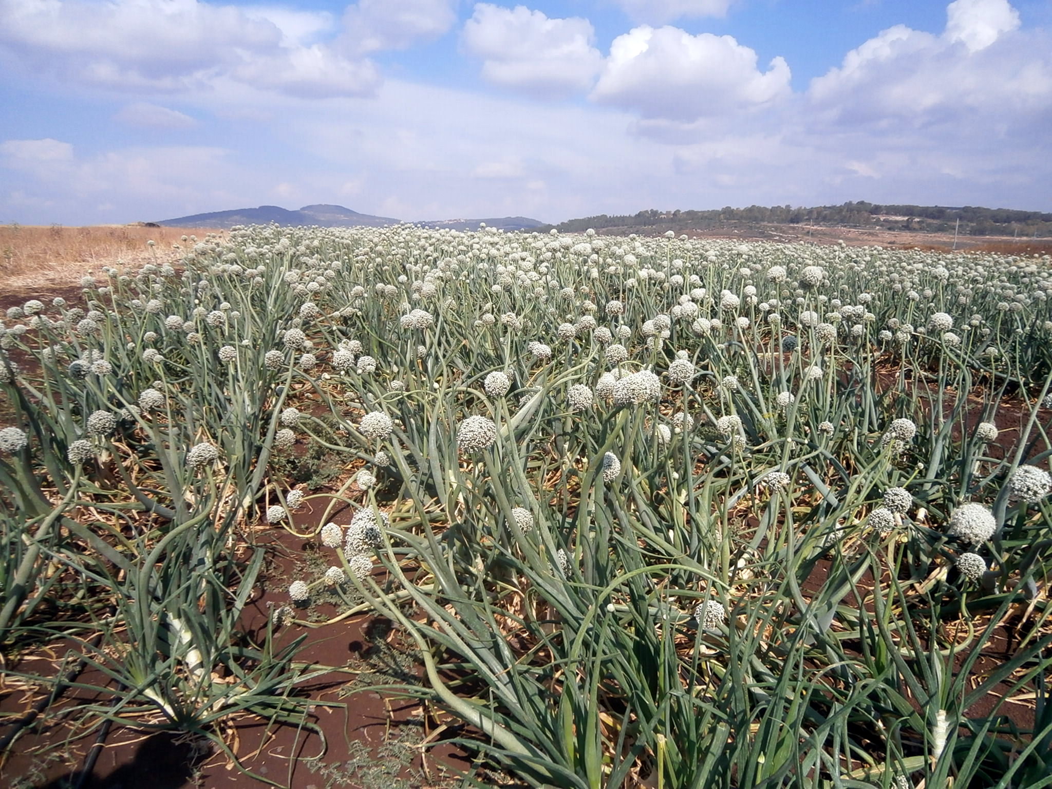 Мы немного поискали, как выйти из кибуца на нужную дорогу, прошагали по кромке пшеничного поля по мягкой после дождя земле и вот — неожиданность: луковое поле небывалой красоты.