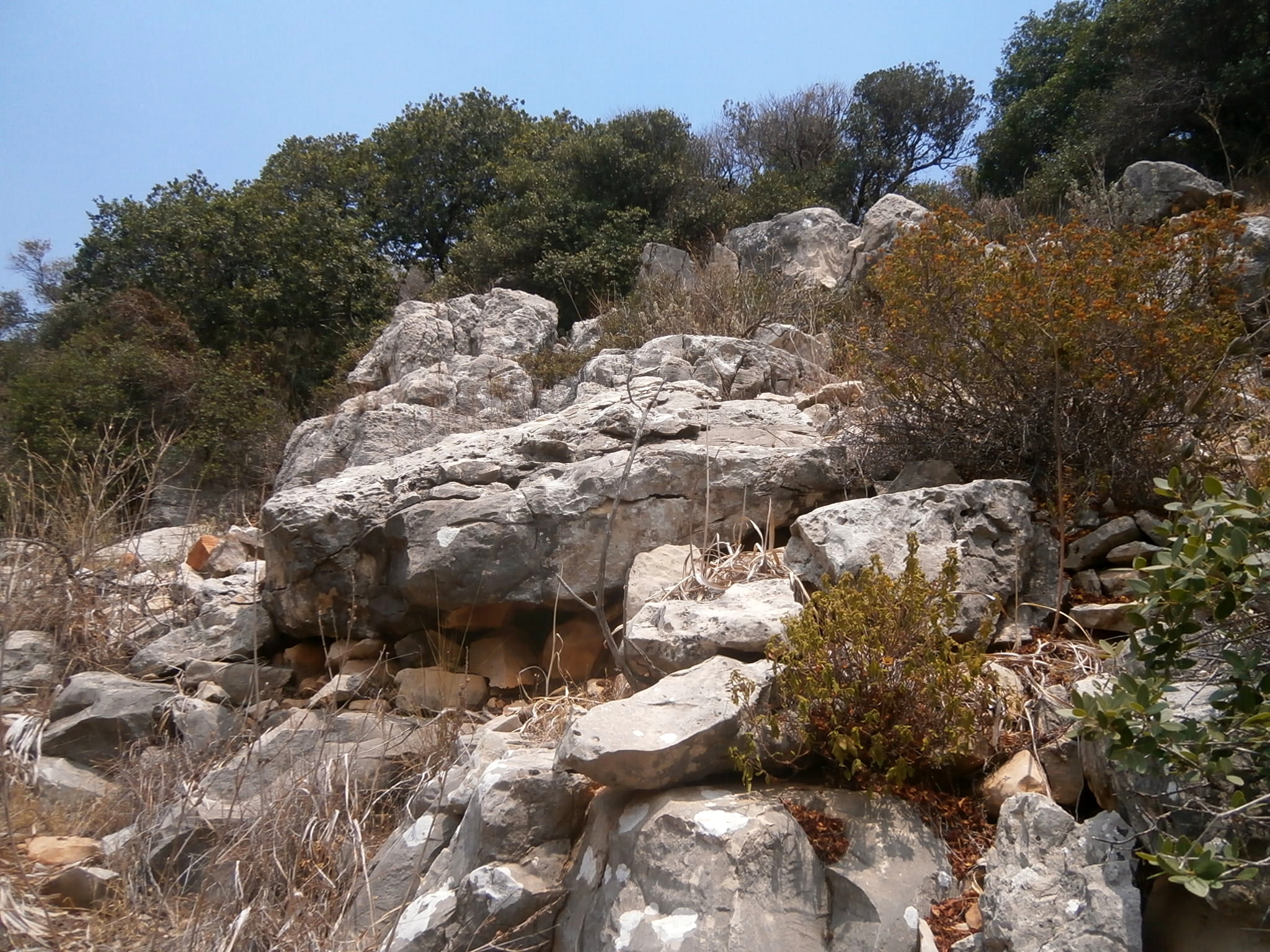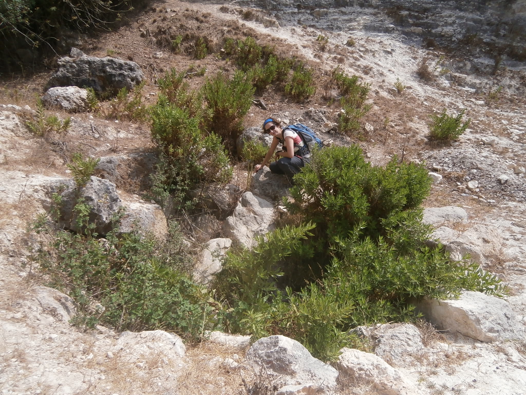 Идти дальше было некуда, нахаль закончился и превратился в карьер, a мы стали решать, как лучше вернуться к шоссе. Можно было пойти тем же путём, что и пришли, и это — менее интересно. А можно попытаться залезть на довольно крутую гору по правую сторону нахаля и выбраться к шоссе неизведанным маршрутом, без разметок и троп. Был совсем небольшой риск в том, что склон будет слишком крутой, скалы на пути слишком высокие, и мы не сможем взабраться.
