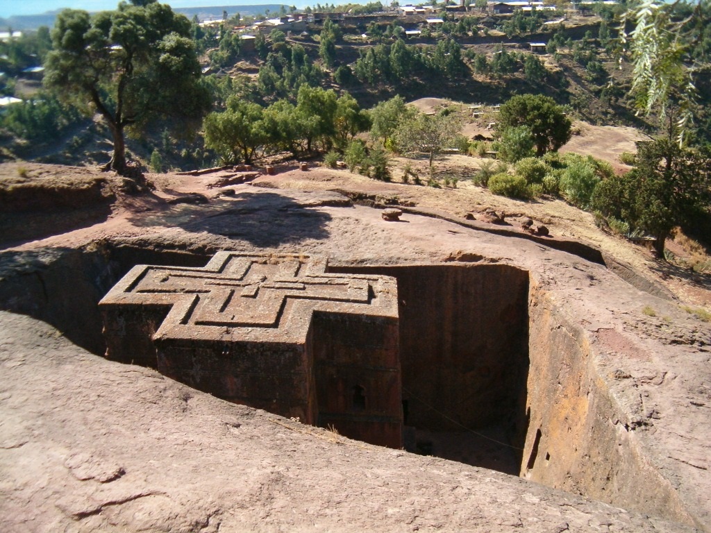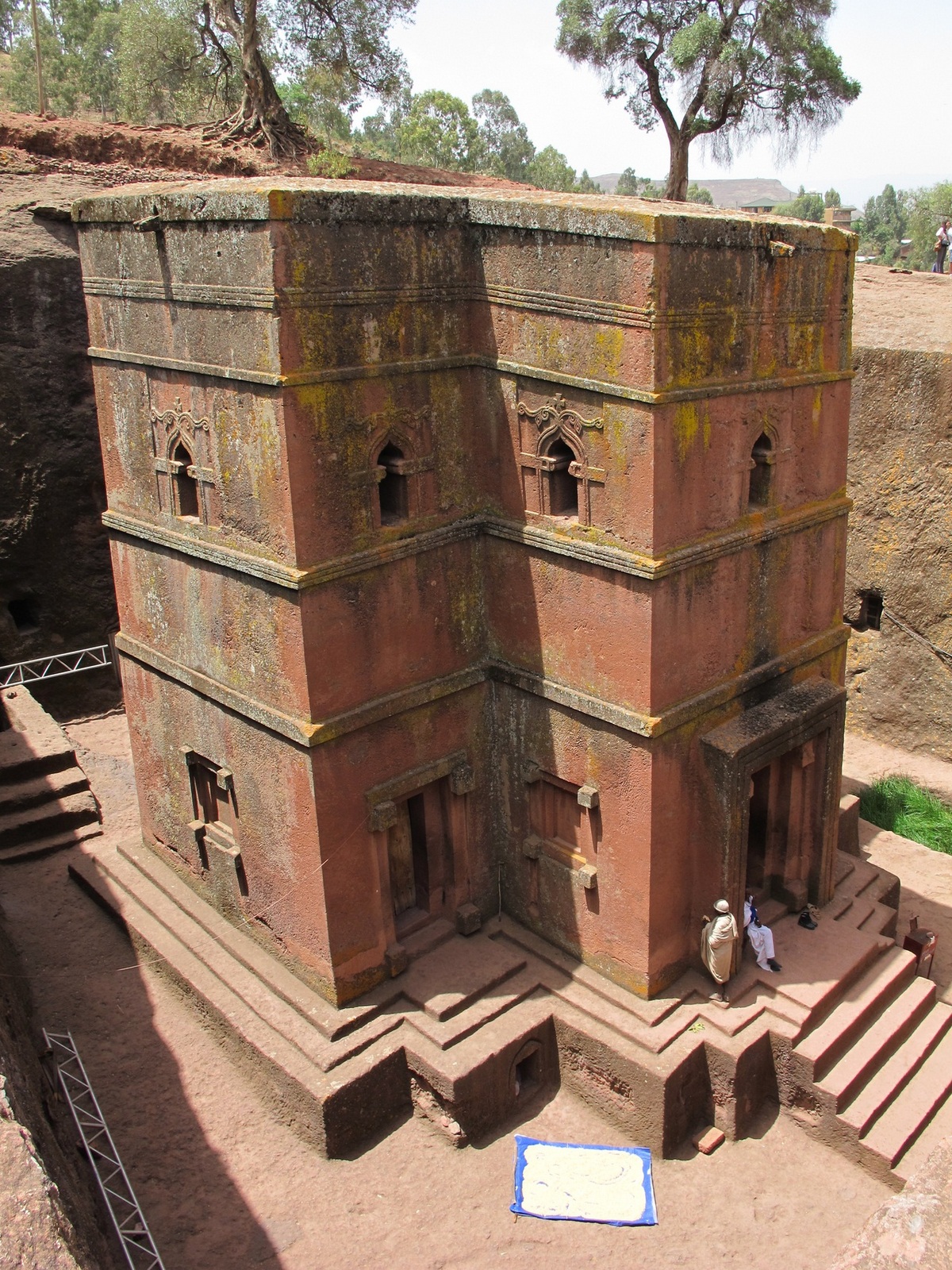 Завершив поиски почты, мы пошли осматривать самую знаменитую церковь Лалибелы — Сент-Джордж. Выглядит она очень необычно. В скале высечен симметричный крест высотой 18 метров, а внутри креста — церковь. Крыша церкви расположена на уровне поверхности земли, сама-же церковь стоит в глубокой яме, и спускаться к ней надо по узкому проходу, прорубленному в скале. Церковь Сент-Джордж считается восьмым чудом света, настолько она уникальна.