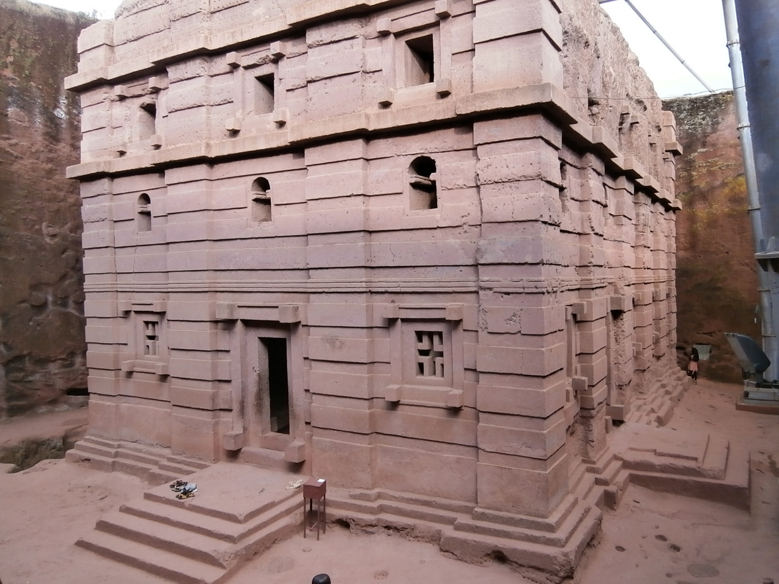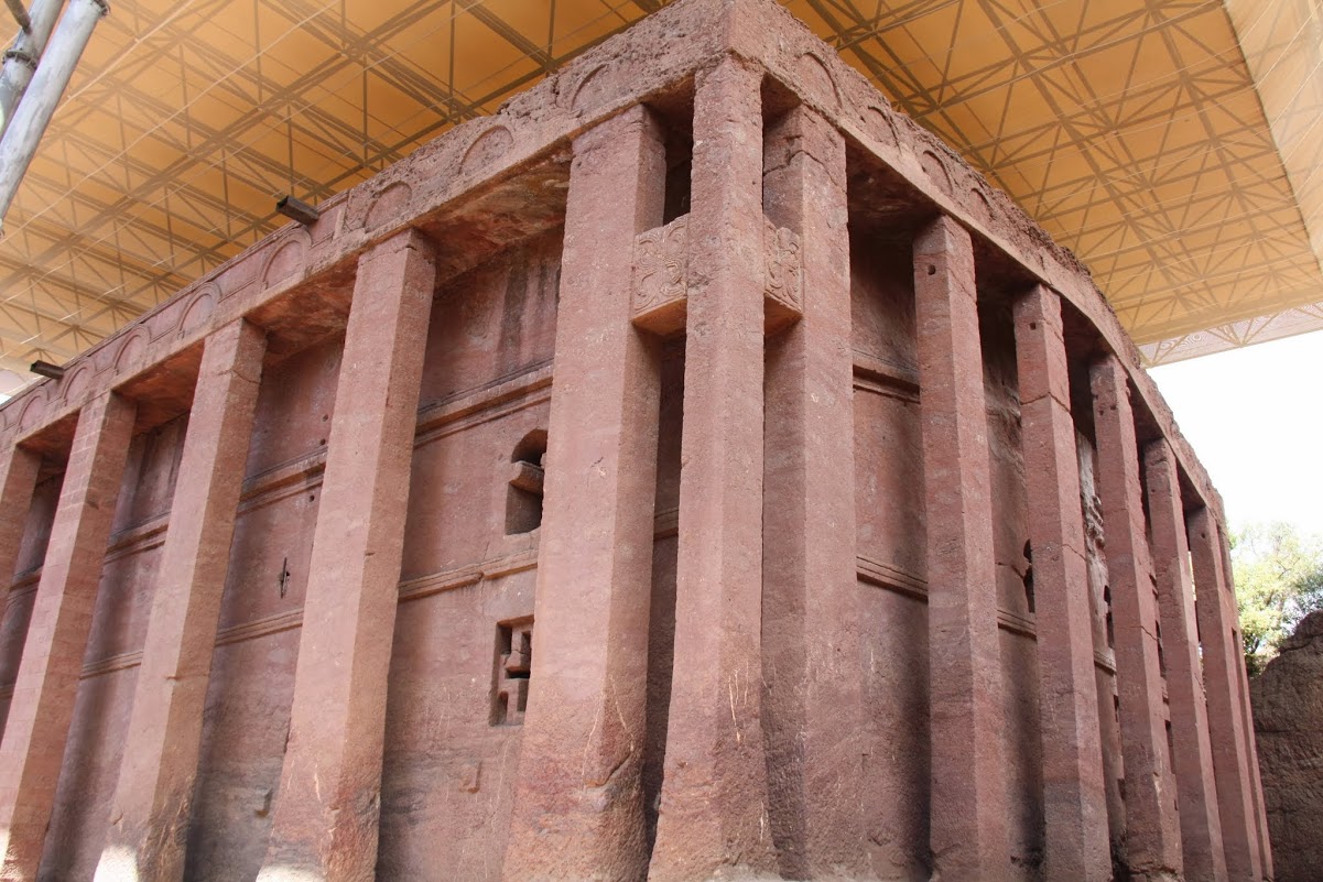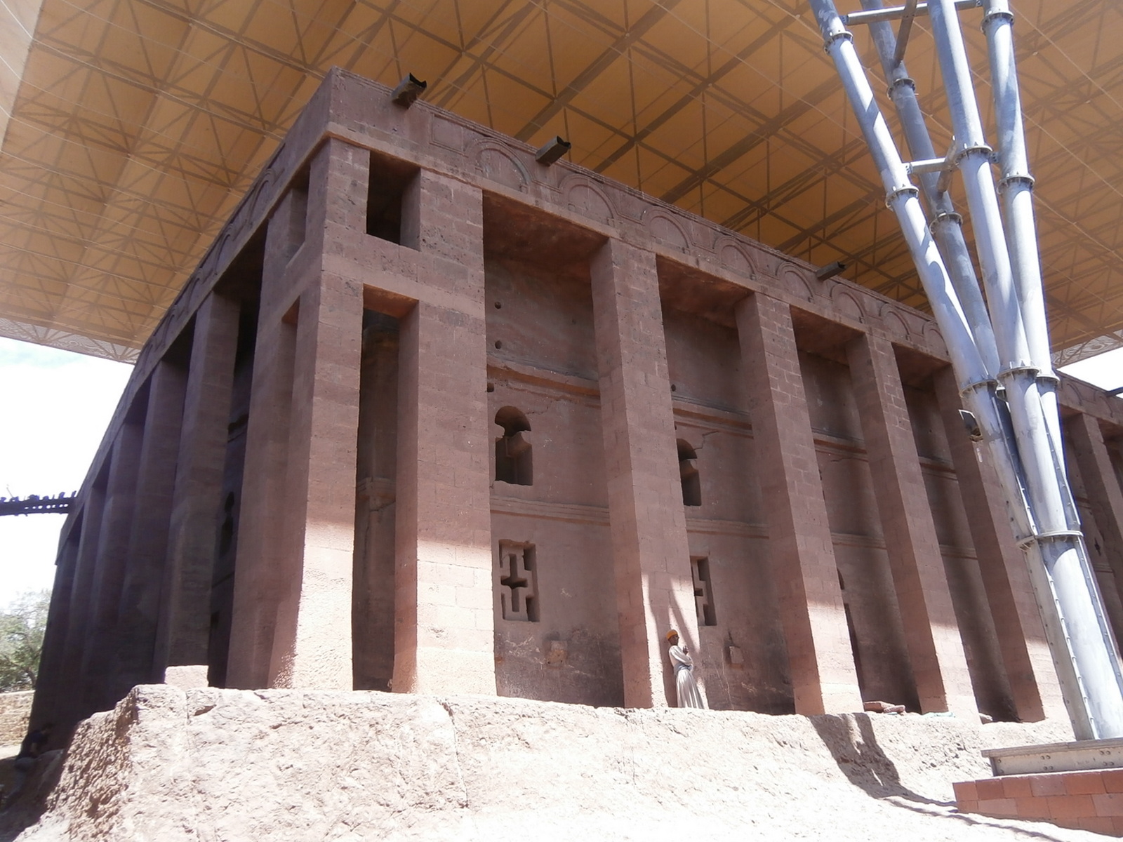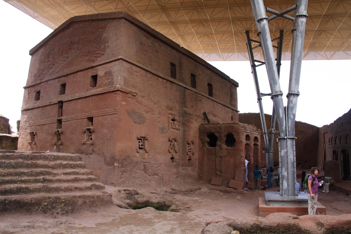 Мы зашли на территорию церквей в 11:30. А с 12 до 14 церковный комплекс закрывается на перерыв. Успели осмотреть 2 церкви. Интересно. Про каждую из них Фаня читала основную информацию в путеводителе Лонели Планет и вкратце пересказывала мне. Так мы знали, на что нужно обратить внимание внутри посещаемых церквей. Все они высечены из красного монолитного камня вулканической породы. Смотрится красиво и необычно. Строили церкви 24.000 человек и копали они их сверху вниз. Потрясает, как можно это сделать? Чудеса инженерной мысли, шедевр и, действительно, достопримечательность. Недавно над главными большими церквями установили крыши. Конечно, эта конструкция портит вид и нарушает общее впечатление, но необходимо сохранить это бесценное достояние для будущих поколений.