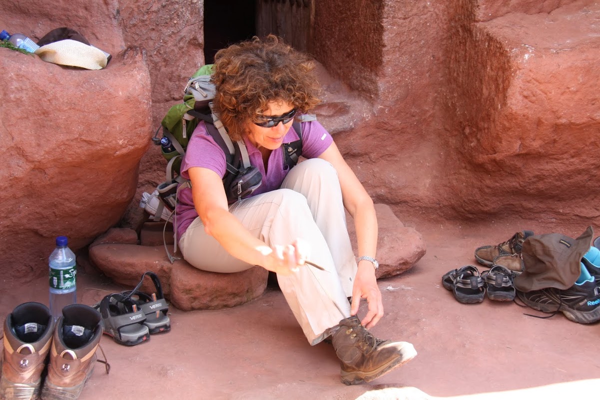 Затем немного передохнули, выпили кофе и — снова в путь. Поскольку идти особо было некуда, посетили ещё раз главную туристическую достопримечательность города — церкви из красного камня. Посмотрели на церкви сверху, пройдя по тропинке по скале вокруг них. Осмотрели небольшой музей. После этого поднялись на невысокую гору Тавор в центре города, уже знакомую нам, и погуляли там. За нами было увязались 4 местные девчонки, но, откуда ни возьмись, появился полицейский, и они сразу убежали. А мы смогли насладиться тишиной, понаблюдать за птичками и полюбоваться закатом.