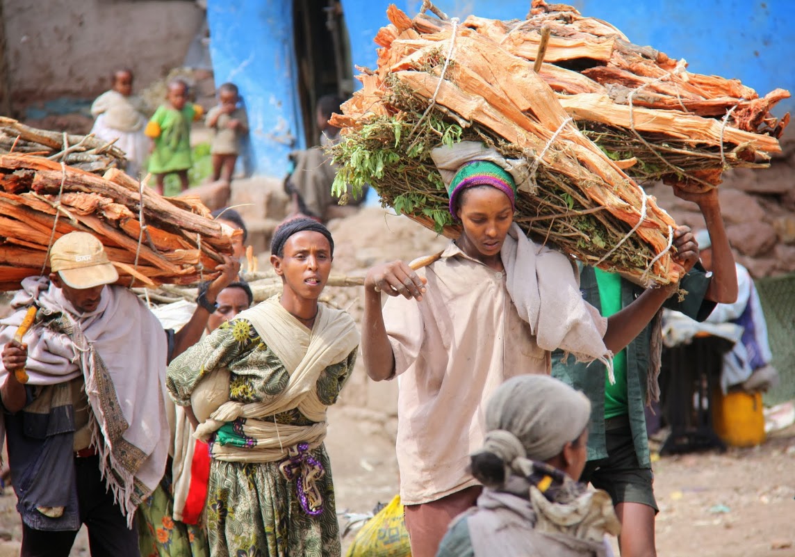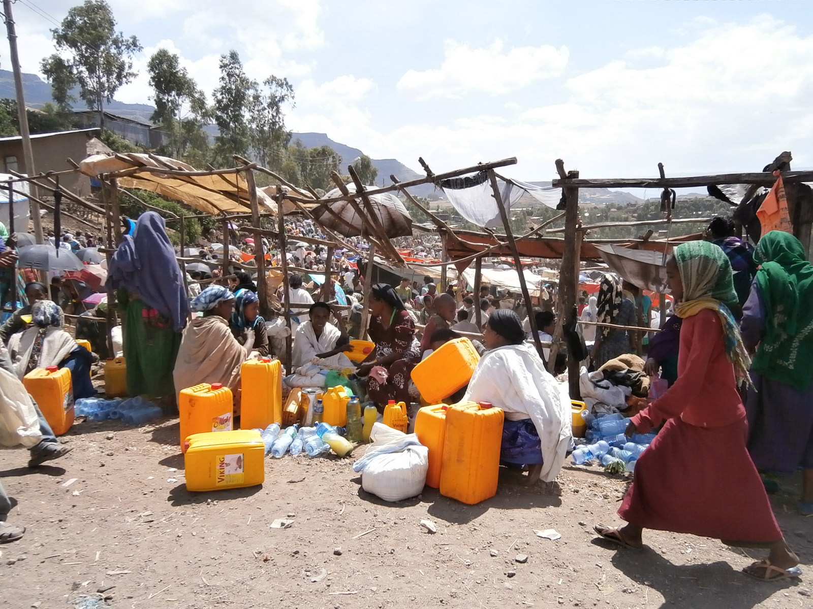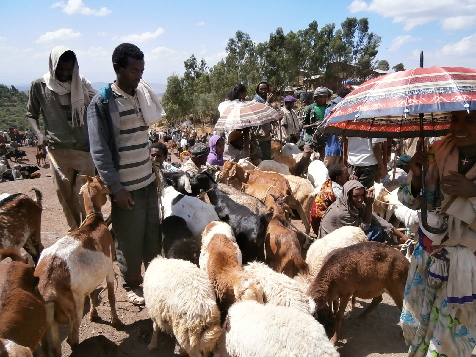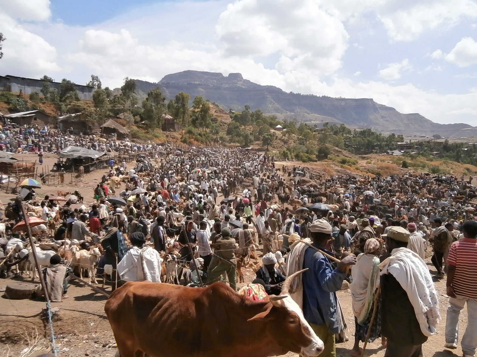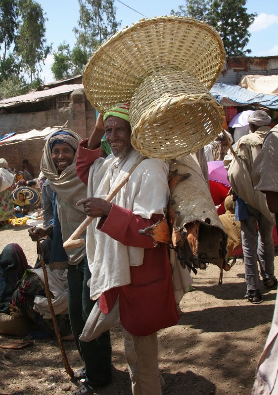 Во время спуска к Сент-Джордж мы видели издалека поток людей, идущих на рынок. Сегодня суббота, рыночный день. Многие из этих людей, видимо, шли из окрестных деревень и преодолели пешком не один десяток километров. Да не налегке, а с тяжёлой ношей на голове или на плечах. От Сент-Джорджа было отлично видно огромное скопление людей на горе. Рынок шумел, колыхался и жил своей жизнью. И мы пошли посмотреть на эту аттракцию — рынок в Лалибеле. Колоритно! Продают всё, что нужно для их незатейливой простой жизни. Коров, коз, пшено, приправы, канистры для воды, пустые пластиковые бутылки, кухонную утварь, текстиль…Мы тоже сделали покупки — банданы. Одна из них, с символикой Эфиопии и веточкой марихуаны, была куплена мною в качестве подарка-сувенира.