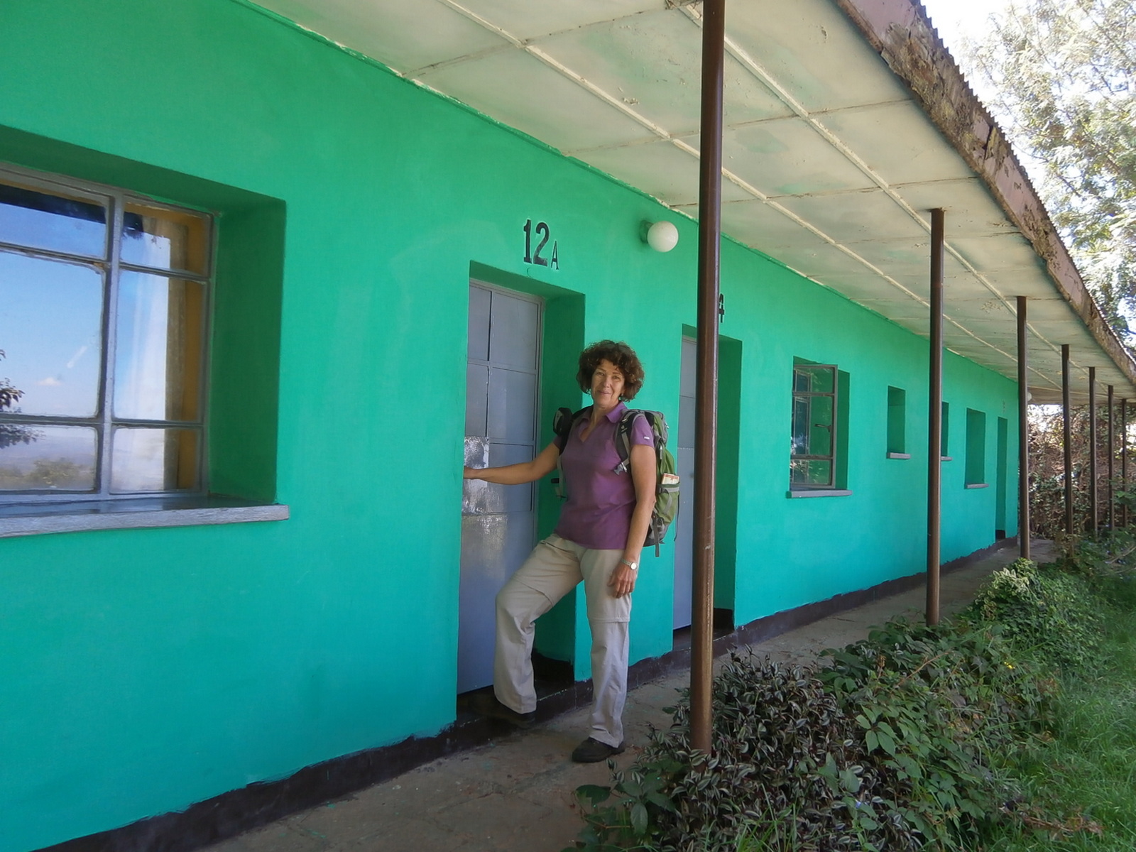 В аэропорту Лалибелы, в зале прибытия стояли представители гостиниц и зазывали, каждый к себе. Мы предварительно выбрали гостиницу Амман (по рекомендации книги Lonely Planet). Приехав в город и осмотрев её, мы решили, что она нам не нравится. И отправились в отель Seven Olives, расположенный неподалеку. Здесь нам понравилось больше. Напоминает турбазу. Одноэтажные домики, рядом лужайки с травкой и красивый вид на горы и долину.