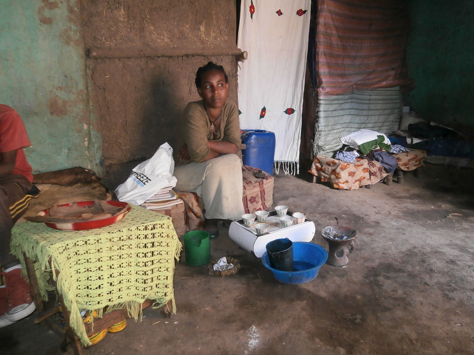 Ну что можно сказать. Условия жизни напоминают те, которые мы видели, когда были в гостях у местной семьи во время трека в горах. Земляной пол. По углам лавки. Вокруг гуляют куры. Дома были мама (занималась по хозяйству на входе в дом), сестра и старший брат. Я заметила, как сестра дала брату деньги, и вскоре тот вернулся с небольшим мешочком необжаренных светлых зёрен кофе. Сестра приготовила кофе по всем правилам и в том же порядке, как мы уже видели, когда были в гостях во время трека. Наливали кофе нам три раза. Таков эфиопский обычай: за удачу, за любовь и к богу. К кофе подали традиционную инжеру.