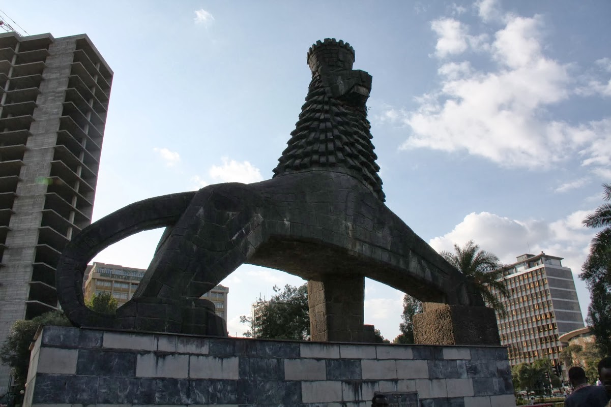 Выйдя из Raz Hotel, мы пошли вверх по улице Черчилля в направлении центра города к месту, называемому Piazza. Рядом с нашей гостиницей располагался  Национальный Театр, и мы даже подумали: «А не сходить ли нам на представление?»  Но дальше дум дело не пошло…За театром находится площадь Хайле Селассия, последнего императора Эфиопии, считающегося последним из династии потомков царя Соломона. На площади установлена симпатичная статуя льва — Арье Еуда. Лев — это главный государственный символ Эфиопии.