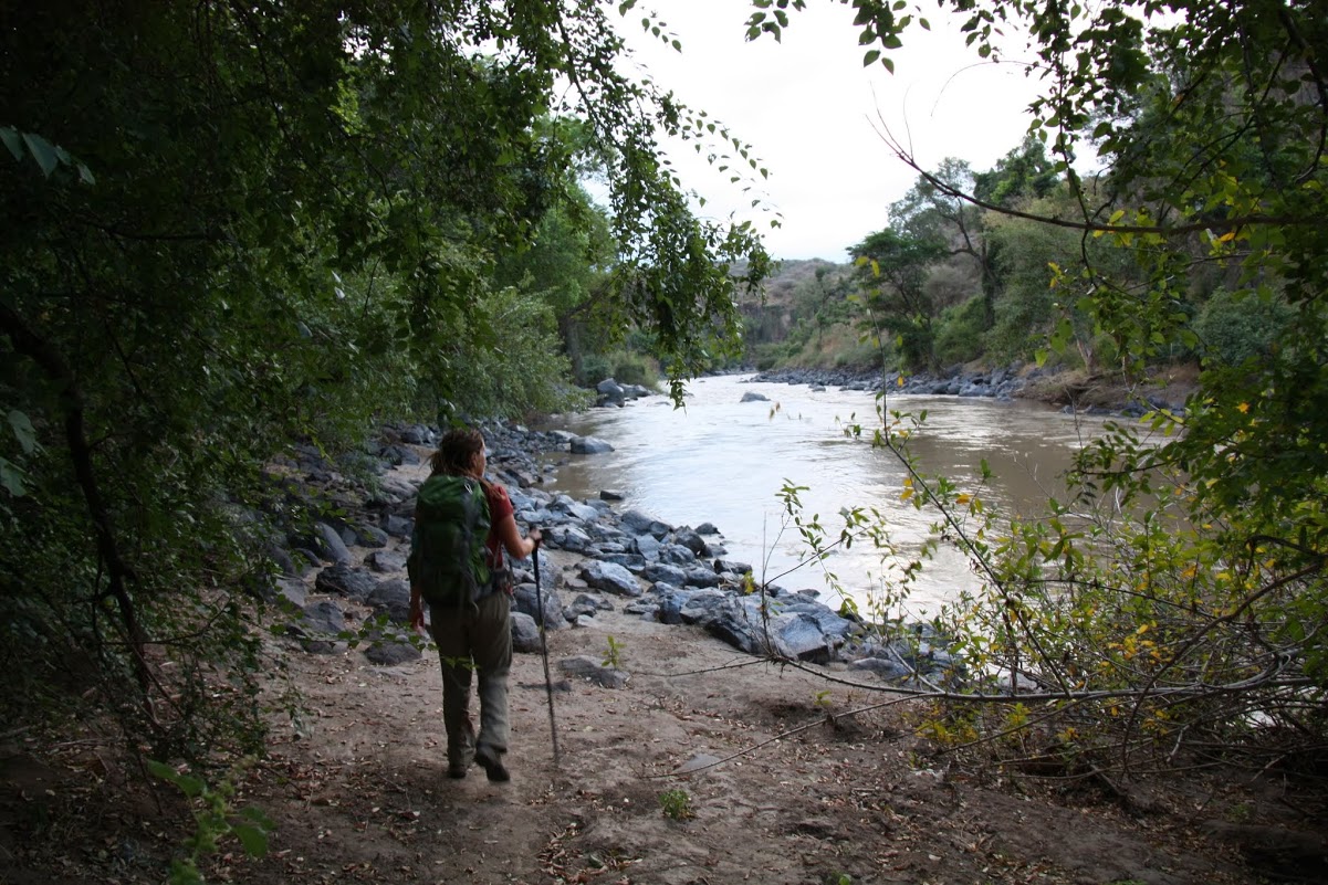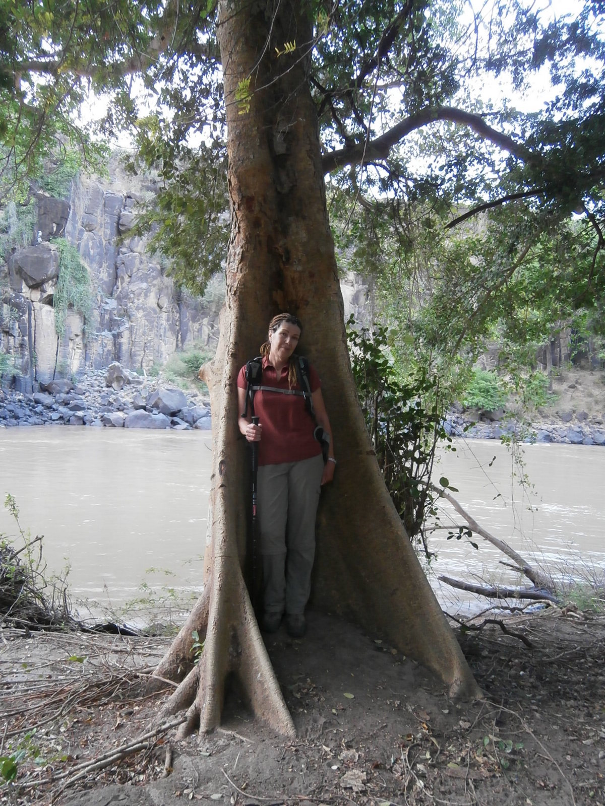 Далее мы пошли вдоль реки Аваш, вниз по течению, по утоптанной тропе. Длина реки Аваш — 1200 километров, и в ней водятся крокодилы. Крокодилов мы не видели, но осторожность соблюдали и к воде особо не приближались. Правда я всё же потрогала водичку, она была очень тёплая.