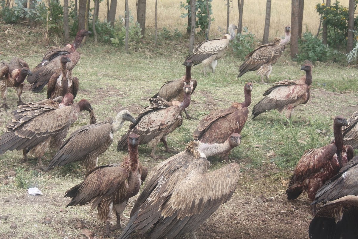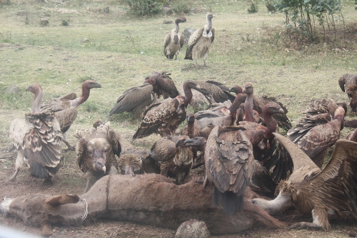 По пути мы видели редкое зрелище. Крупные хищные птицы слетелись на падаль, бедного павшего ослика. Как видно, это были африканские грифы. И вся эта сцена происходила  прямо у дороги.