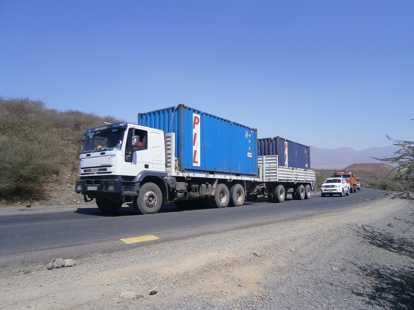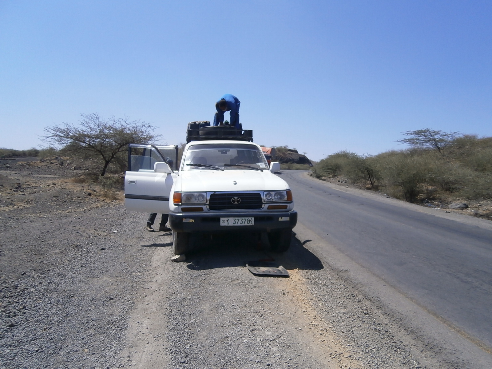 Картины за окном разительно отличаются от того, что мы видели и чем были так поражены во время поездки из Бахар-Дар в Дебарк и в национальный парк Semien Mountain. Ни тебе потока идущих и несущих всевозможные интересные вещи людей, ни тебе стад коз, овец, коров, смело разгуливающих прямо по дороге… Сегодня всё, что мы видим из окна джипа, напоминает родные Палестины, что-то похожее на район Беер-Шевы. Пейзажи и природа навевают воспоминания о дороге на Эйлат. Люди неплохо одеты, а главное — обуты. Босиком, как на севере, здесь никто не шастает. Нищенски выглядящих очень-очень мало. В общем, всё выглядит обычно, и нет того колорита, который нас так заинтересовал и вызвал сильнейший шок. Продвигались мы с большим трудом, со скоростью черепахи. Вся дорога была забита тяжёлыми грузовиками. Где те пустые дороги севера, по которым кроме коров и коз почти никто не передвигается, лишь иногда проедет автобус или маршрутка, битком набитые людьми?! Дело было в том, что шоссе, по которому мы ехали — это единственная транспортная артерия, соединяющая Адис-Абебу с Джибути. А Джибути — это крупнейший порт и единственный для Эфиопии выход к морю. Хоть это и другое государство, есть международное соглашение, позволяющее Эфиопии пользоваться портом в Джибути. Поэтому дорога туда никогда не бывает свободной, и на ней идёт интенсивное движение грузовиков в обе стороны. Было немало разрушенных и разбитых участков (какое шоссе выдержит такую нагрузку?!), дорога была перекрыта на ремонт, и приходилось ехать прямо по бездорожью. Пыль, выхлопы, смог — не самые приятные впечатления этого  утра.