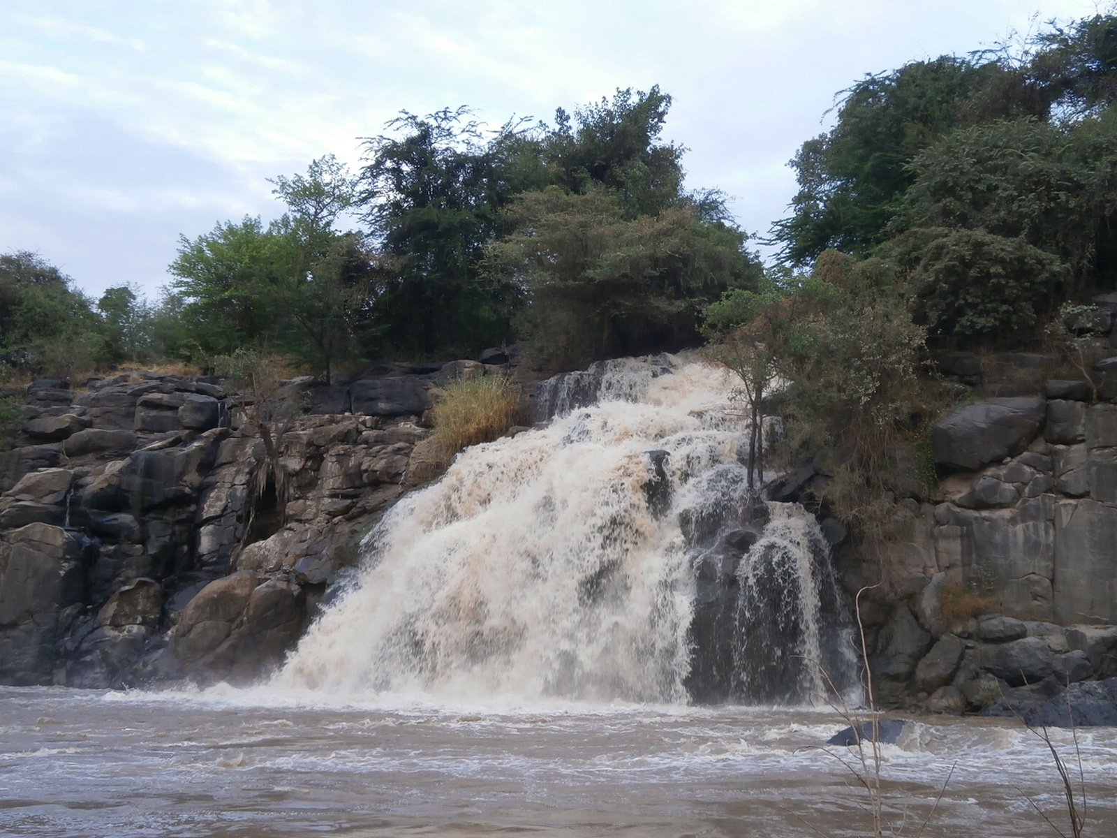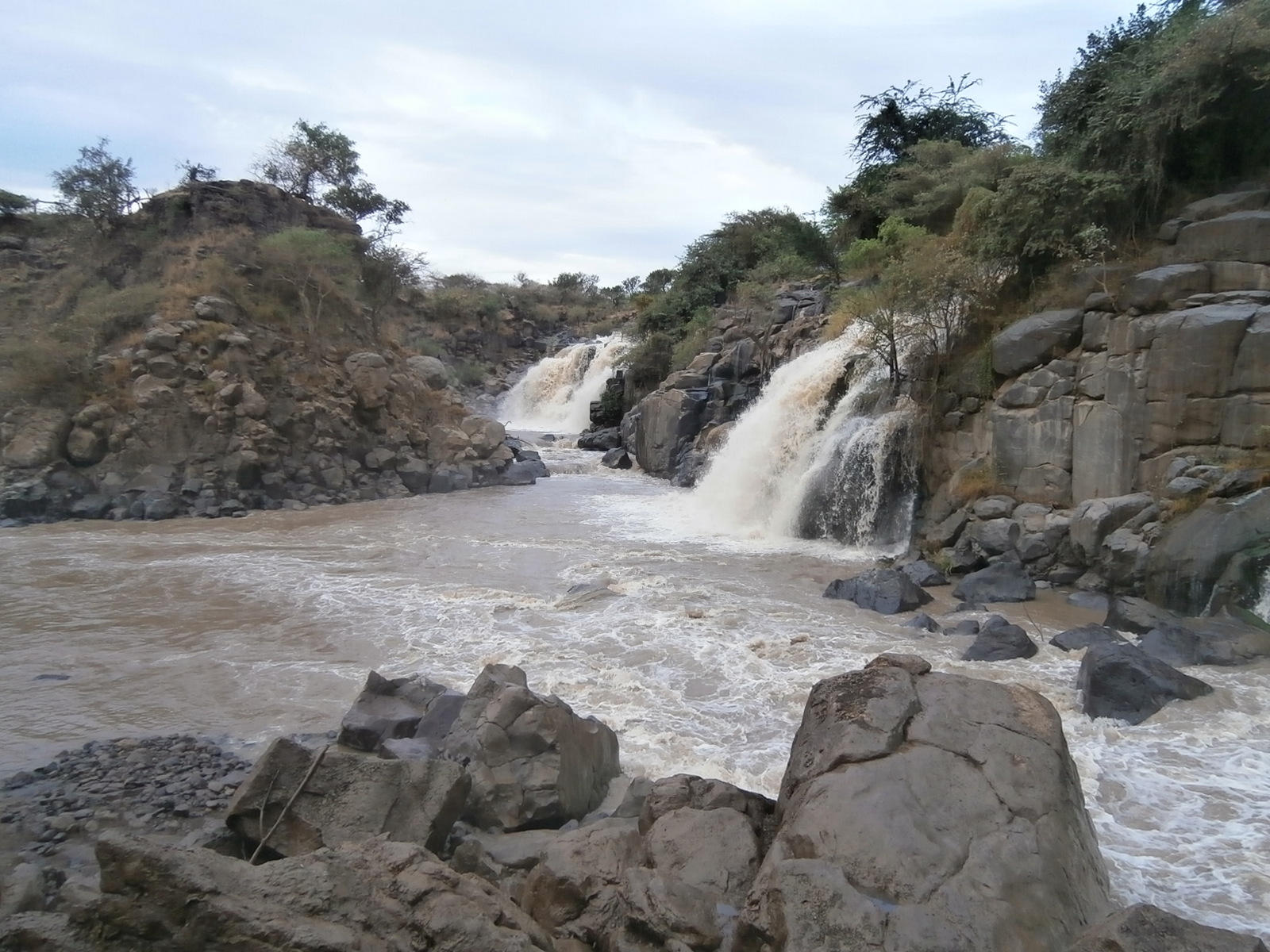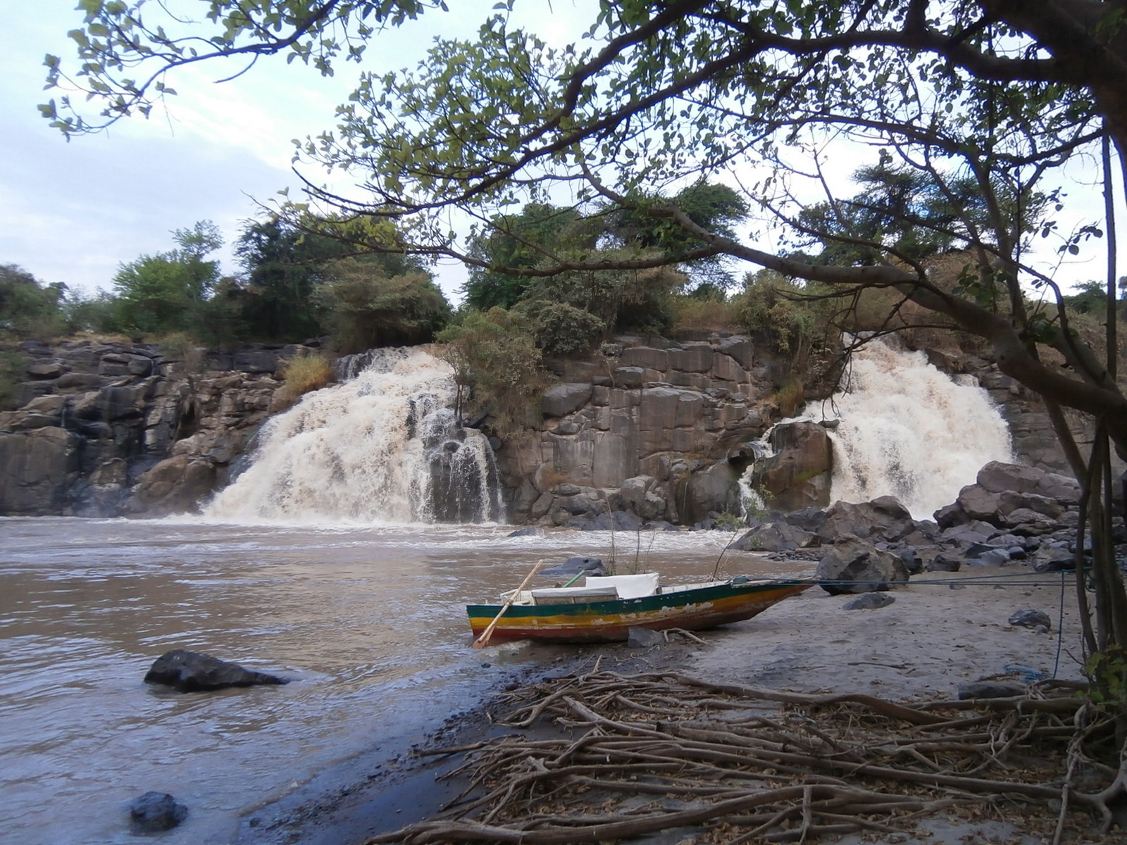 Спустились по ступенькам к реке и оказались рядом с водопадами. Водопад не один, их целых пять! Два в центре, два справа и один слева. Вот так интересно распределился бурный поток реки Аваш в этом месте, где в русле образовался перепад высот, и вода падает с высоты примерно 13 -15 метров. На глаз — чуть повыше Баниаса. Но силища, неуёмность, грандиозность — выше всяких слов! Потрясающее зрелище и особенный, каких больше нет, уголок, где природа проявила  всю свою изобретательность и талант. Добавить к этому, что рядом не было ни души, и только мы были зрителями этого грандиозного спектакля. Было ощущение полного единения с природой: мы, река, водопады, шум падающей воды и старенькая лодочка на берегу, окрашенная в цвета эфиопского флага…Неповторимо и потрясающе хорошо!