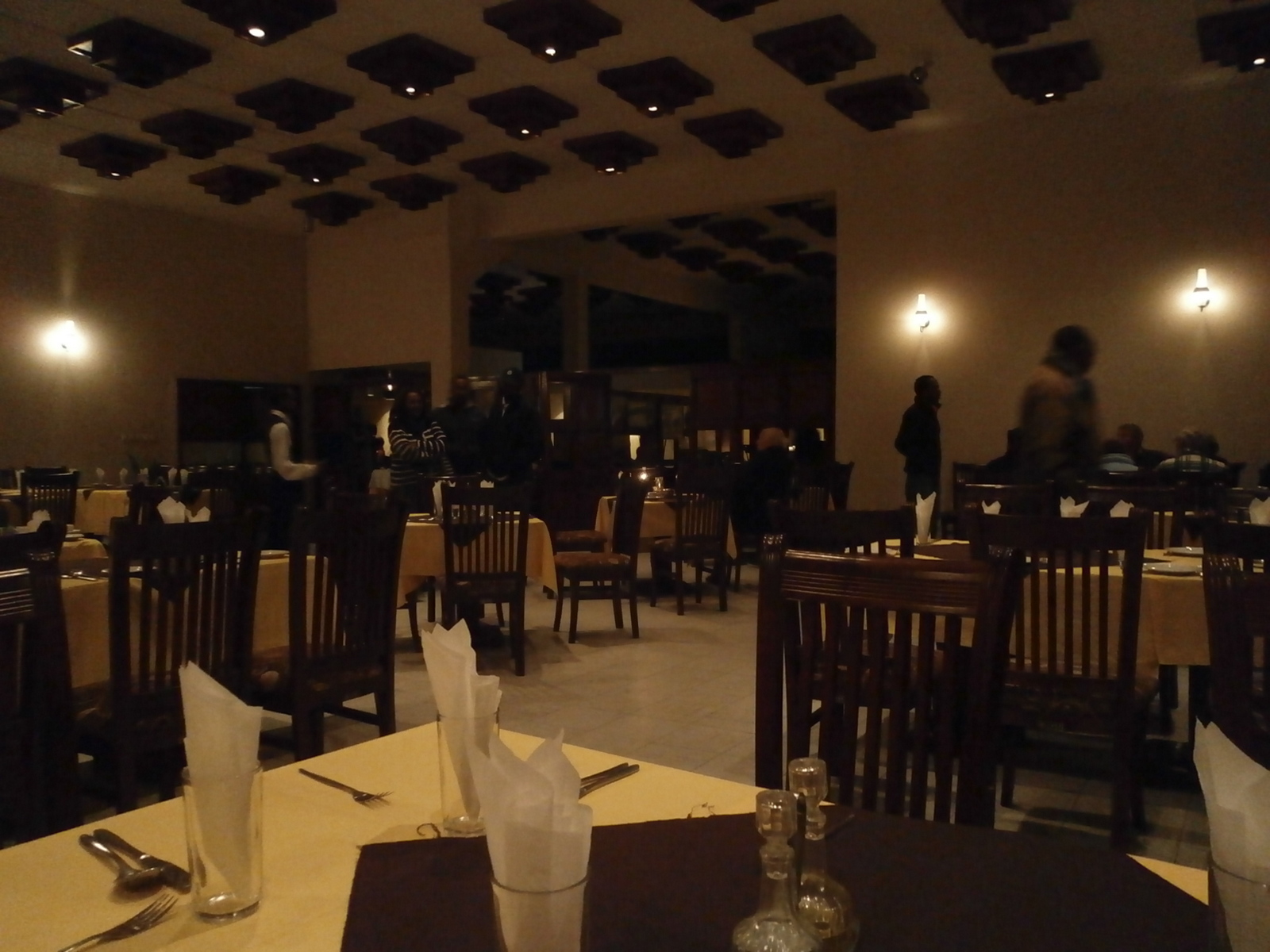 В 18:30 мы приехали в город Goba и поселились в гостинице Goba Wabe Shebelle Hotel. Гостиница находится сразу на въезде в город и расположена в великолепном саду с клумбами, газонами и иллюминацией на деревьях. Вход выглядит с претензией на роскошь. Ресторан вообще смотрится на высоком уровне: потолки, столы, стулья, салфетки, скатерти — всё с иголочки.
