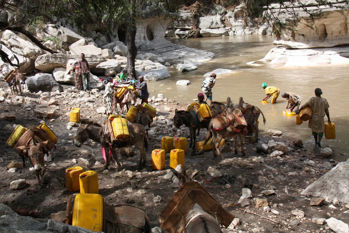 Местные стирают в речке, набирают воду в большие канистры и поднимают их на осликах вверх в деревню.