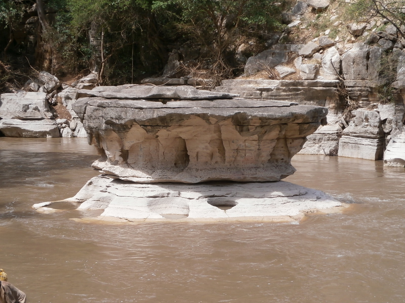 Прямо посреди реки возвышается затейливая резная скала из известняка — красиво!
