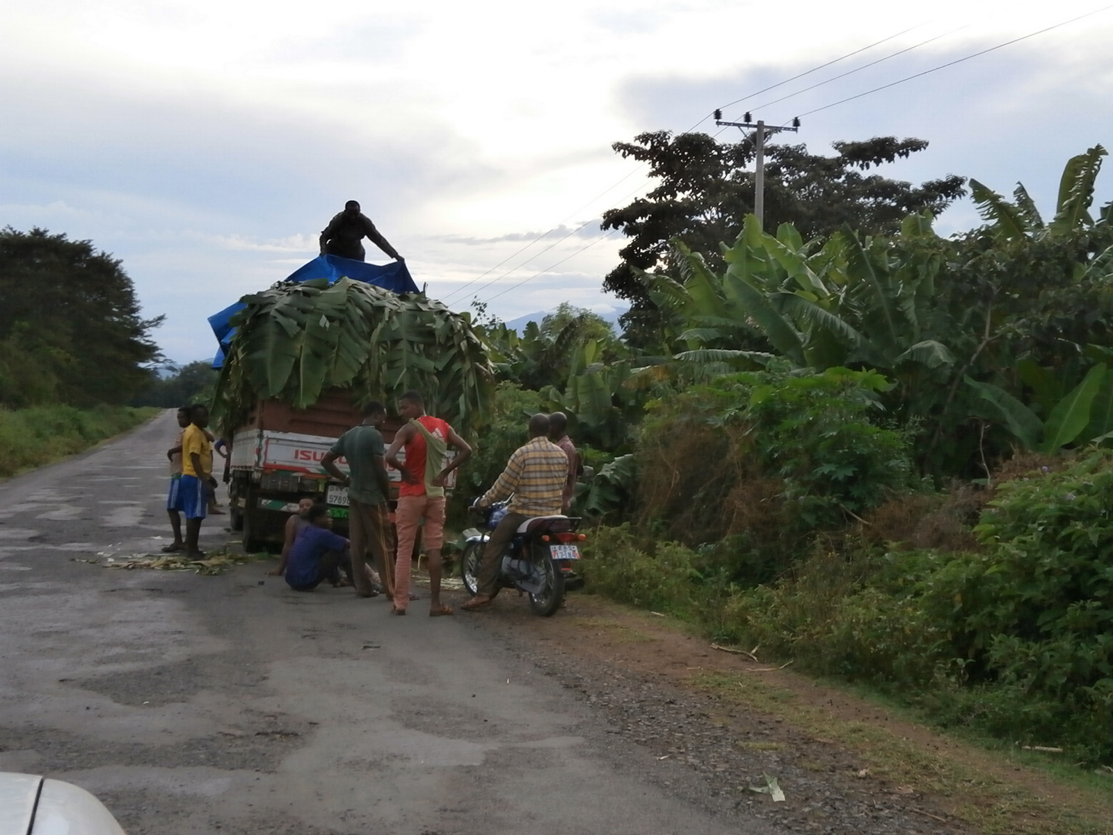 После Содо появились нескончаемые плантации бананов. Девушки продают бананы у дороги, держа их на подносах. Кругом одни бананы. Попадаются огромные грузовики, гружённые бананами — bananacar.