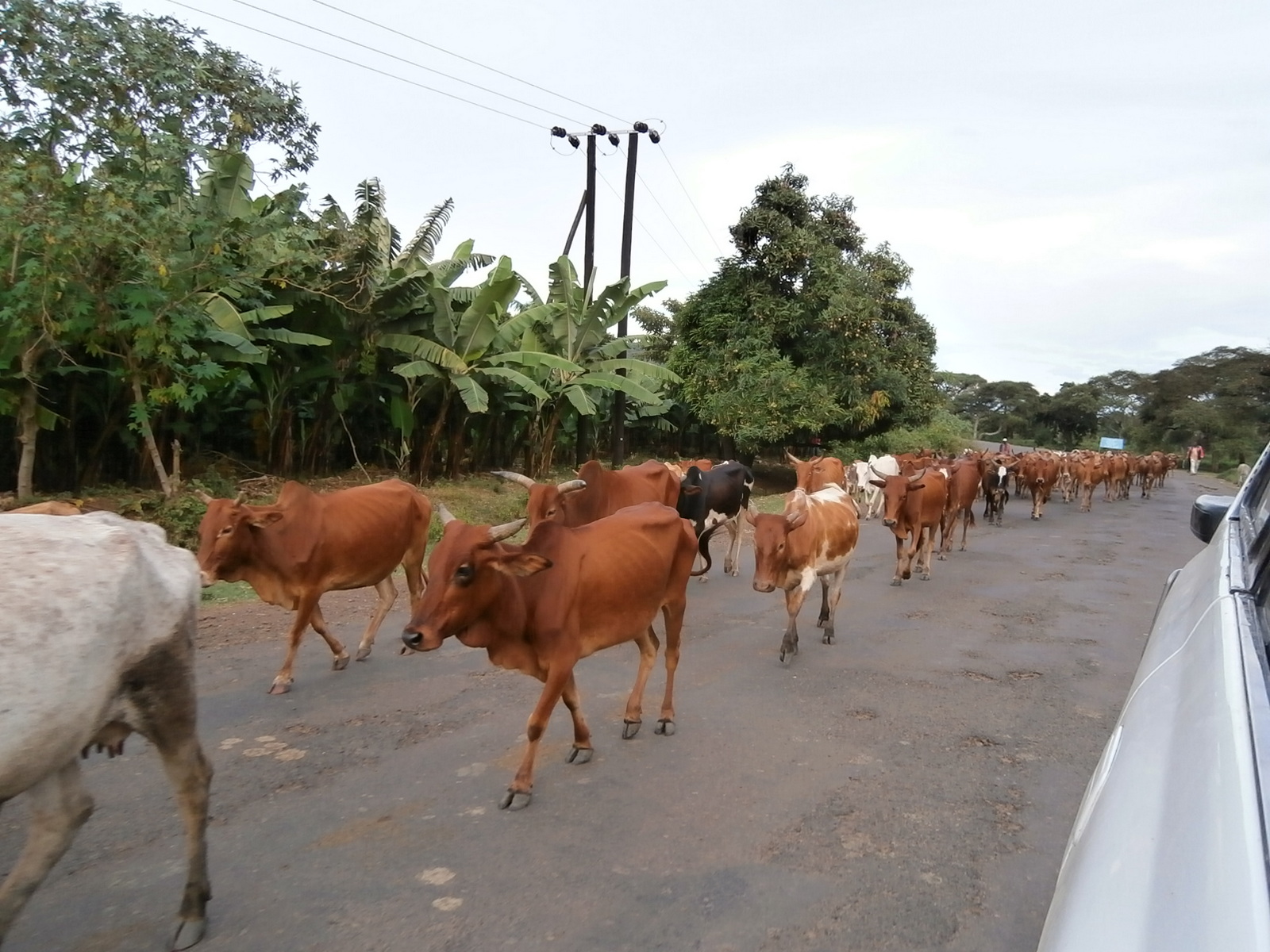 Сначала путь достаточно однообразен. Людей на дорогах немного, смотреть особо не на кого, и только лишь появление стада коров прямо перед машиной вызывает у нас оживление.