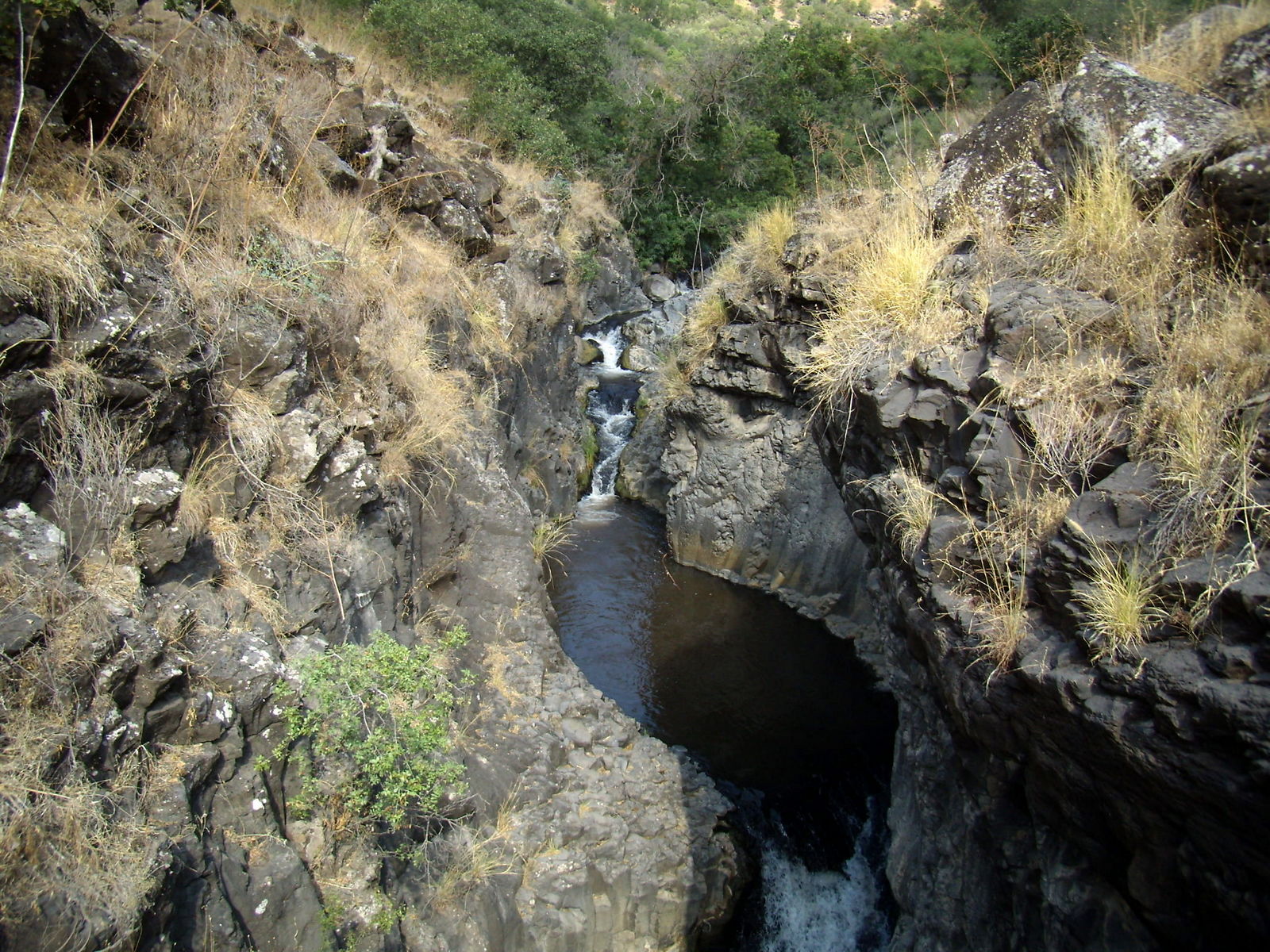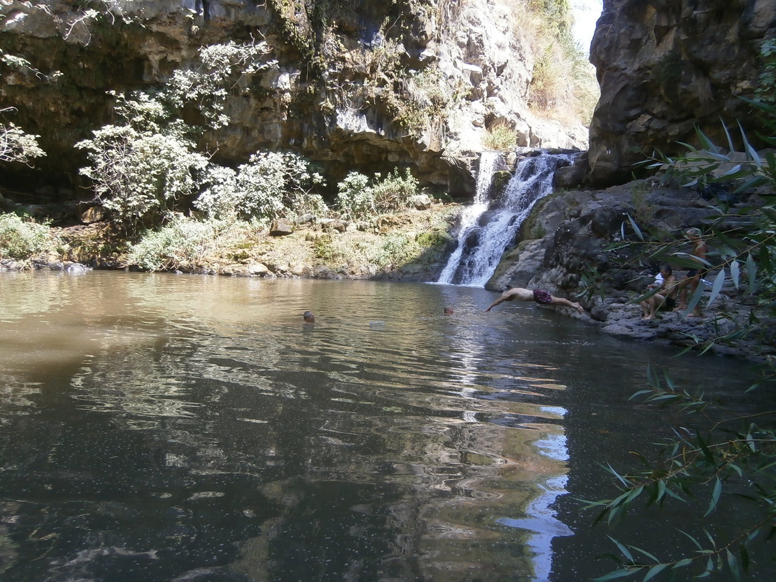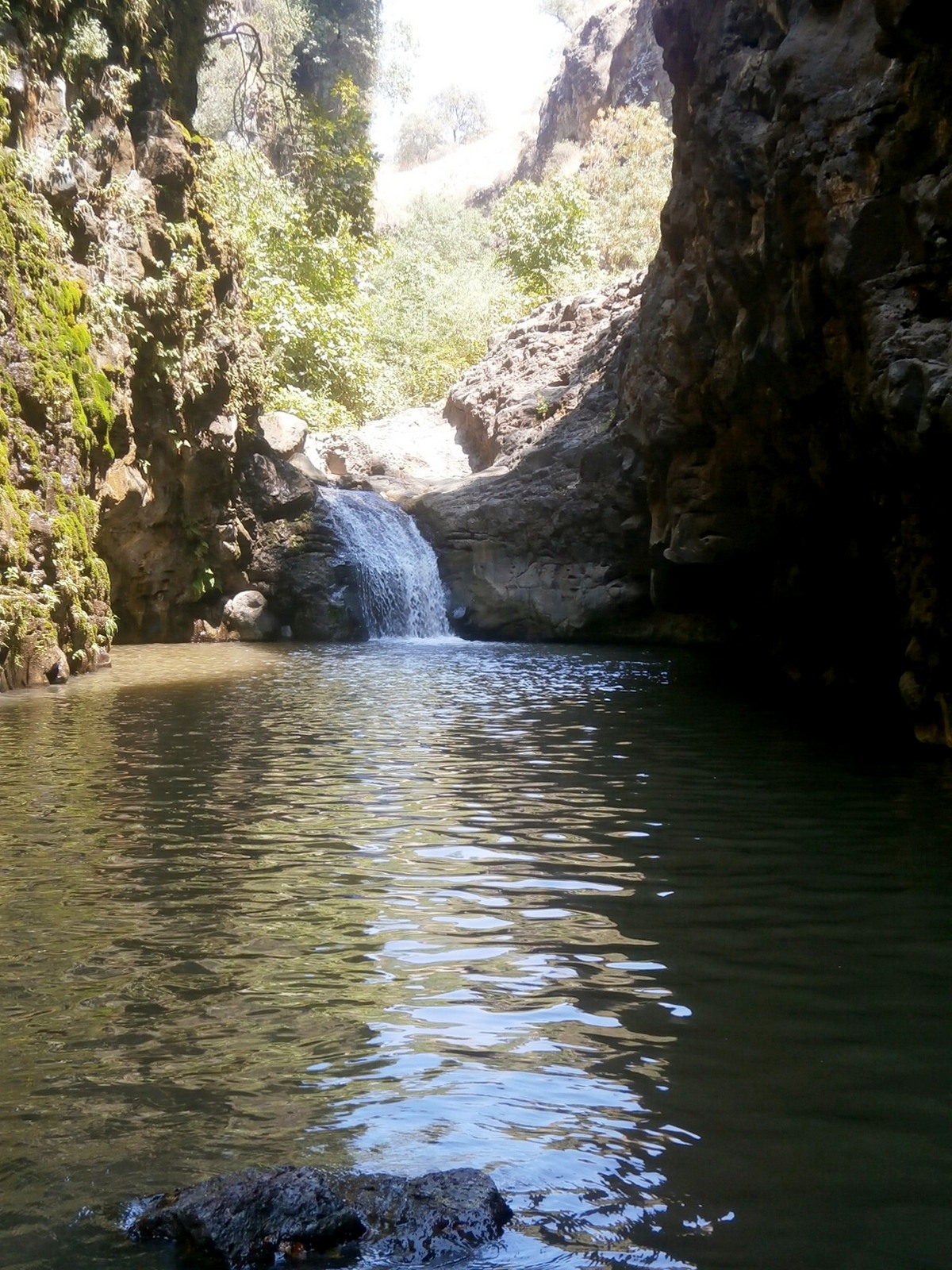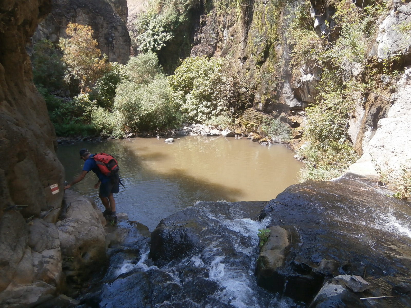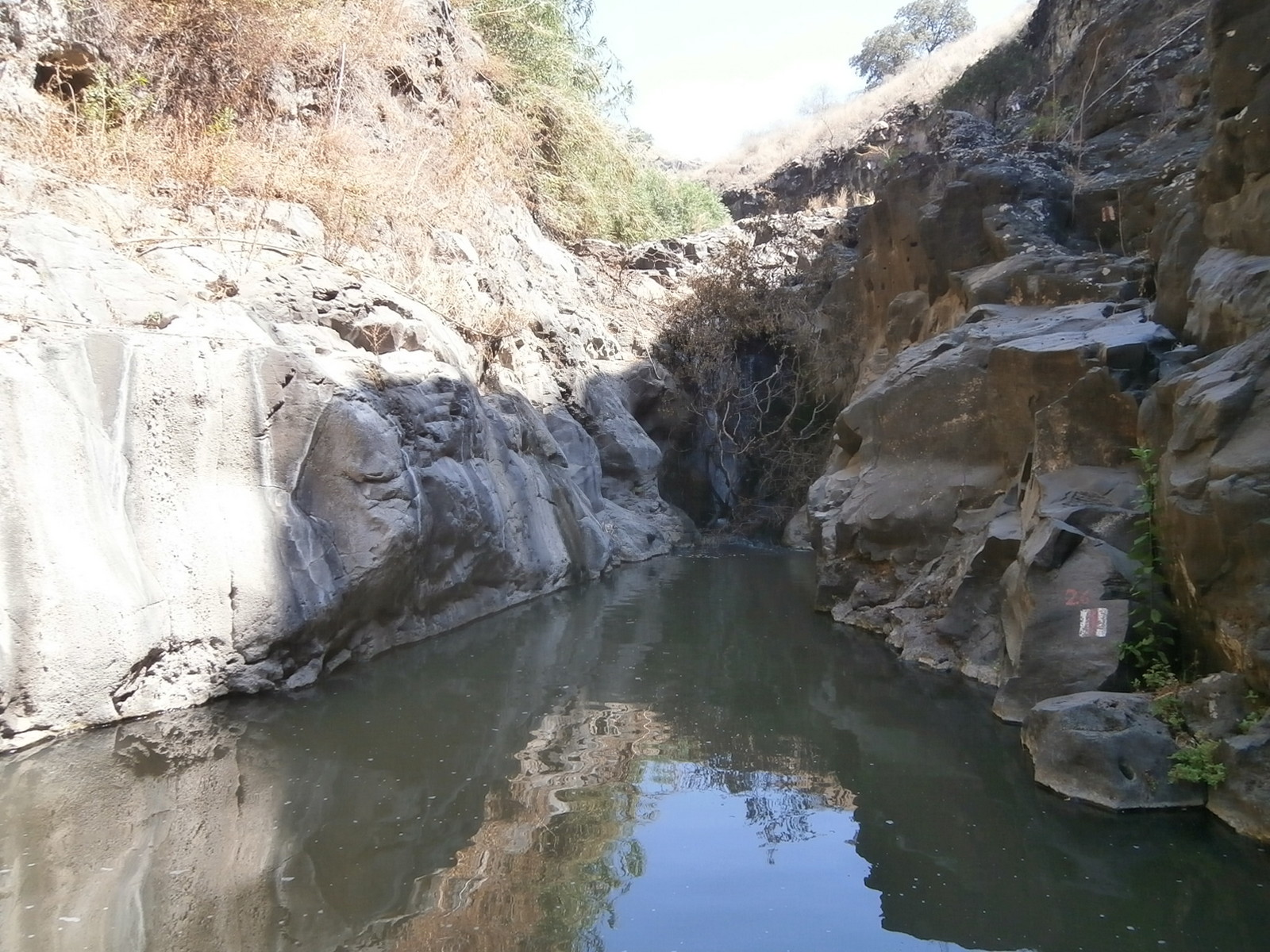 Мы знали, что на расстоянии примерно полутора километров вверх по течению от слияния с Завитаном находится брехат Мешушим — озерцо с водопадом. Но там — пакахим, и нам туда не надо!Но вот наконец мы нашли подходящее место, стали спускаться вниз по очень крутому склону и вдруг совсем рядом услышали голоса. Неужели ещё кто-то идёт в нахаль, как и мы, нелегально?!