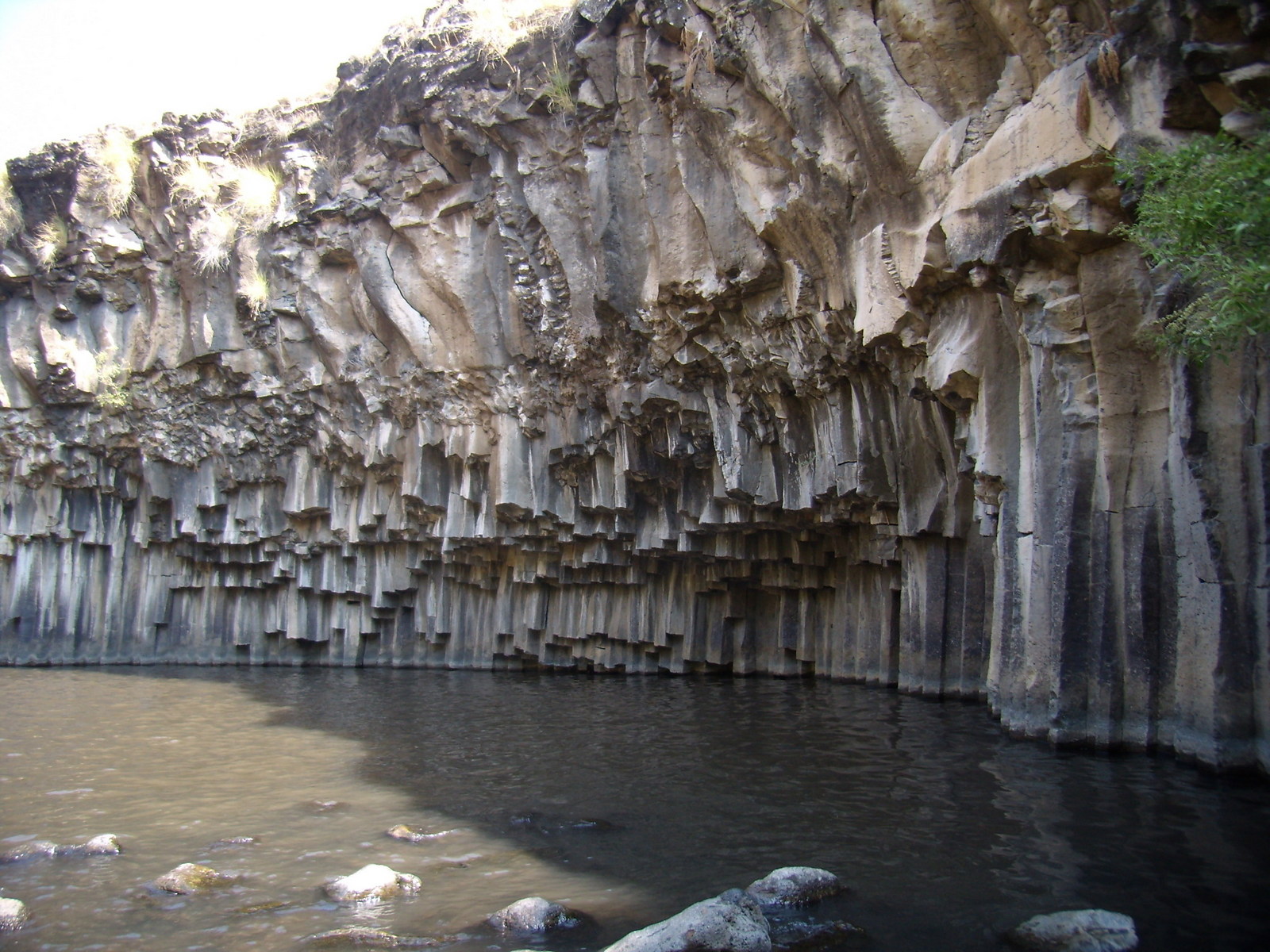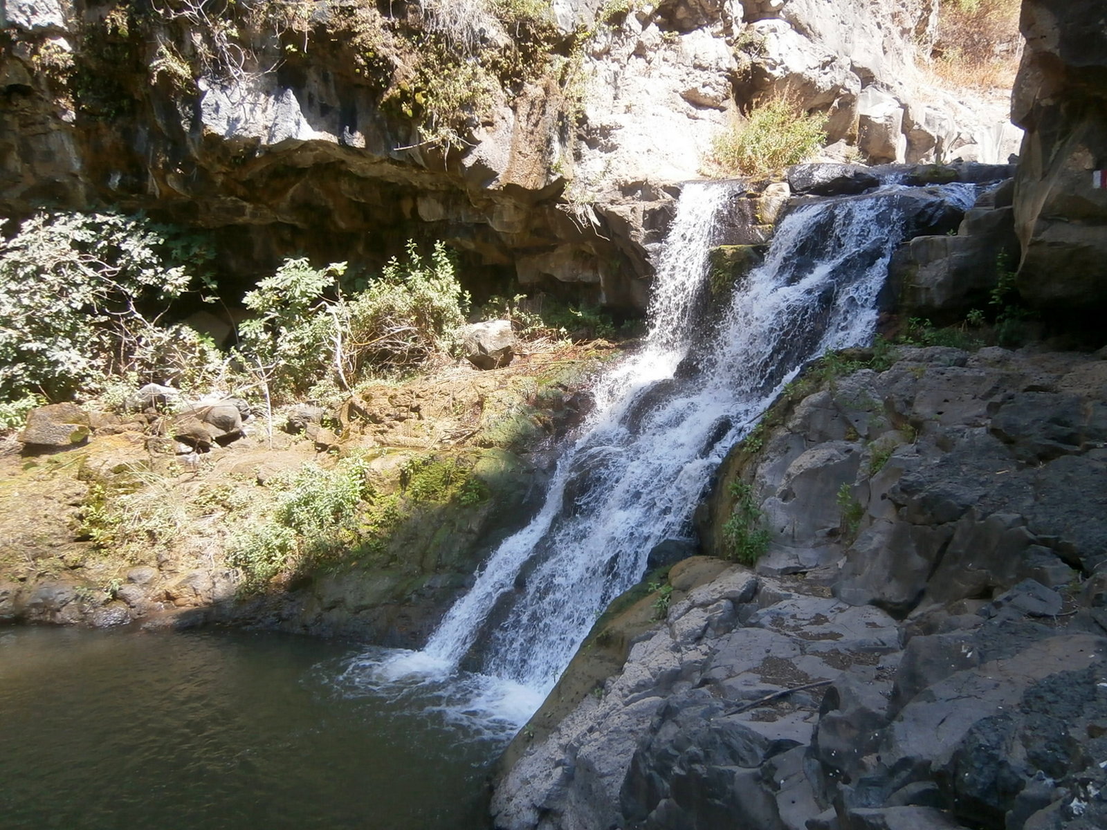 Высота водопада метров 10-12, поток воды совсем небольшой, но журчит вода громко и ласкает слух. Те, кто бывали здесь раньше, сказали, что так мало воды они ещё не видели. Сказывается то, что уже конец лета, да и зима предыдущая была малодождливая. Но всё равно, место это очаровательное. Под водопадом — большой и глубокий бассейн. Вода чистейшая. Тишина. Людей, кроме нас, нет. Правда, вскоре подошли 3 парня, что было совсем необычно.