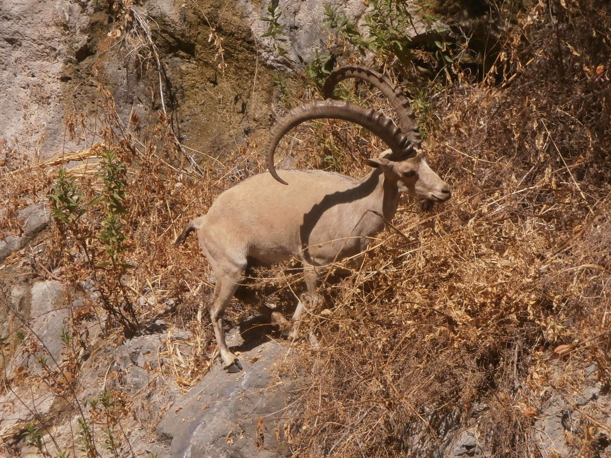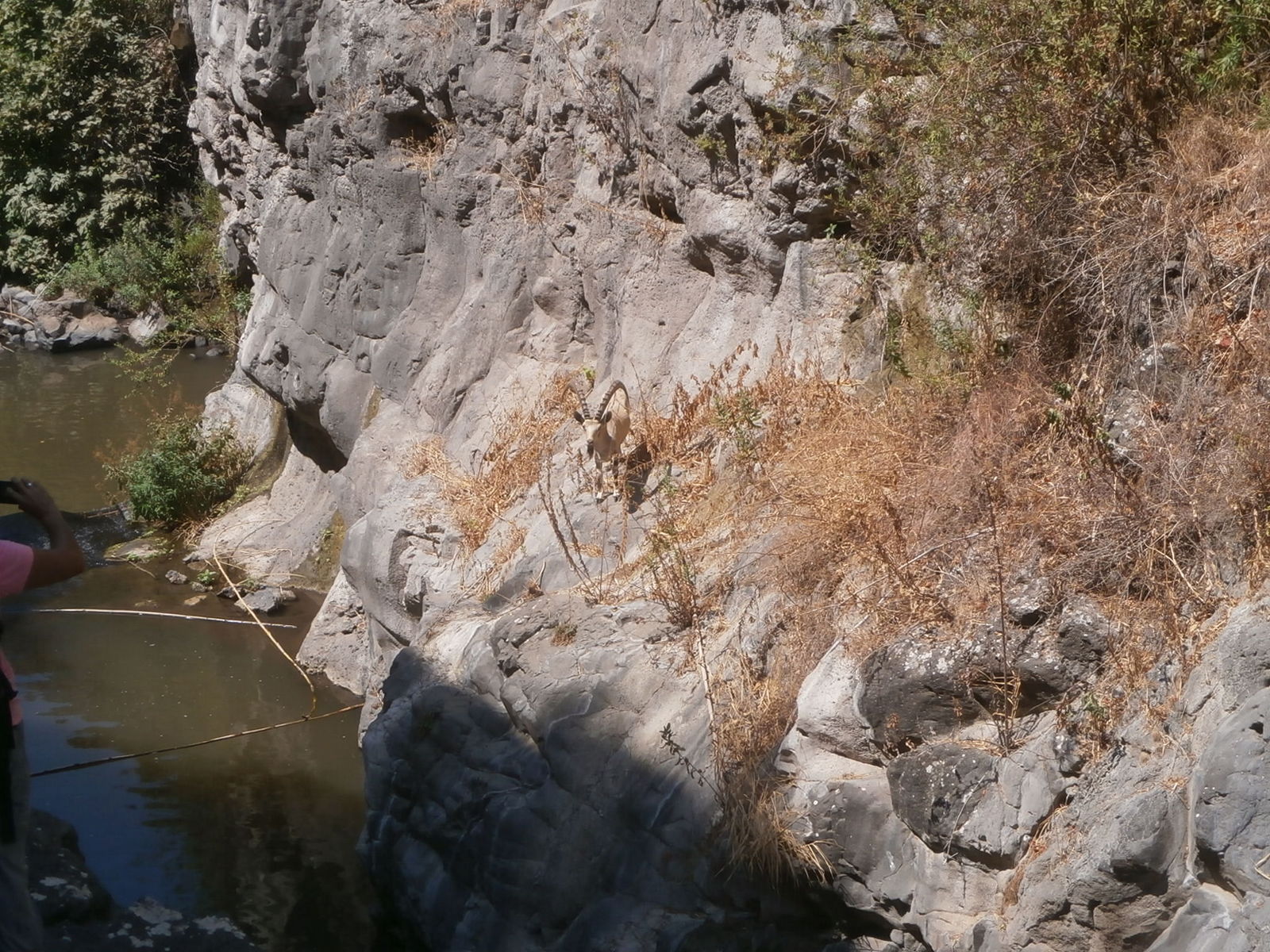 Вскоре мы подошли к самому красивому месту на нахале — брехе Ган Эден. И тут нас ждал настоящий сюрприз. Мы увидели горного козла ( NUBIAN IBEX), на иврите — яэль. Это был самец с большими и красивыми рогами, которые продолжают расти у него на протяжении всей жизни.