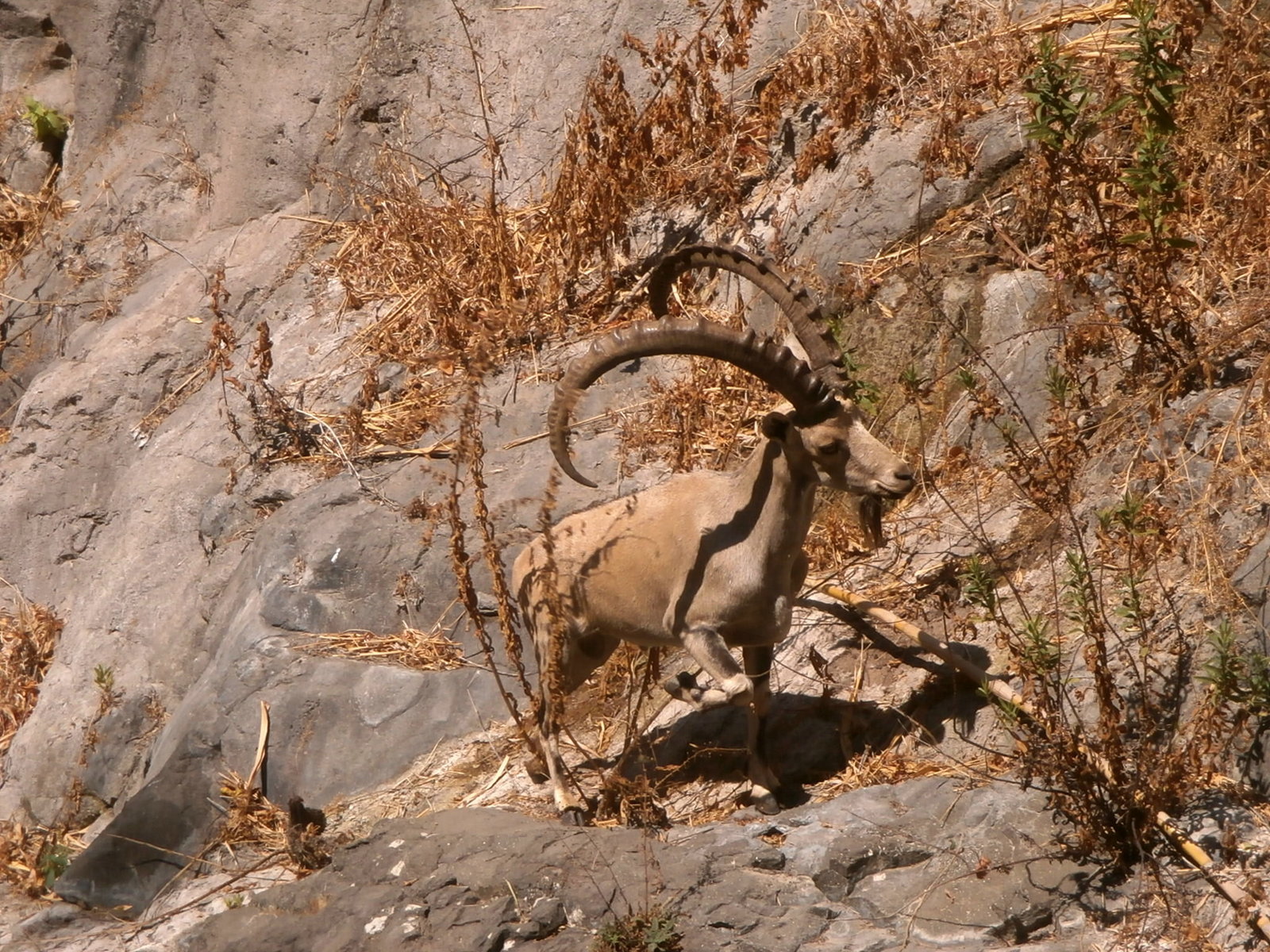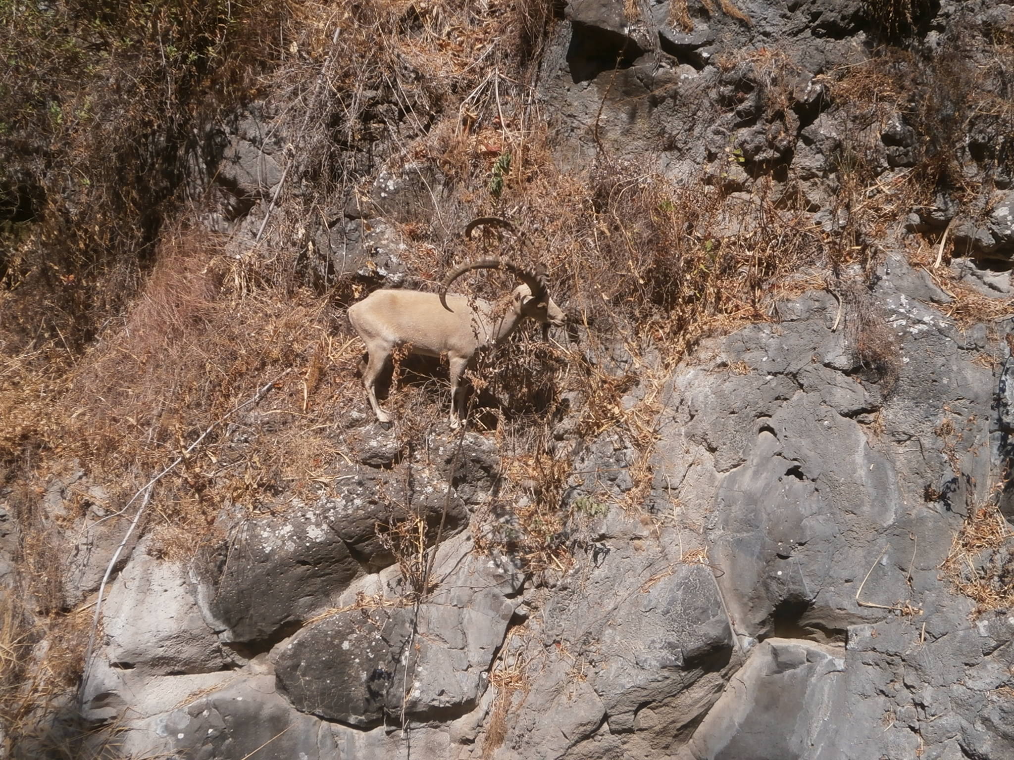 Это животное водится в Иудейской пустыне и в пустыне Негев, а на юге Голанских высот горных козлов очень и очень мало, и лишь отдельные особи, завезённые сюда в 70-х годах, обитают здесь. Поэтому, увидеть такого козла, да ещё и так близко, — было большой удачей. Было ясно, что мы ему помешали и очень его испугали, нагло вторгнувшись в его размеренную жизнь на лоне природы. Он же привык, что людей здесь нет. А тут вдруг мы нагрянули… Для него, видимо, это был огромный стресс. К сожалению, мы застали горного козлика, стоящим на отвесной скале, и у него не было возможности убежать от нас быстро. Поэтому и удалось рассмотреть его досконально. Он стоял и «вычислял» безопасный маршрут, «продумывал» каждый свой шаг. Одно неверное движение, и он упадёт. Рядом шумел водопад, внизу была глубокая бреха. Мы боялись, что козёл сорвётся. Но вот он решился. Благополучно сделал траверс вдоль скалы, грациозно перепрыгнул через ручей и убежал восвояси…